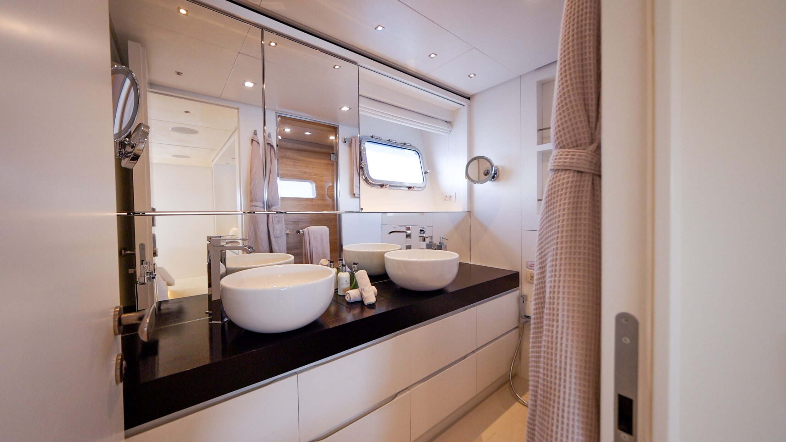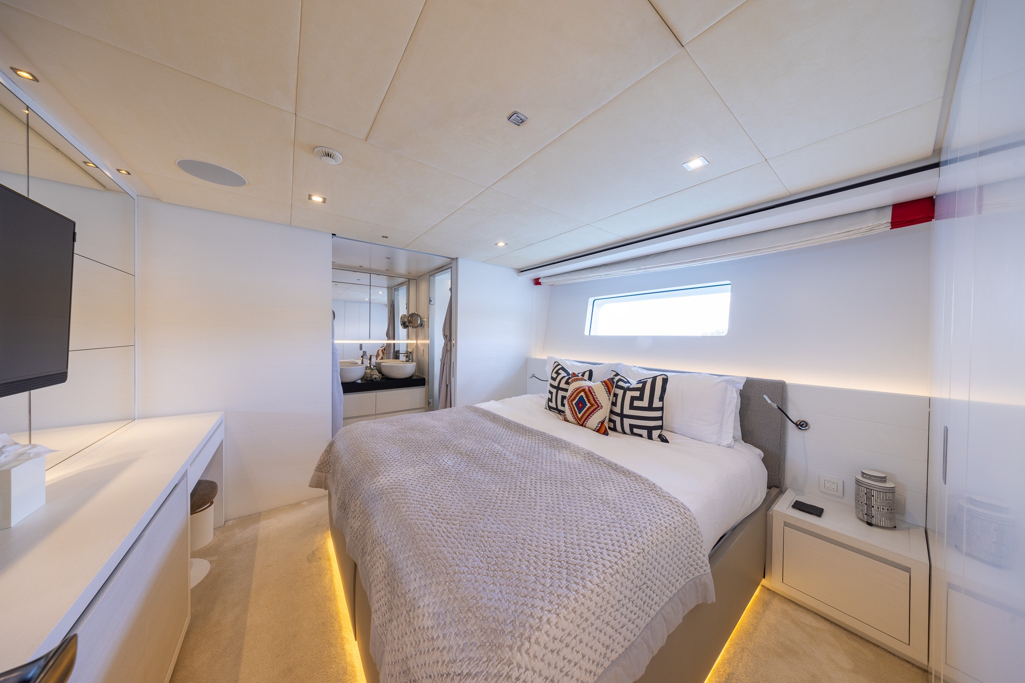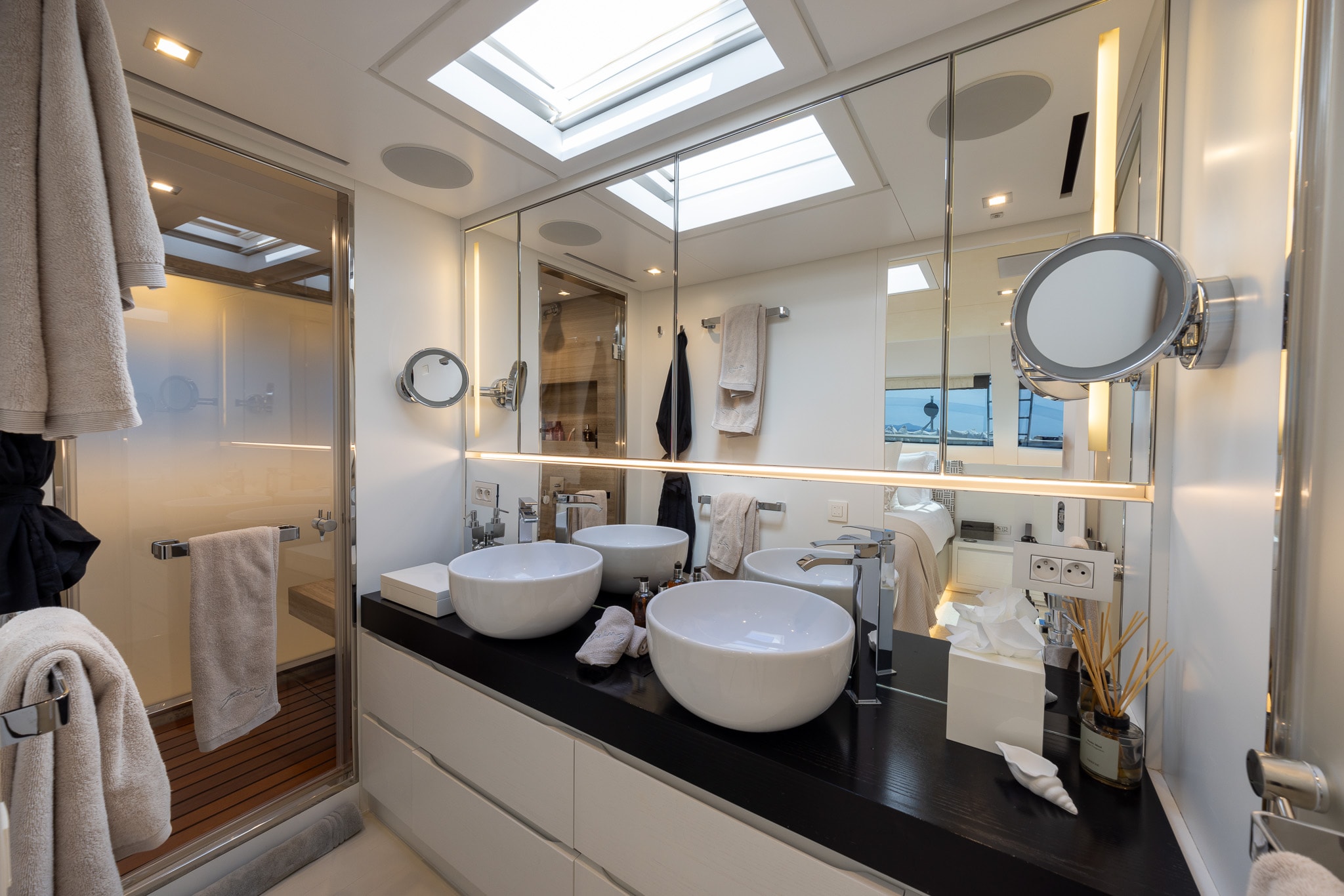 The generous master suite is a private haven placed forward on the main deck. A walk-in wardrobe is in the entryway to the suite, while the deluxe ensuite is aft and the bedroom forward. A seating area and views on three sides adds to the suite’s appeal. The lower deck features a full beam VIP and two doubles amidships while the crew quarters are forward. All the suites benefit from the luxury and privacy of ensuite bathroom facilities.