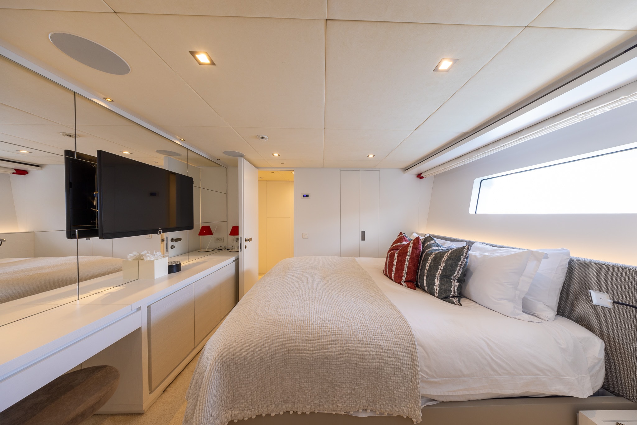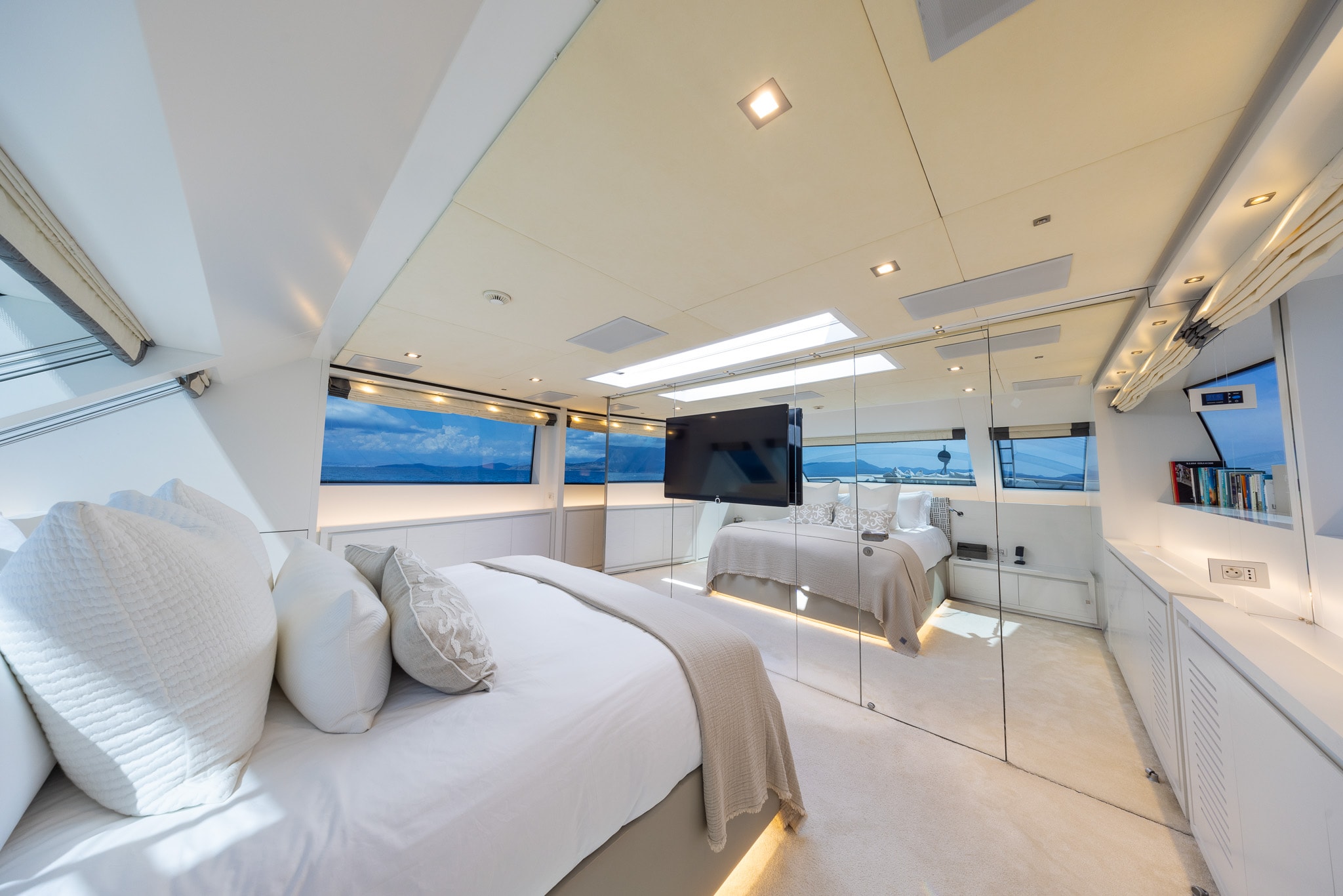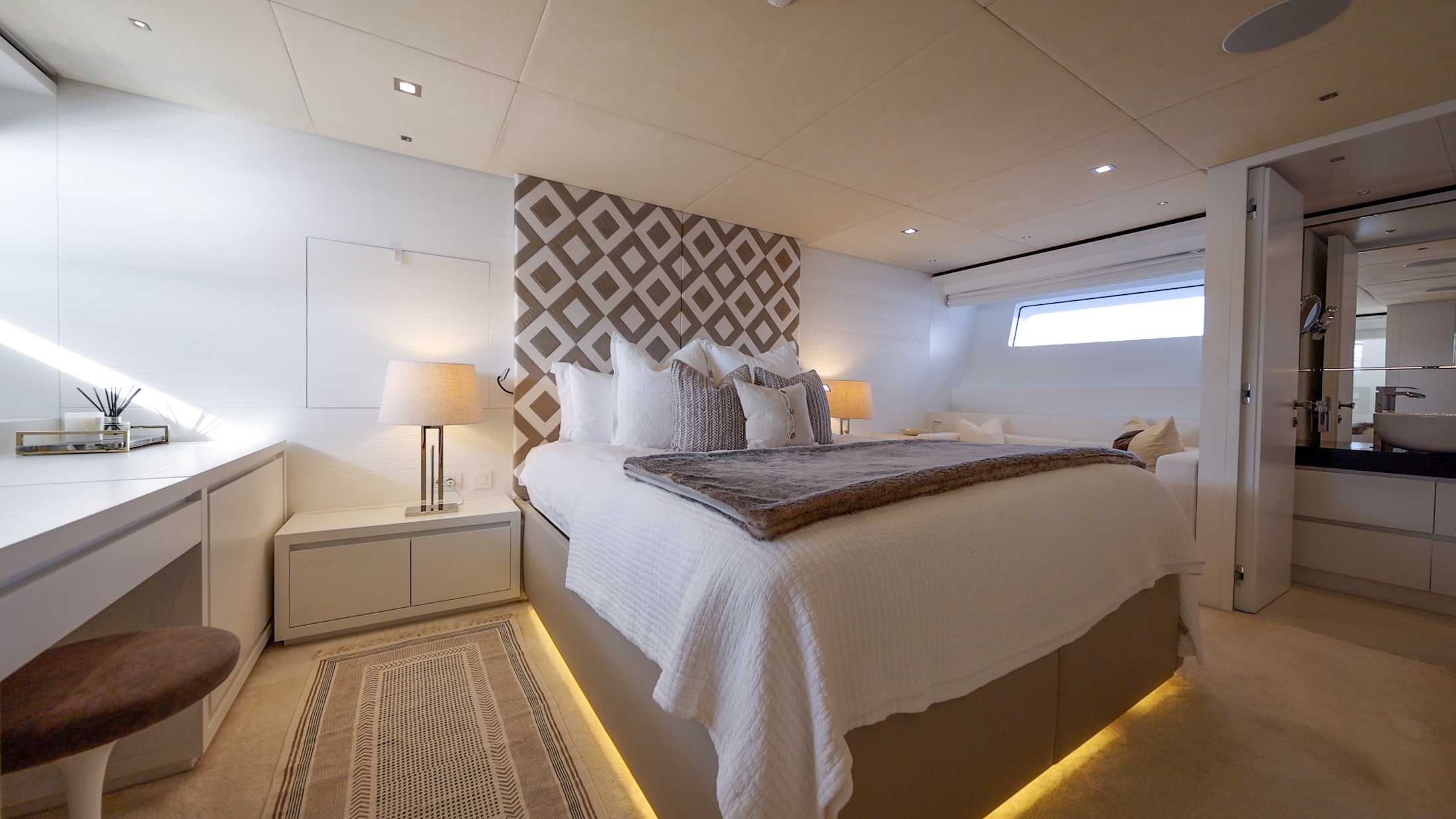 The generous master suite is a private haven placed forward on the main deck. A walk-in wardrobe is in the entryway to the suite, while the deluxe ensuite is aft and the bedroom forward. A seating area and views on three sides adds to the suite’s appeal. The lower deck features a full beam VIP and two doubles amidships while the crew quarters are forward. All the suites benefit from the luxury and privacy of ensuite bathroom facilities.
