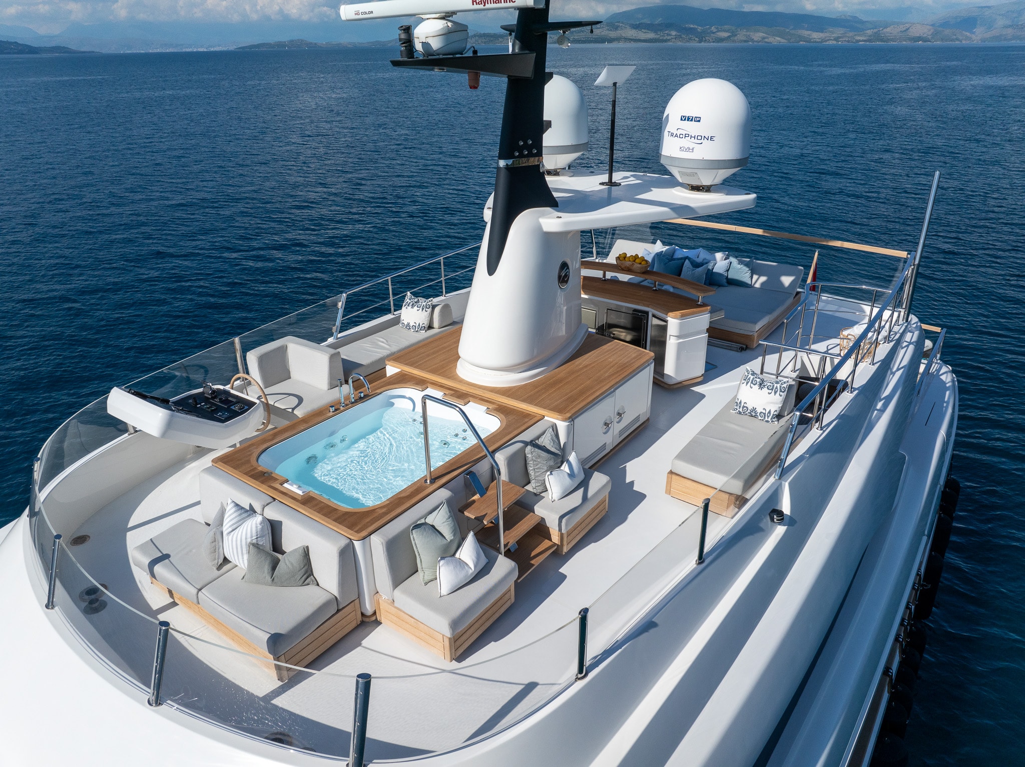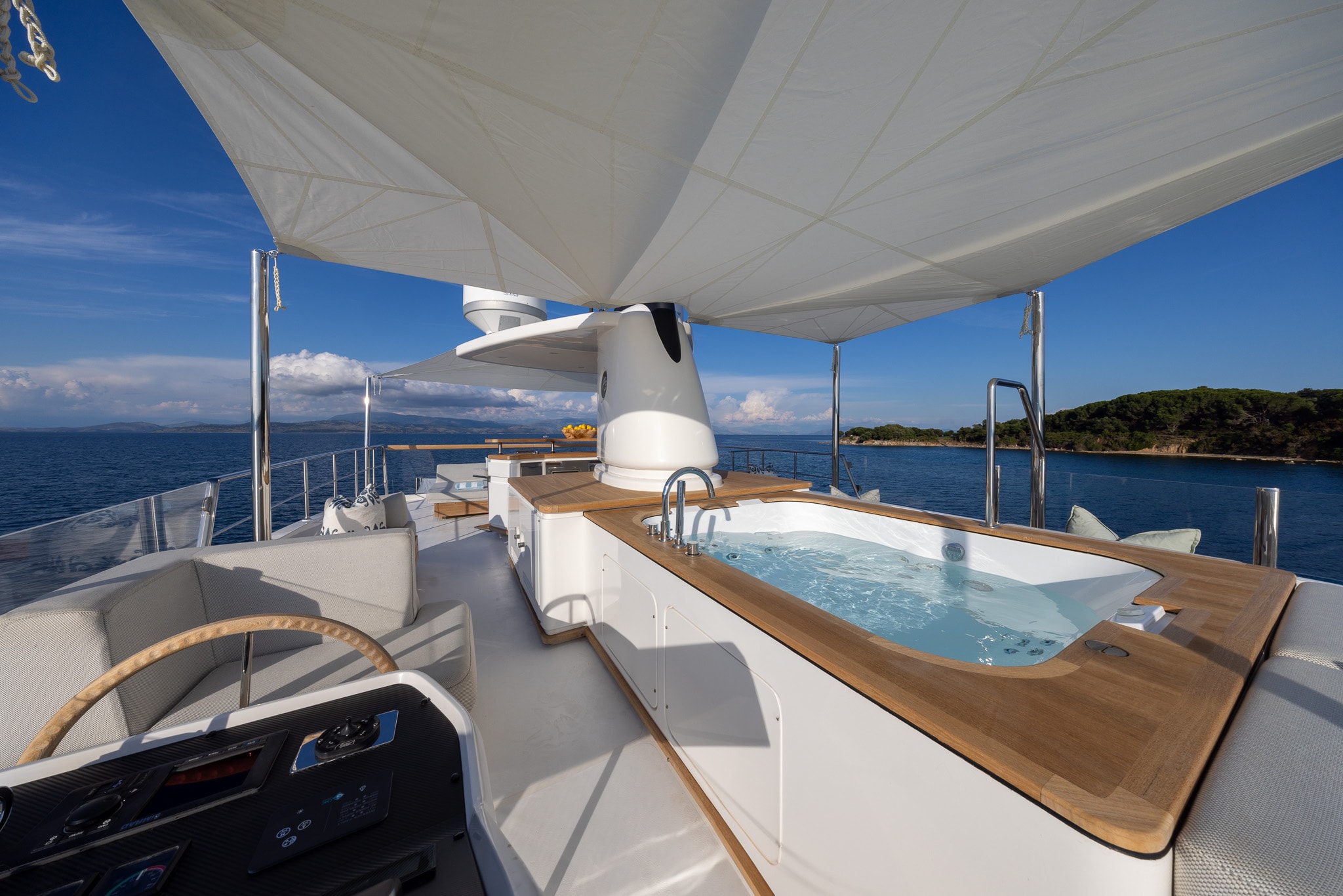 Three exterior deck levels offer guests loads of space to enjoy the al fresco lifestyle. On the sun deck there is an aft row of sun pads with adjustable headrests, an amidships sit up bar and forward jacuzzi surrounded by sofas. While the deck is open, soft bimini shades can be raised to shelter both areas.