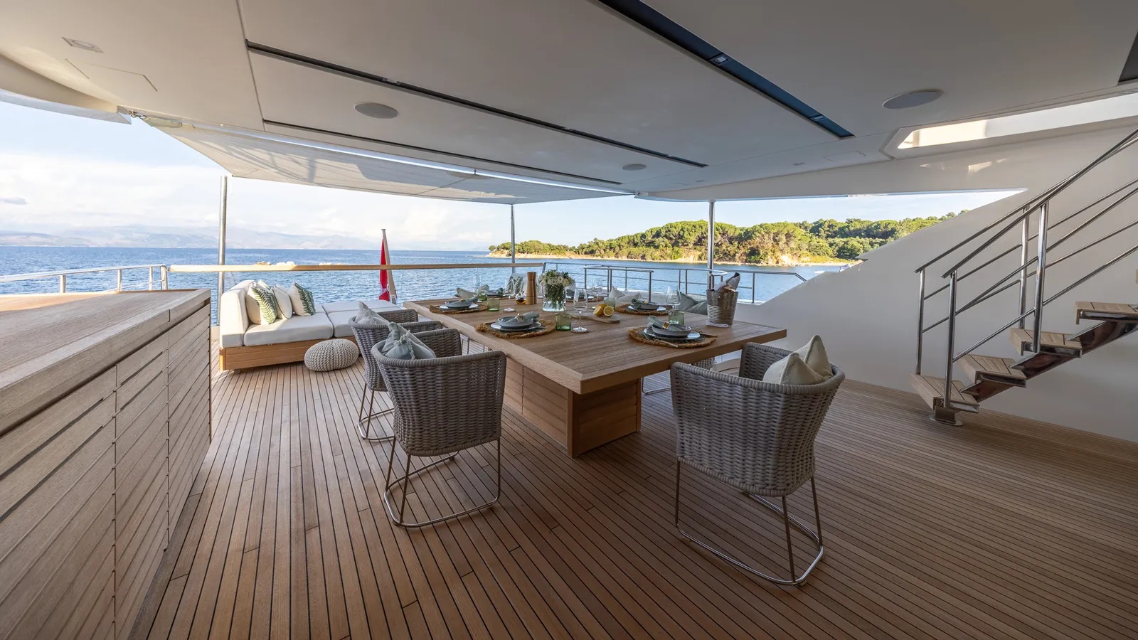 The upper deck aft is dedicated to dining al fresco with a beautiful wooden table sheltered under the sun deck overhang. Aft are two modular sofa/day beds perfect for relaxing after lunch or dinner, which can be shaded by a soft bimini.