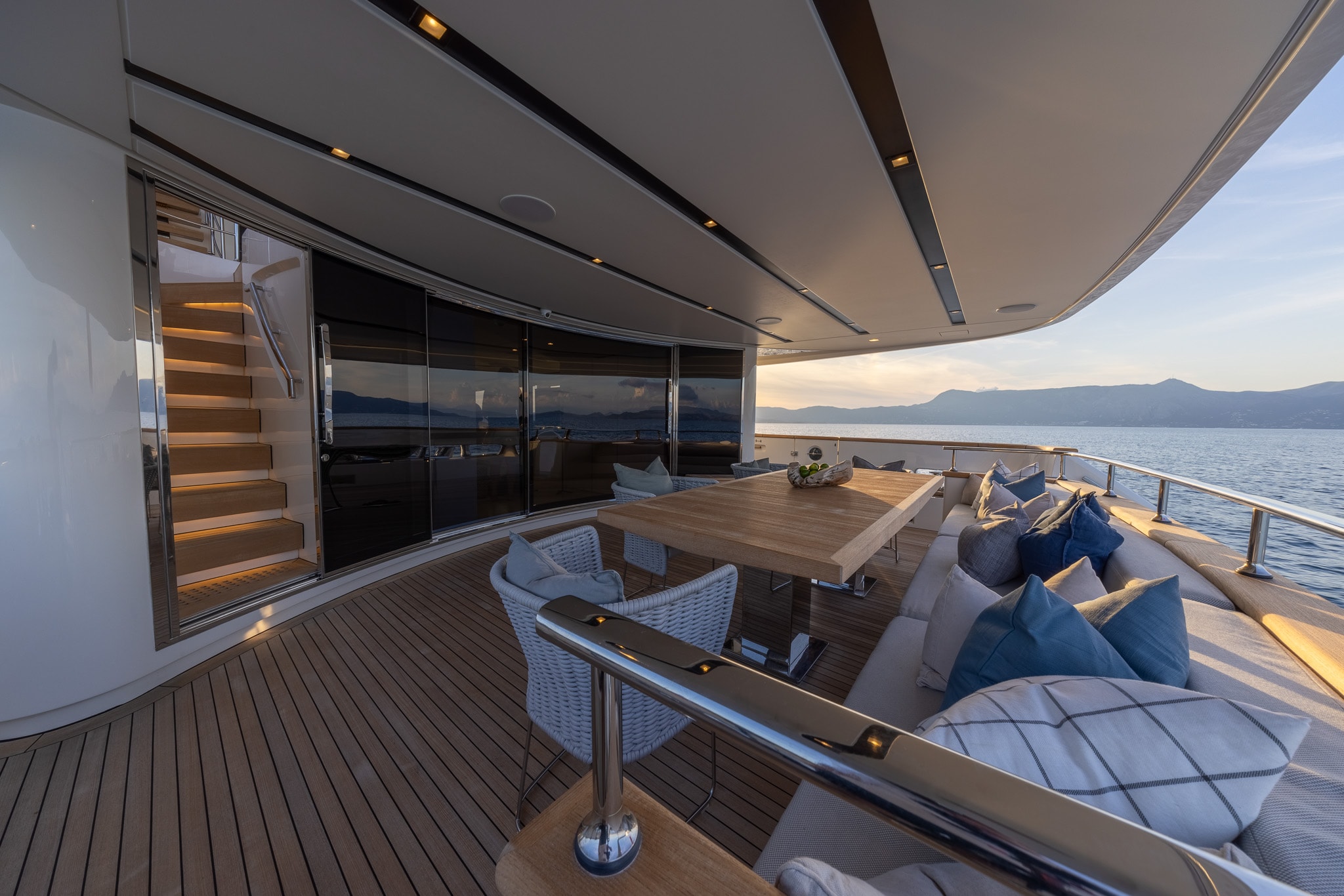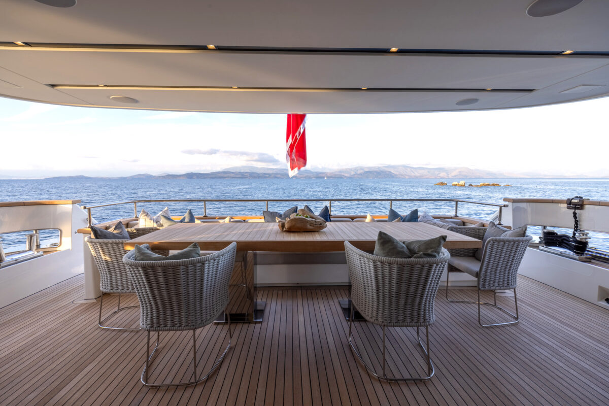 Al fresco dining is also available on the main deck aft where a bench sofa and moveable chairs surround a large table. Steps on either side lead down to the swim platform which can be extended by a floating platform which can host the water toys.