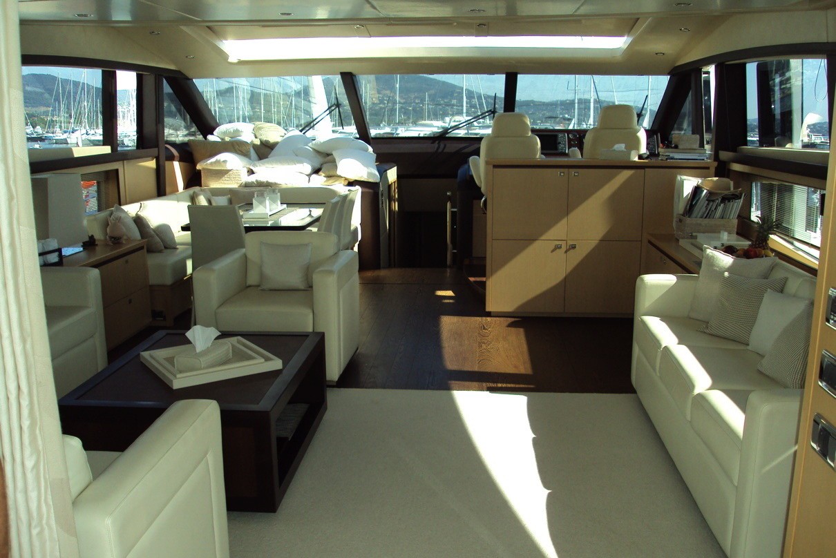 Motor yacht BAGGIO has an enclosed main deck featuring a saloon and dinette which shares the open-air flexibility of the sliding hard top with the twin helm position to starboard. The saloon offers comfortable seating on stylish leather covered sofa with the latest entertainment systems at hand, while the forward dinette doubles as an additional seating area for guests while underway.