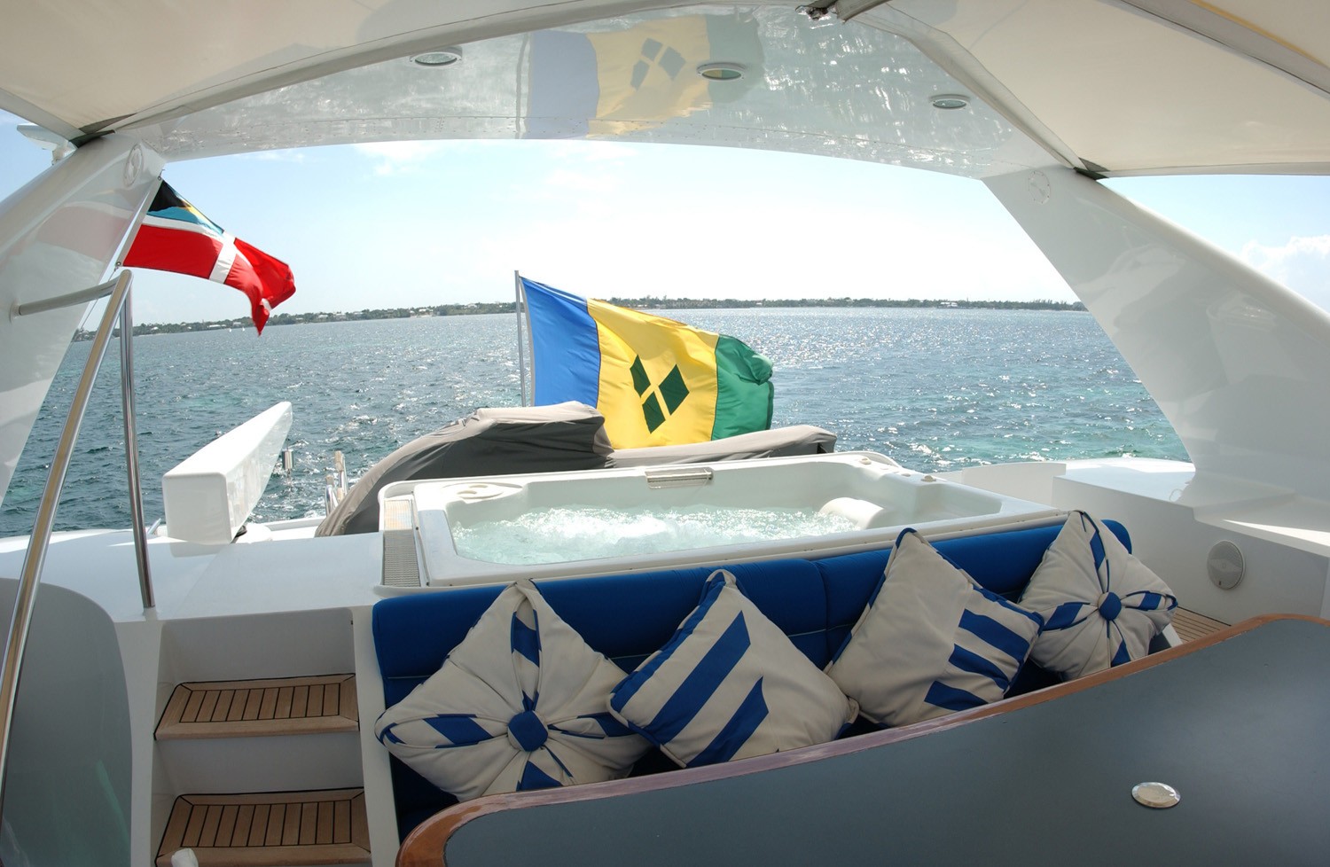 On the superyacht's flybridge is storage for the Novurania tender and Yamaha wave runner and just forward is the large Spa Pool tub.
