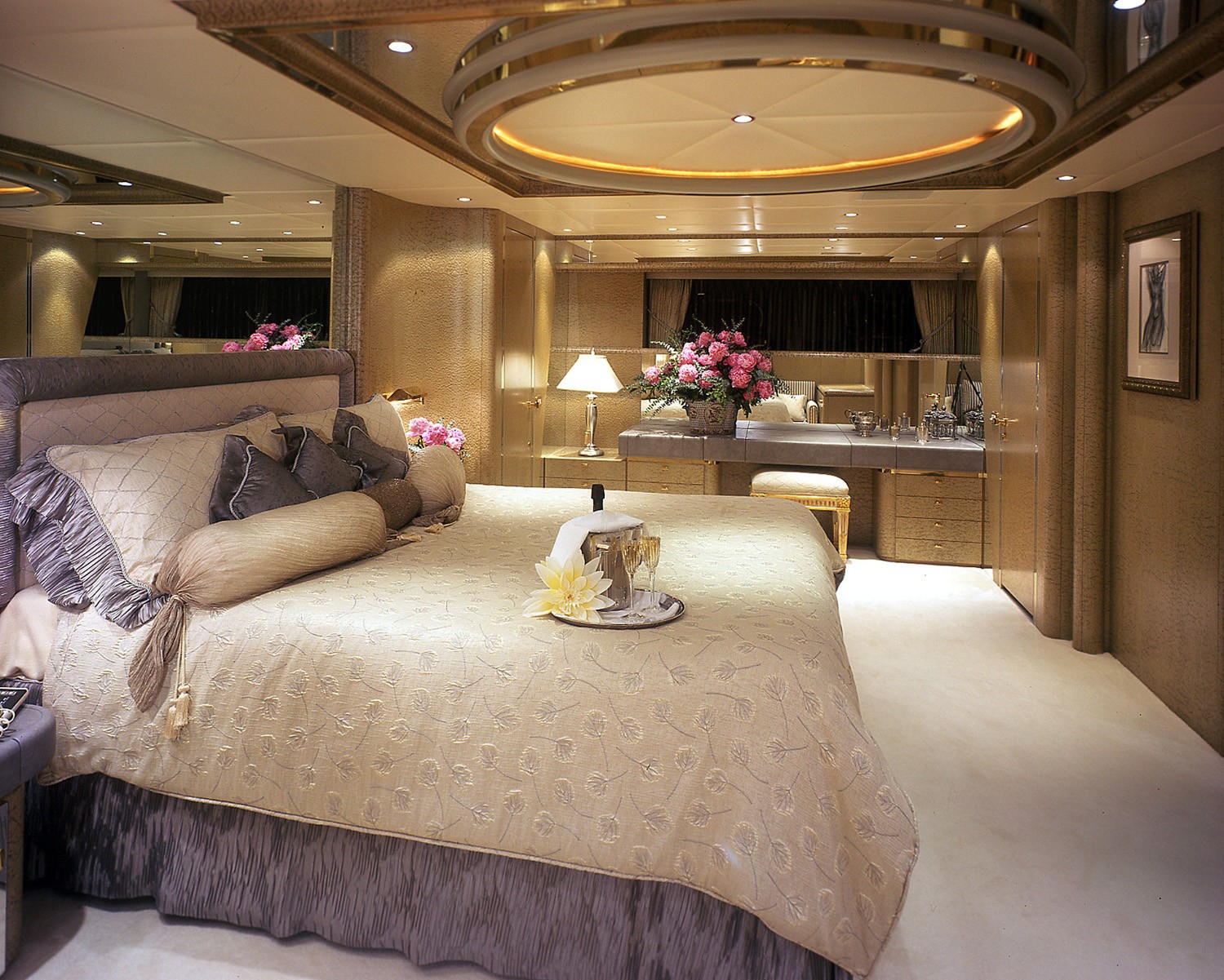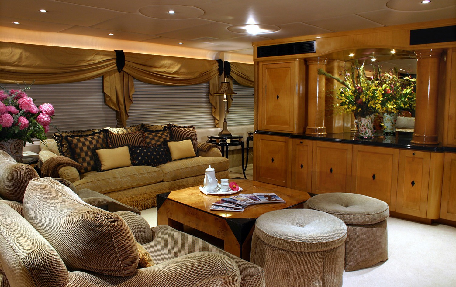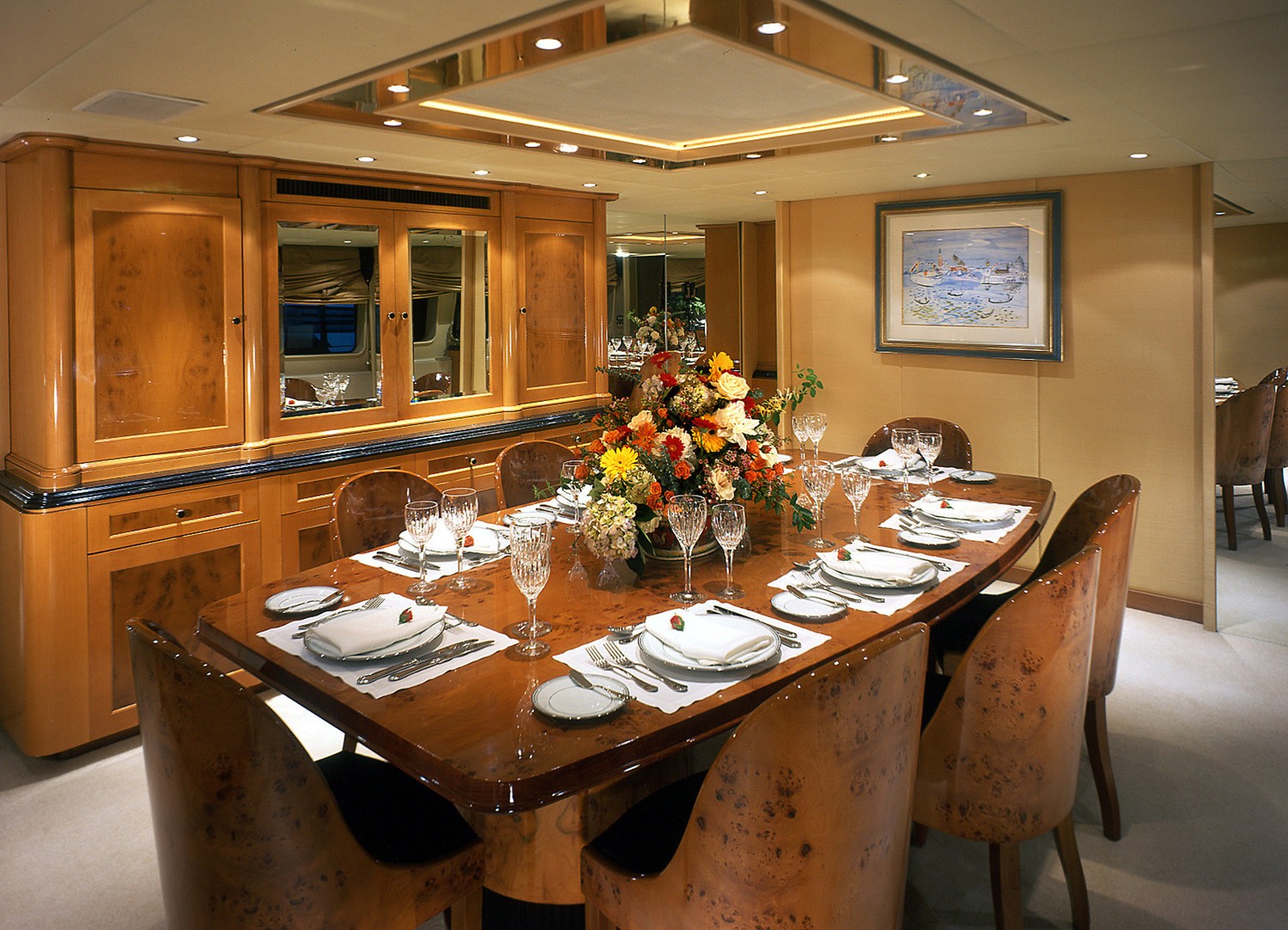 CAPRICE's formal dining salon has a full width galley located completely forward directly above the crew quarters, providing good division between the owner's party and the crew.