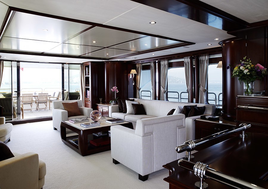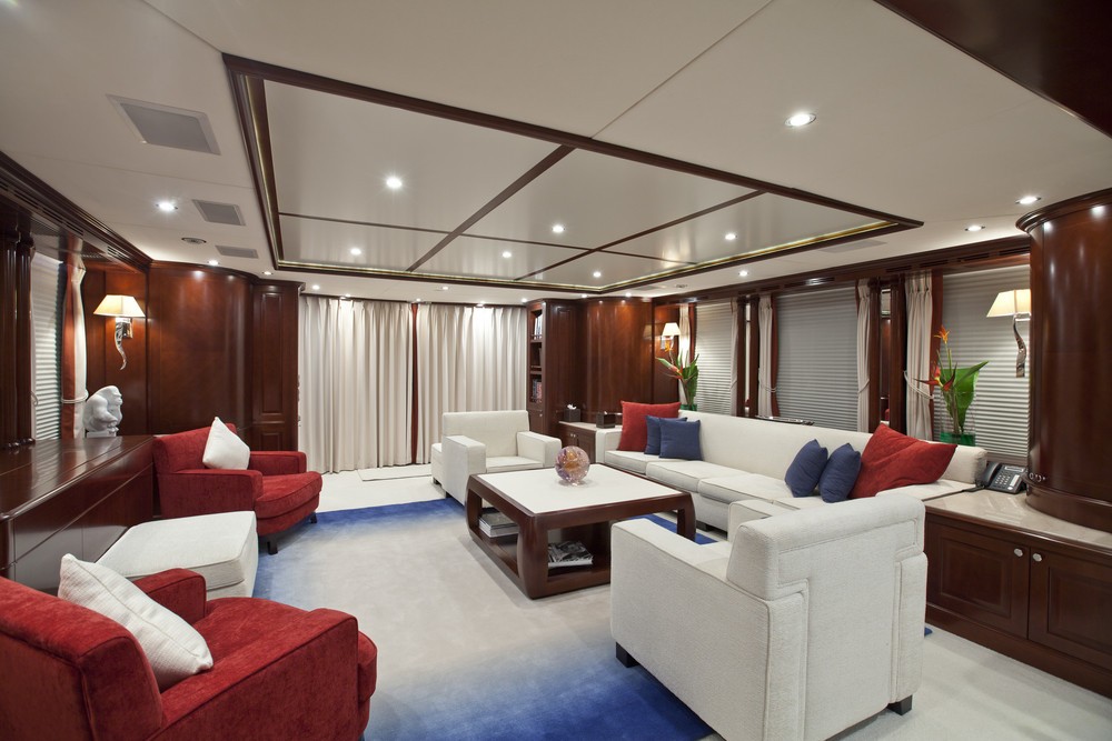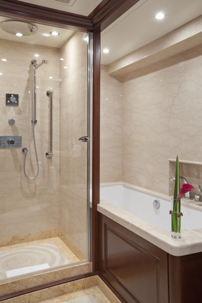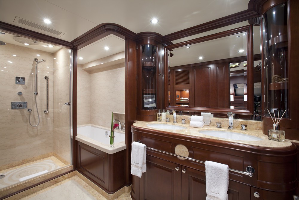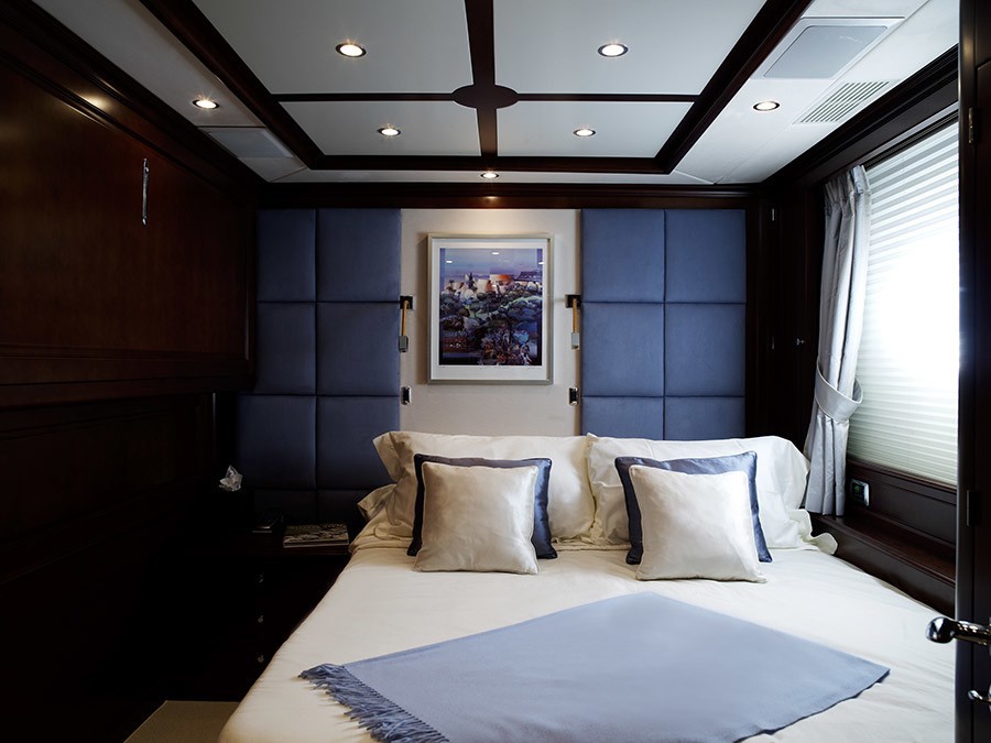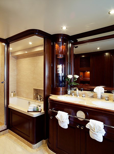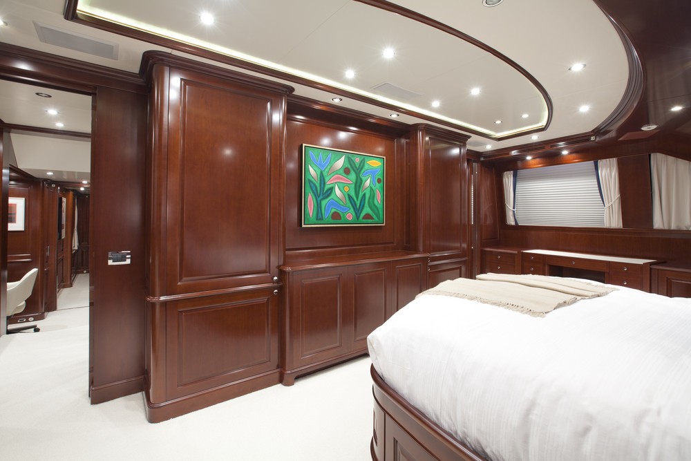 The Master stateroom is situated forward on the main deck. She has a private office and a large bathroom with bath and shower.
