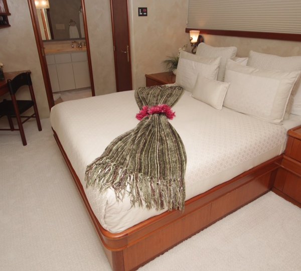 Luxury Motor yacht EL JEFE can accommodate up to 10 guests in 4 cabins. The master stateroom located forward on the Main Deck has a Queen bed and a State of the art body spray shower. The two VIP Queens staterooms located Aft, pictured below; also have a Body spray shower and built in cedar lined closets. The final Cabin is a twin with 2 additional Pullman bunks that are suited for children only. This cabin has a Shower. All cabins have a Flat screen sat TV/DVD/CD and are MP3 ready.