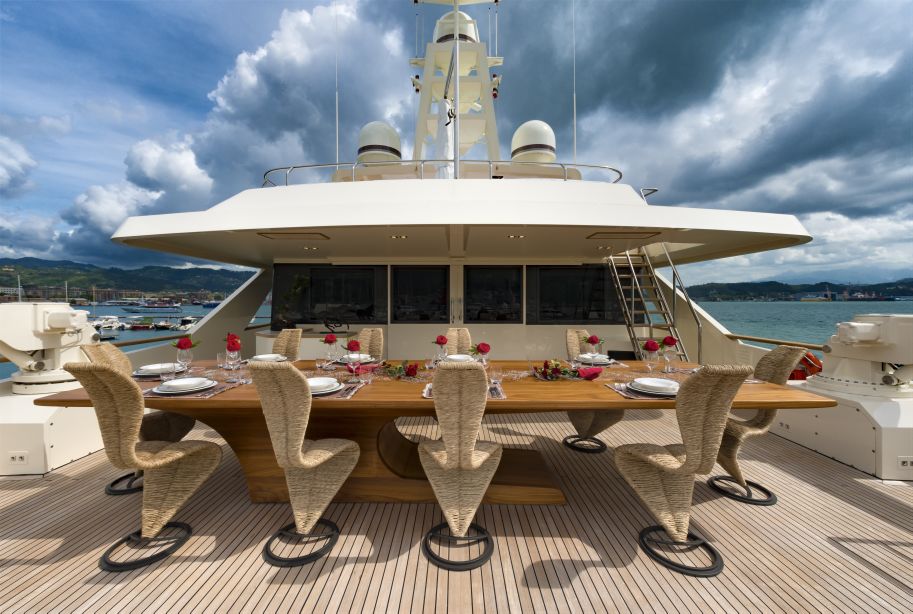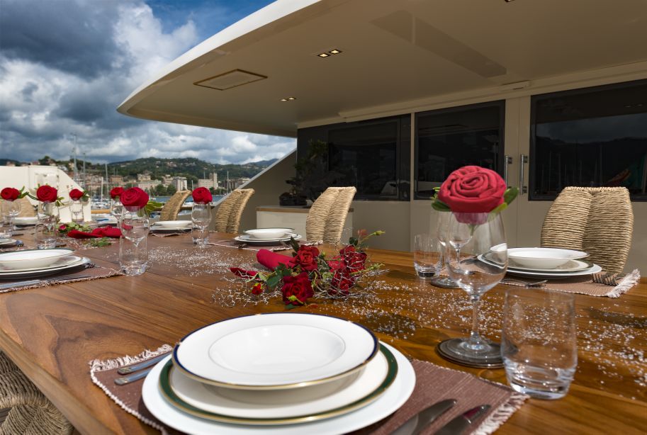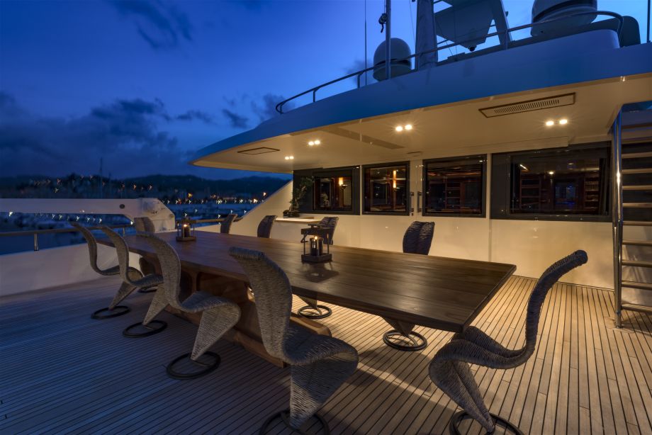 The main deck has a large exterior space to the aft for up to eight guests to dine alfresco. Staircases on either side