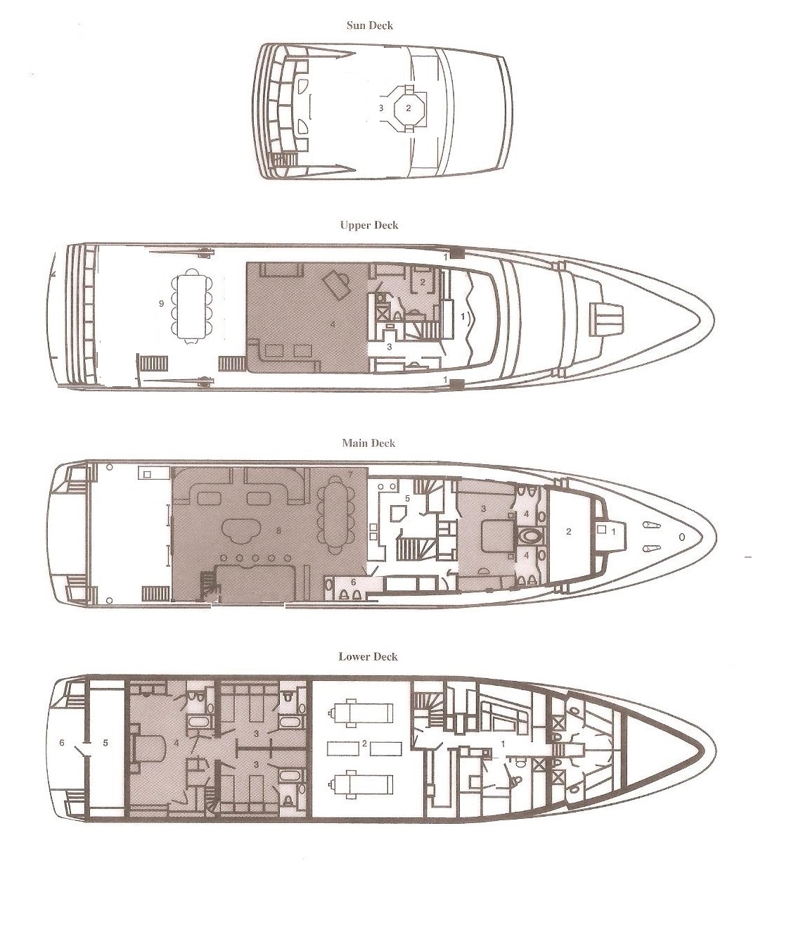 For quiet relaxation and study, the upper deck aft contains a large library where guests can catch up on the latest bestsellers and work on their hobbies. 2 x 1750 HP Caterpillar engines allow for a top speed of 18 knots and a cruising speed of 14 knots.