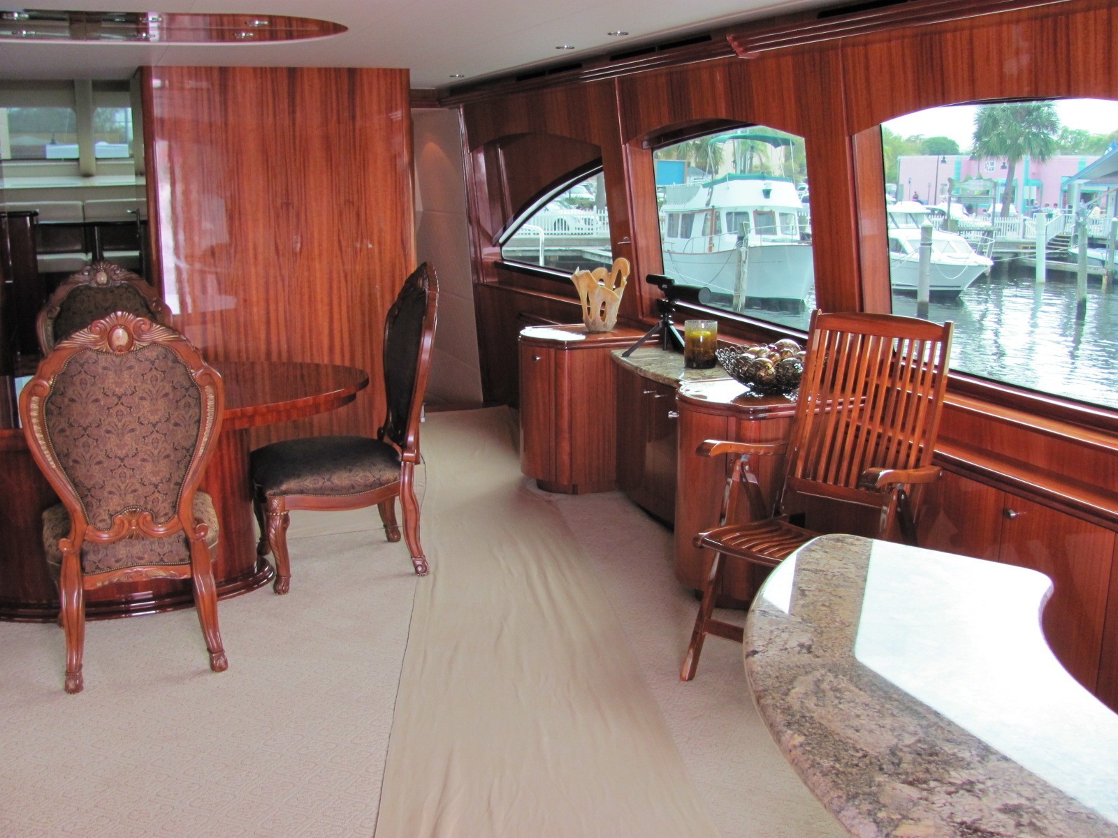 Crewed charter yacht ISLAND COWBOY has a timeless interior décor, featuring warm cherry toned wood panels in a high gloss finish, supple cream leather and custom soft furnishings and fine marbles throughout. The salon and dining are ideal for entertaining, boasting an open plan layout with the lounge aft and dining forward.