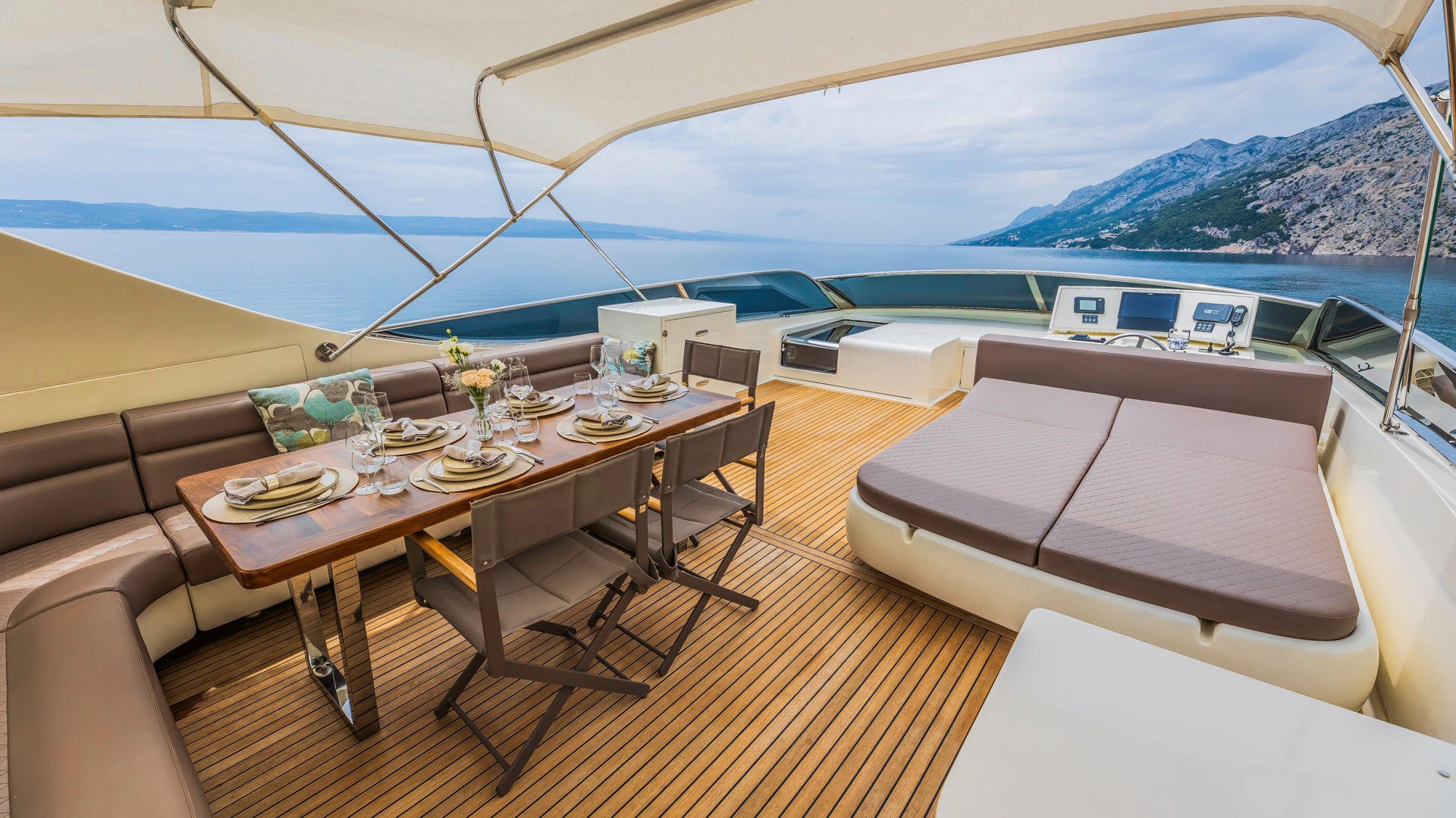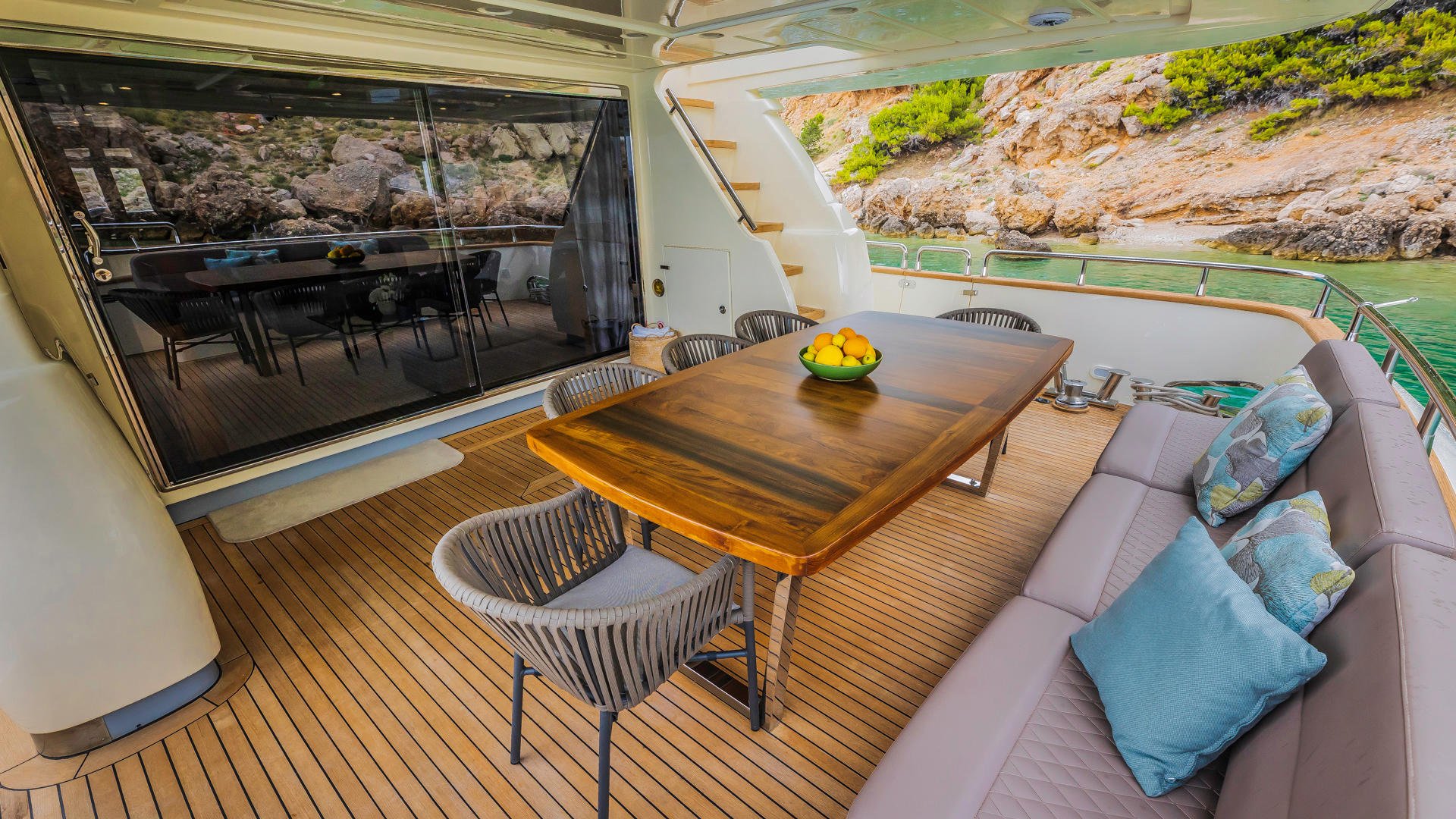 The aft deck is panelled in teak and is the perfect area for breakfast, an aperitif or al fresco evening meals. The oval table seats eight guests comfortably.