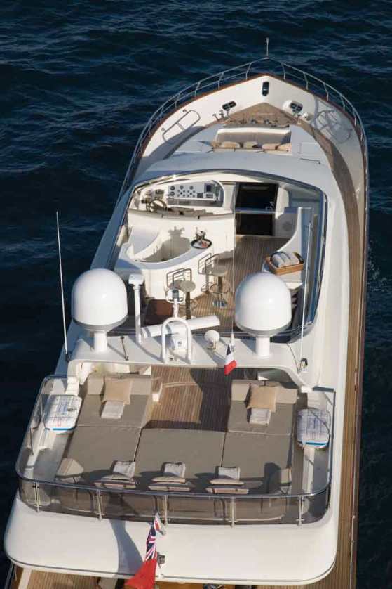On deck, the Leopard Motor Yacht LITTLE JEMS offers two separate areas for guest enjoyment. The main aft deck is set up for alfresco dining and the sundeck is arranged for full guest entertainment! This expansive area is one of the yachts most prominent features. The wide sweeping curves on the sundeck separate the space to include an informal al fresco dining area, a bar and a large sunbathing and relaxation areas. Additional sun pads are available on the foredeck.