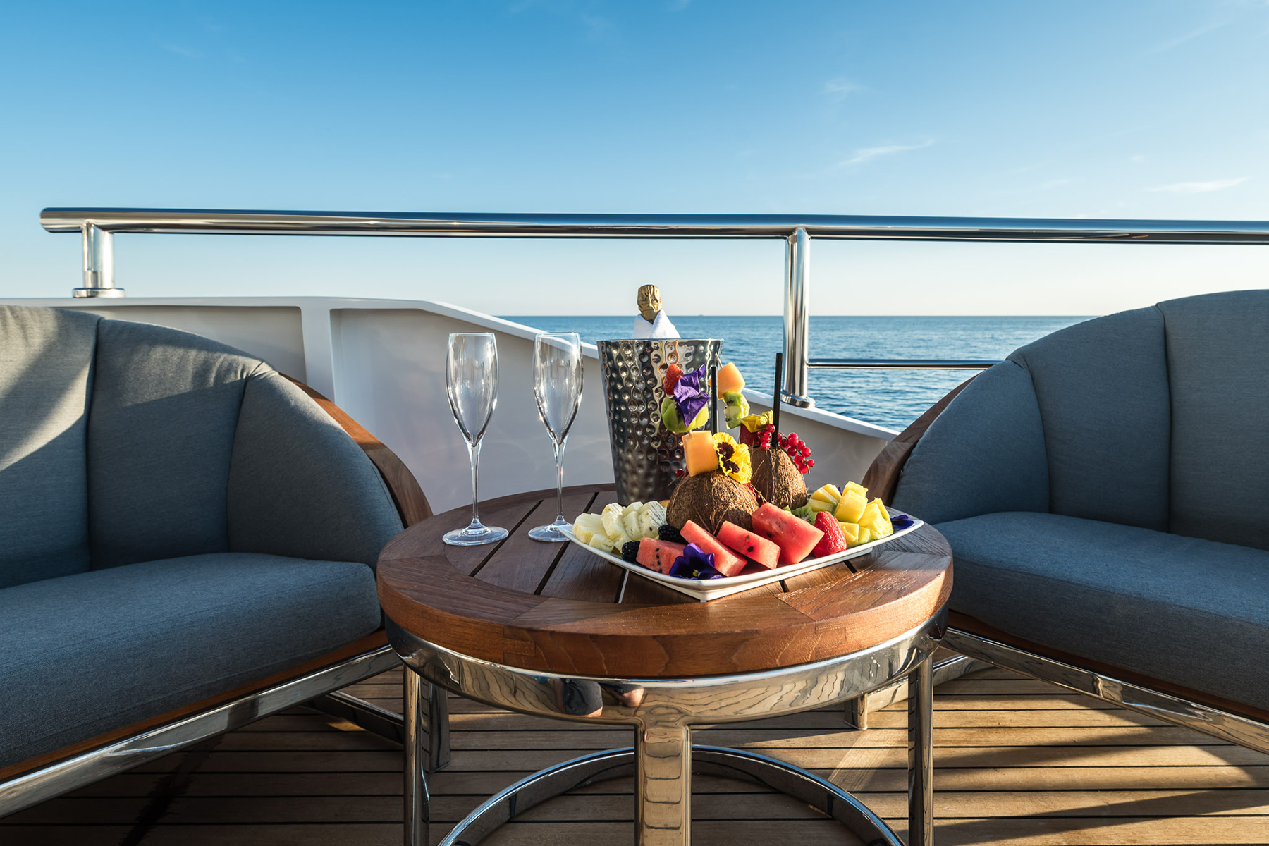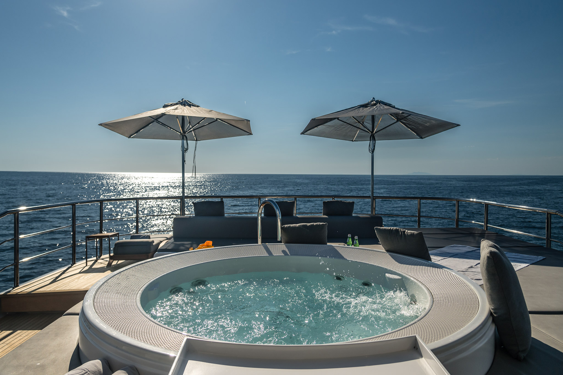 NOTABLE FEATURES OF R23: ~ Luxury living spaces ~ 60 sqm sundeck ~ Great for hosting events ~ Carries 100 guests while in-port ~ Gym ~ Jacuzzi ~ Alfresco dining ~ Exterior lounge area ~ A/V entertainment system ~ Swim toys