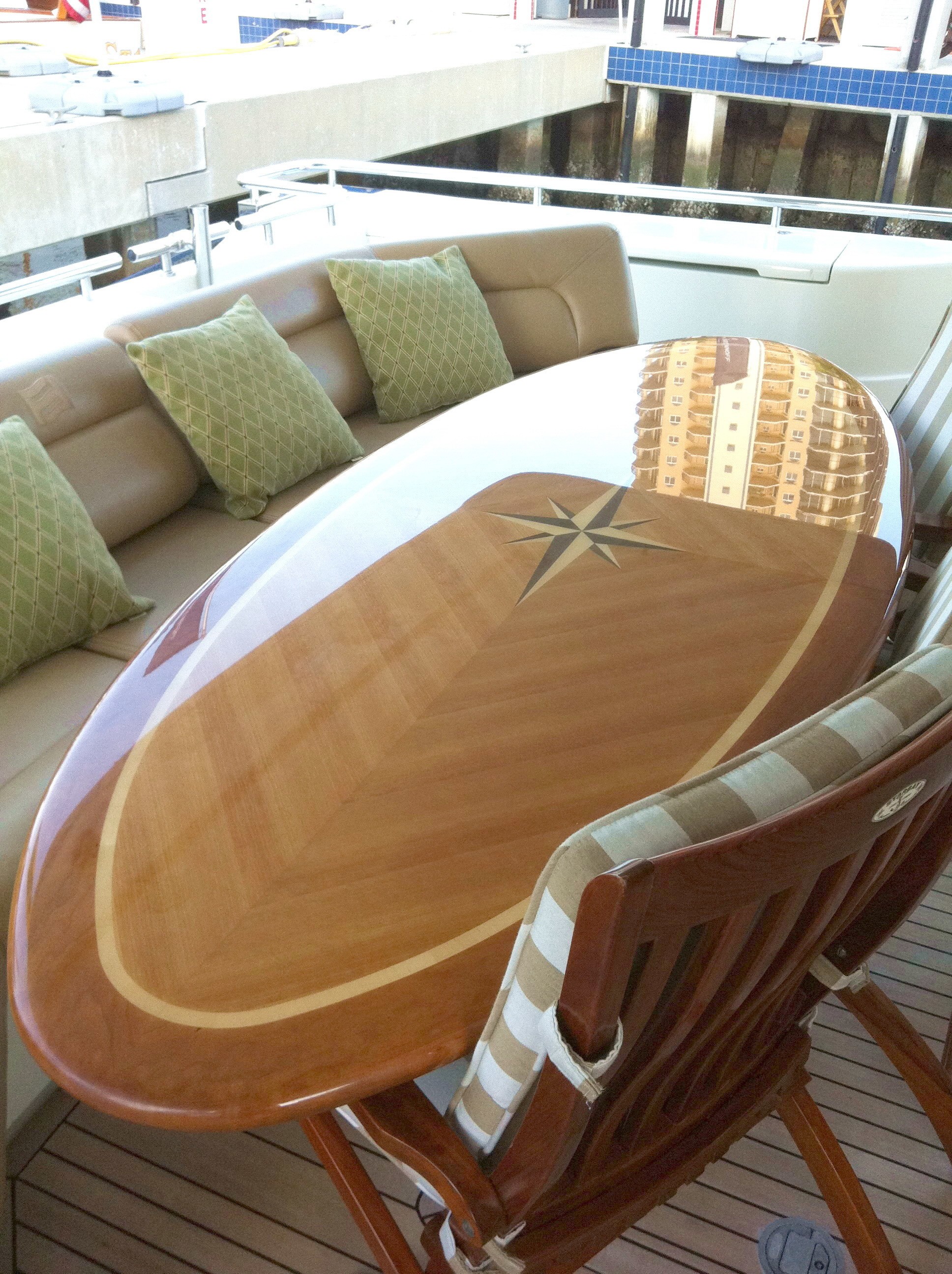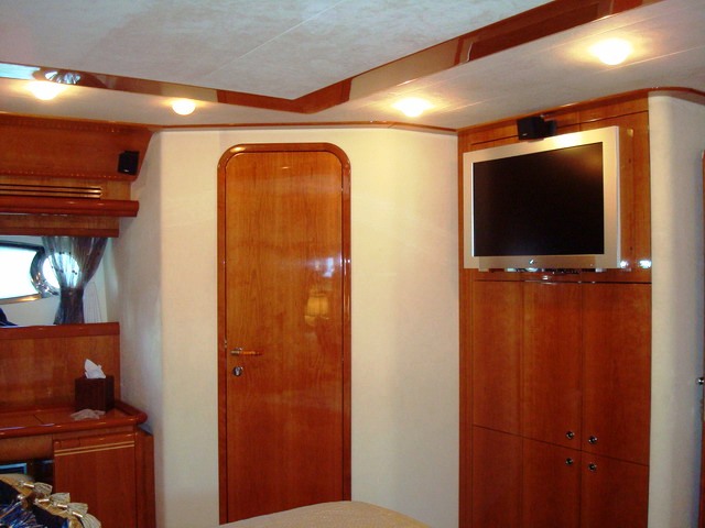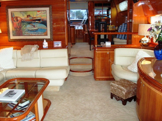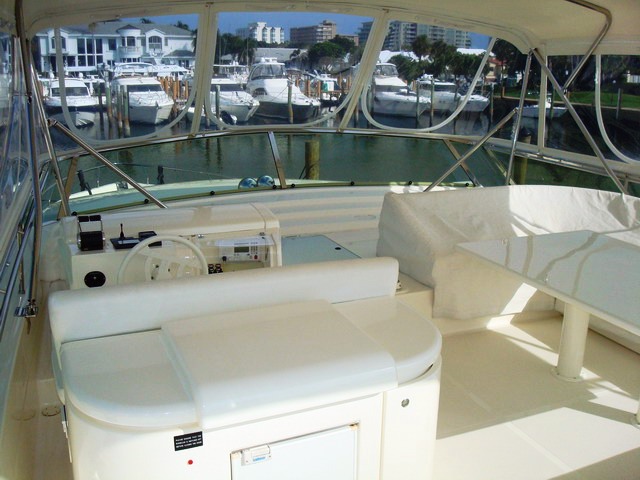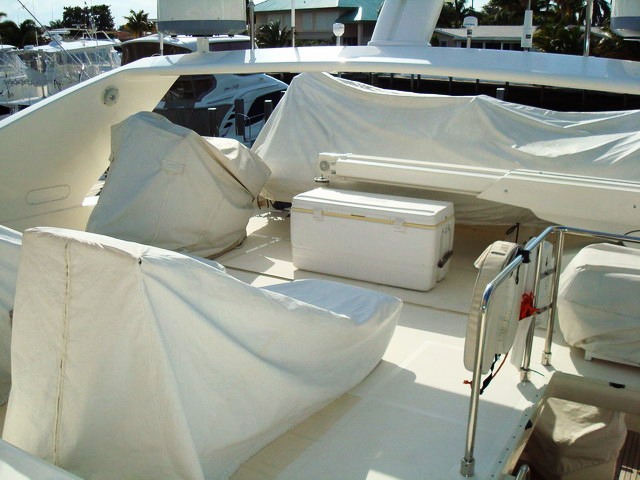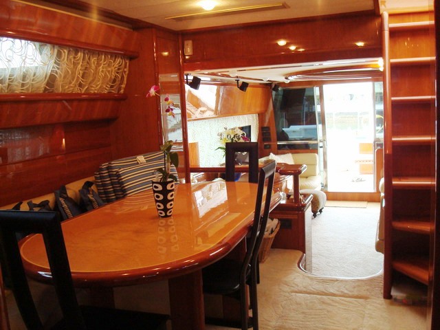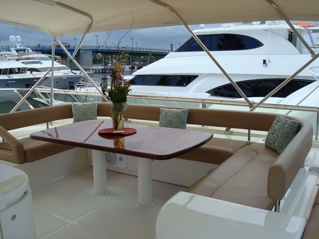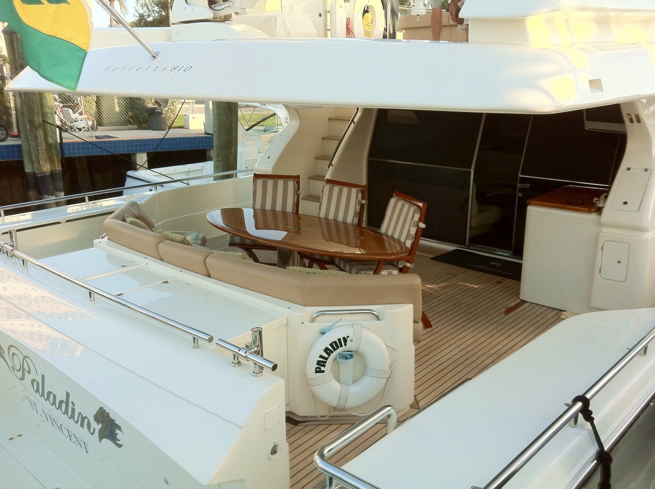 Paladin has a large Aft Deck with a great shaded area perfect for Alfresco dining for up to 8 guests. The aft deck also has a Wet bar with refrigerator and icemaker and a 26" Plasma TV/DSS.