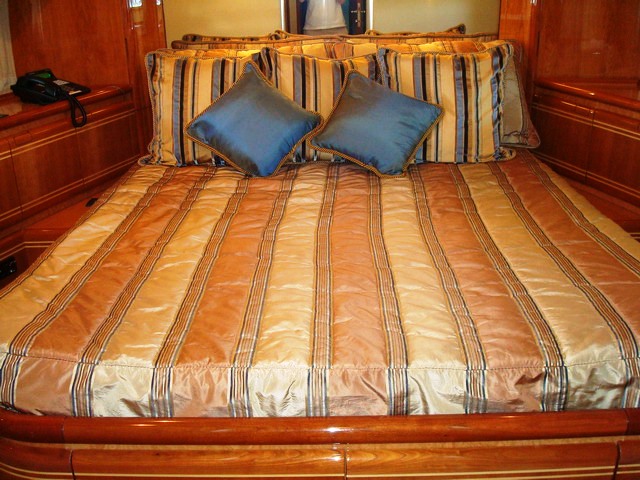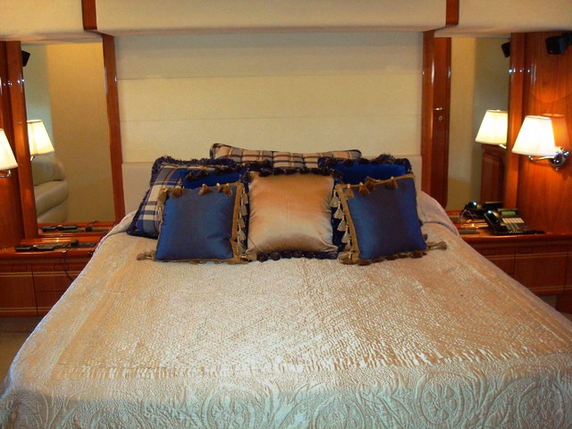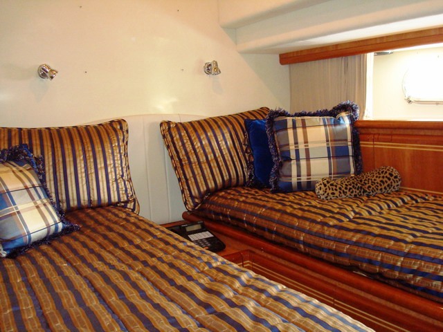 Motor yacht Paladin can accommodate up to 8 guests in 4 cabins. Her Master Stateroom has a Queen bed and is located below deck Mid-ship and encompassed the Full Beam of the yacht. The master suite has an ensuite Head with dual vanities and large shower. The cabin is also equipped with a 32” Plasma TV/DSS/DVD/CD/AM-FM Stereo (XM-Sirius). Paladin’s VIP Stateroom also has a Queen bed and is situated below deck Forward. The VIP has an ensuite head w/ shower. 20” Plasma TV/DSS/DVD/CD/AM-FM Stereo (XM-Sirius). The two remaining staterooms have twin beds and are below deck forward starboard and port. Each of these cabins have an ensuite head with shower and a 15” Plasma TV/DSS/DVD/CD/AM-FM Stereo (XM-Sirius).
