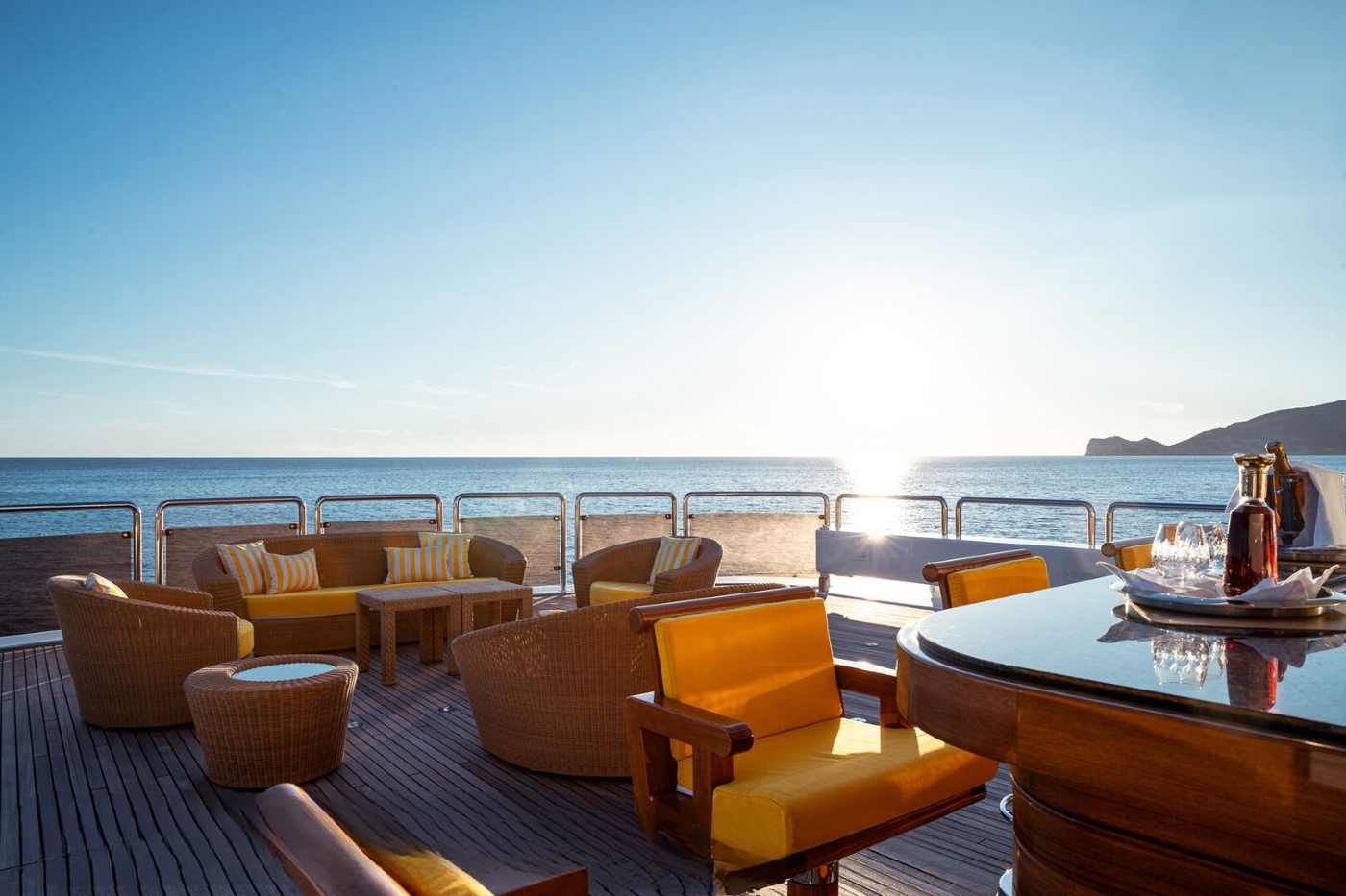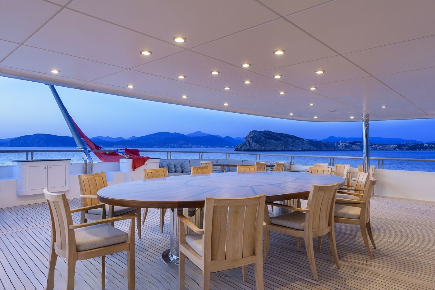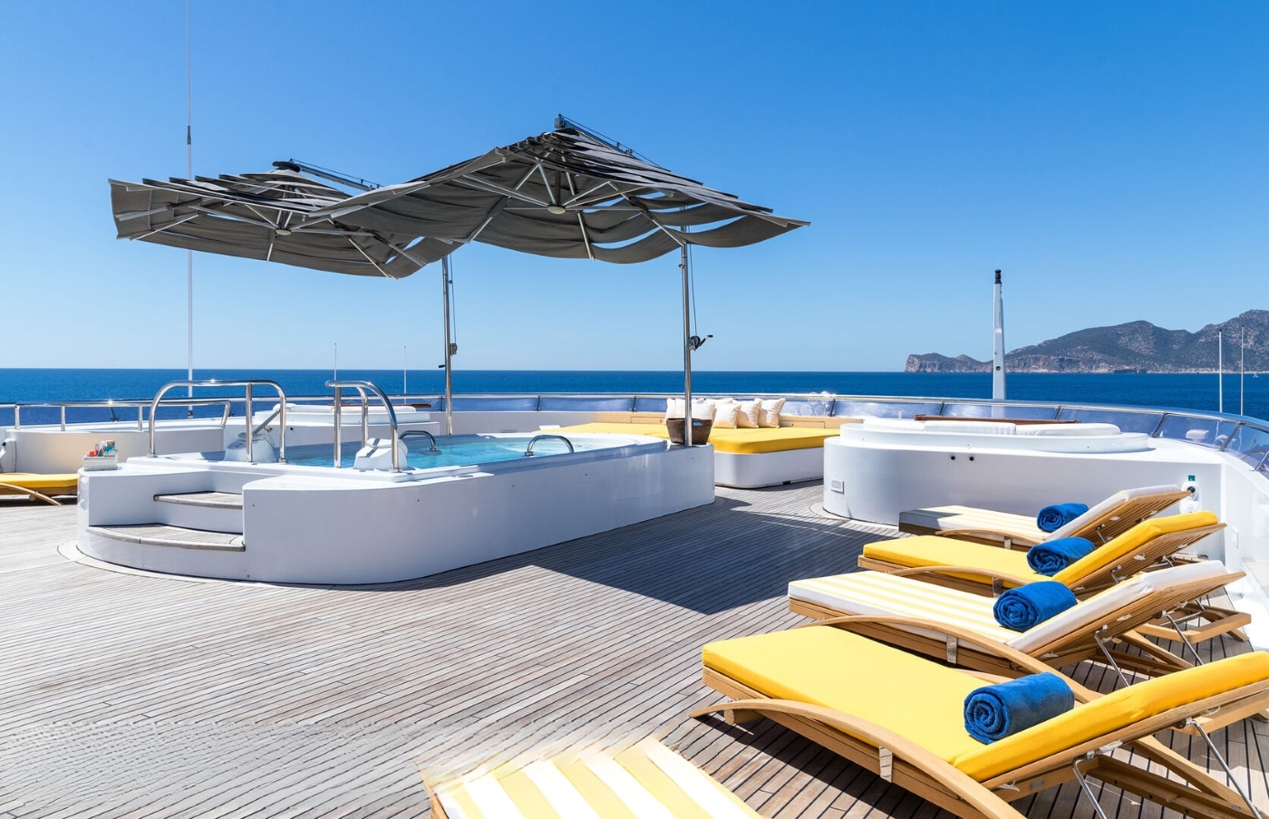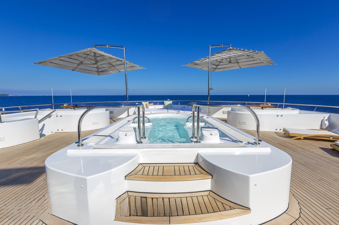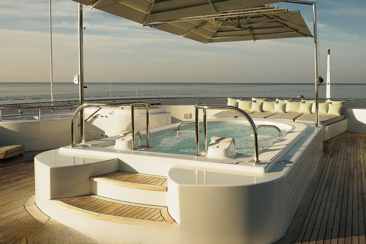 For those who want to dine al fresco, the aft deck has two ten-person dining tables, and there are extensive dining and sunbathing areas, as well as a spectacular five-metre, counter-flow pool sunken Sun Deck swimming pool on her sun deck. She also has a lower deck beach club and spa facility...