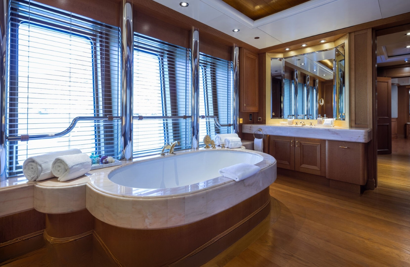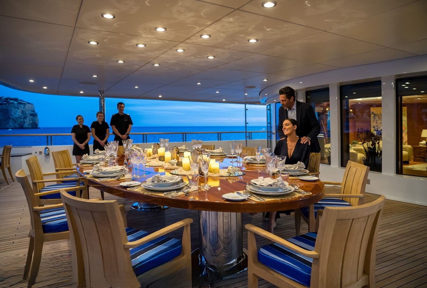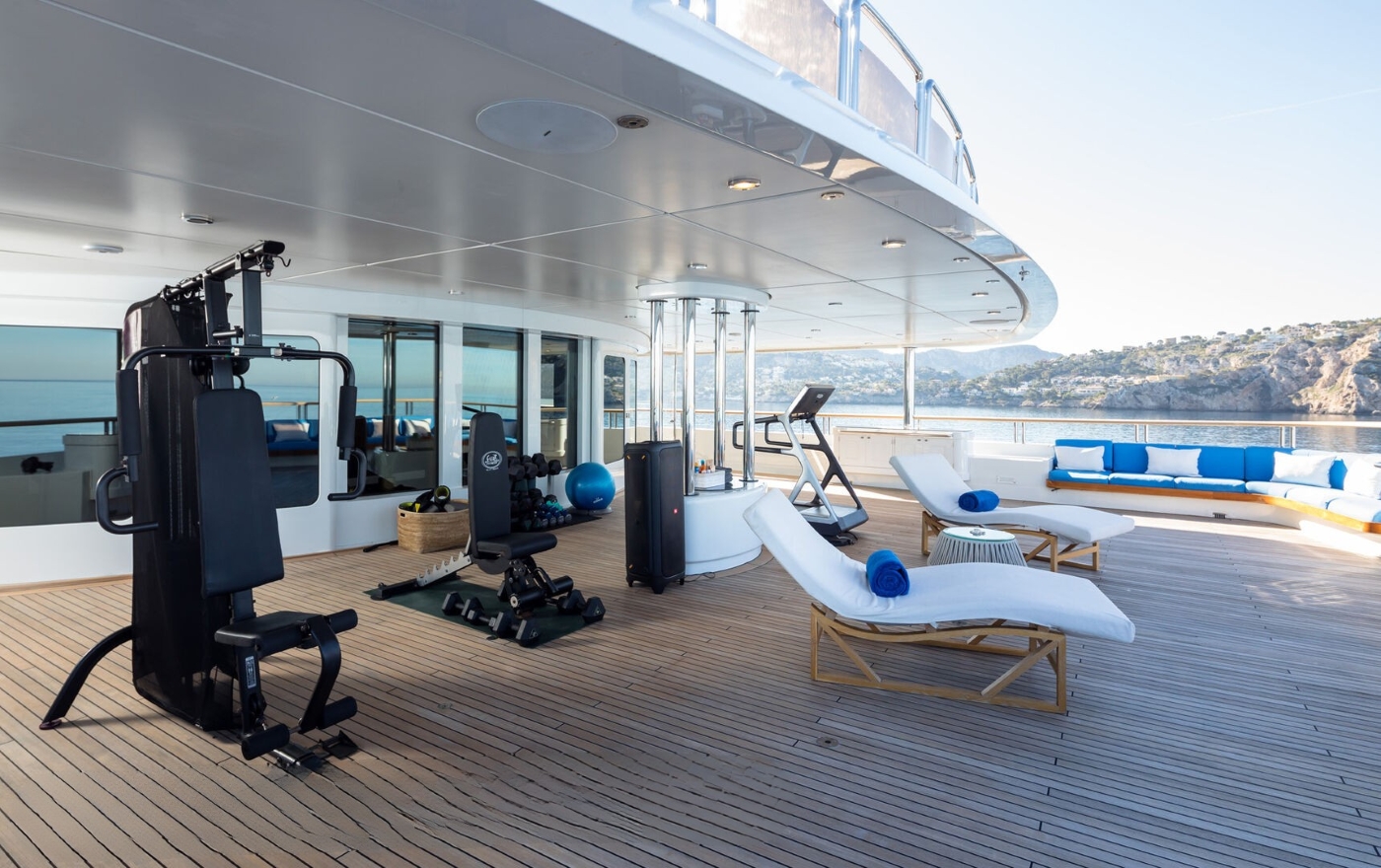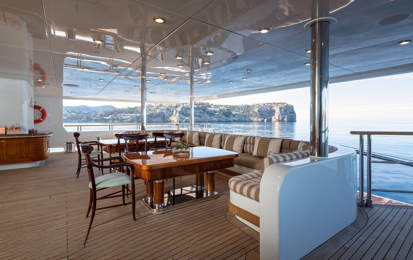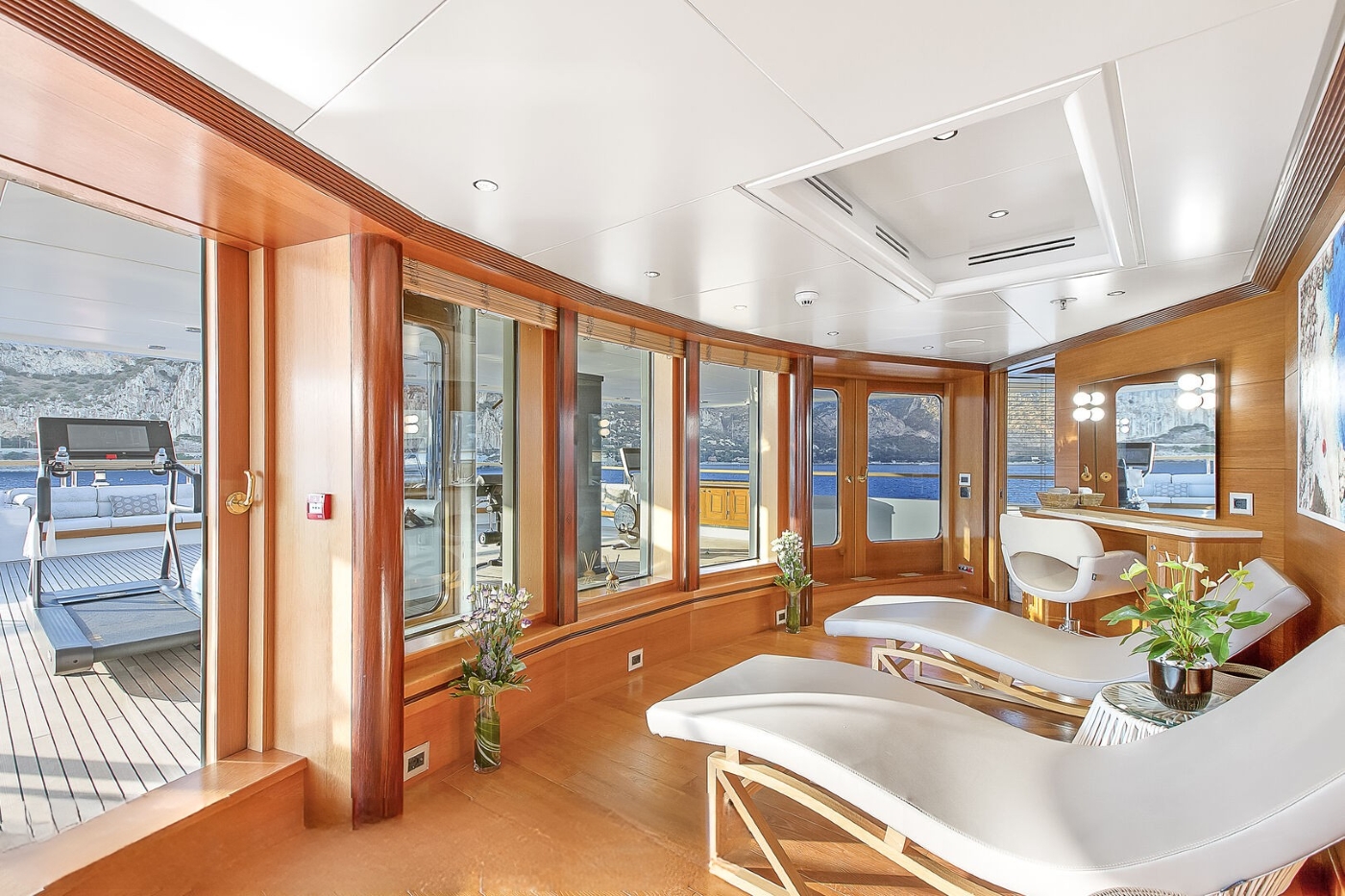 For those who want to dine al fresco, the aft deck has two ten-person dining tables, and there are extensive dining and sunbathing areas, as well as a spectacular five-metre, counter-flow pool sunken Sun Deck swimming pool on her sun deck. She also has a lower deck beach club and spa facility...