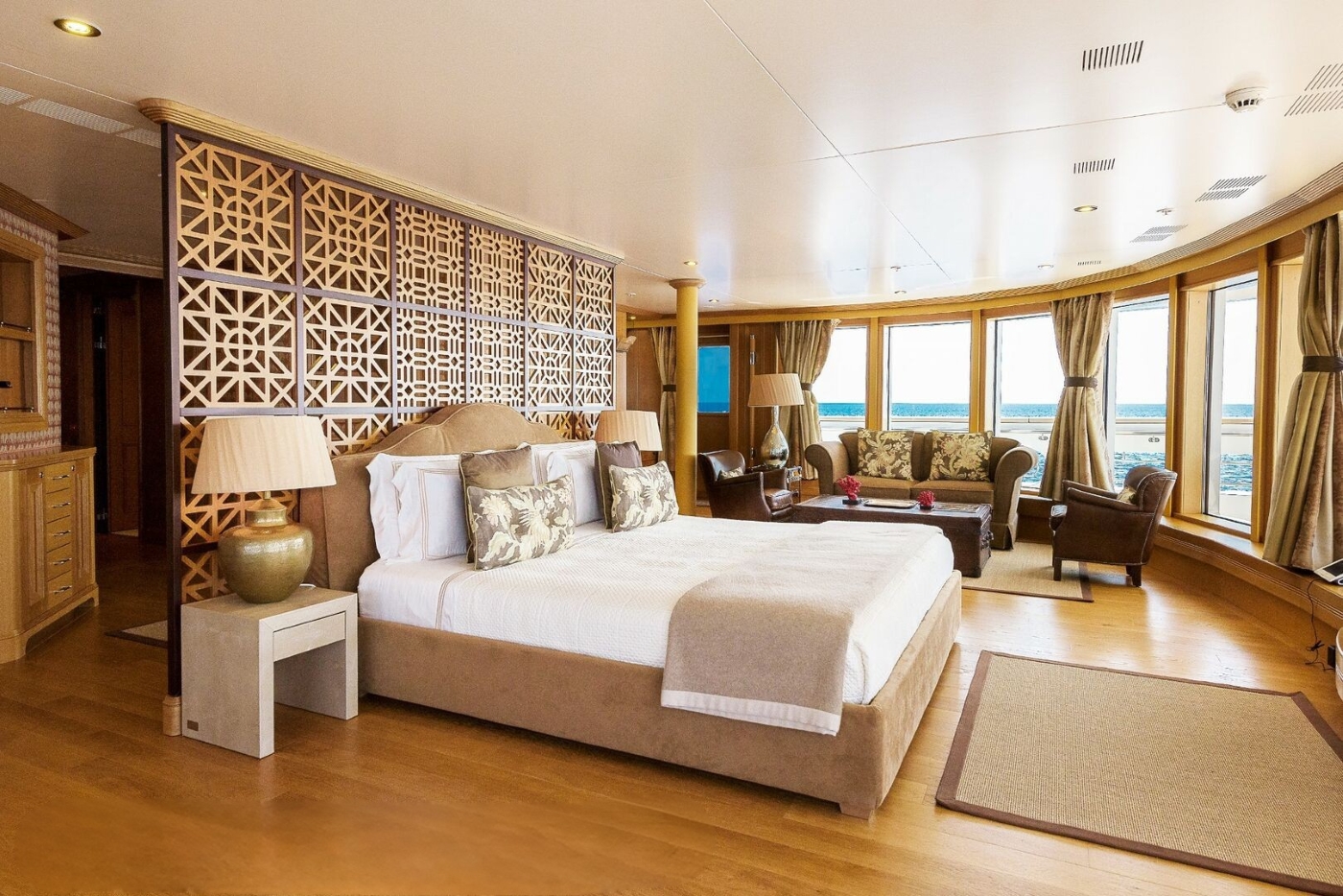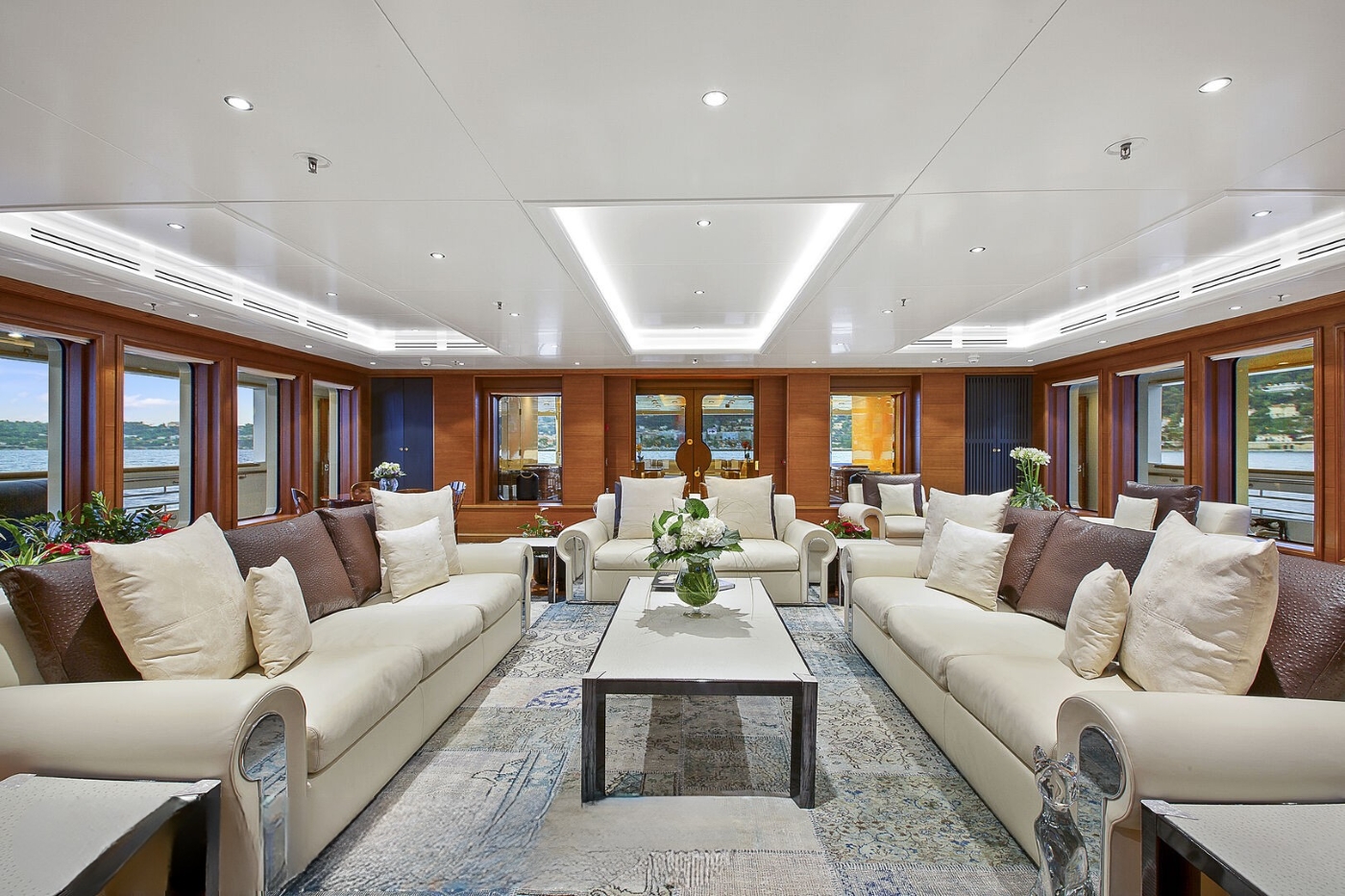 BOADICEA has a very impressive main saloon that can seat up to 16 guests, in both open spaces for just as the upper deck has been cut out to form a huge atrium and gallery. This area has a ceiling height of over five metres. Emphasizing this huge space are floor-to-ceiling windows along the entire length. There are nine separate dining areas ranging from casual al fresco lounges to more formal spaces. The décor throughout the yacht is contemporary and has accents from the Orient which creates a smart and eclectic style. There is a choice of formal and informal areas that are highlighted by soft furnishings in beige and salmon-pink.