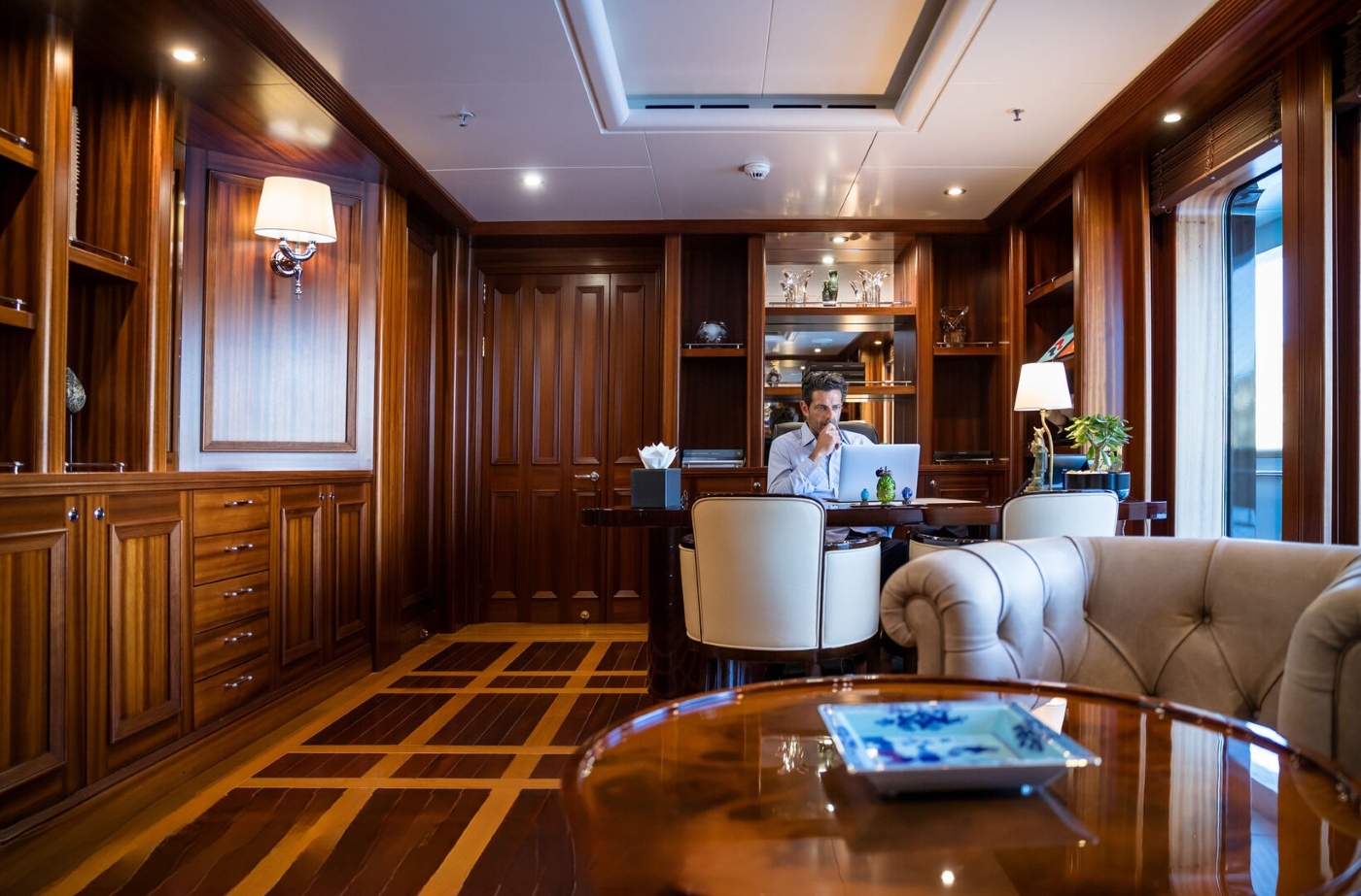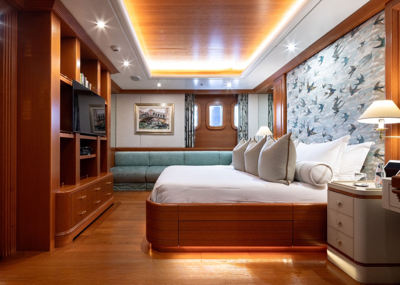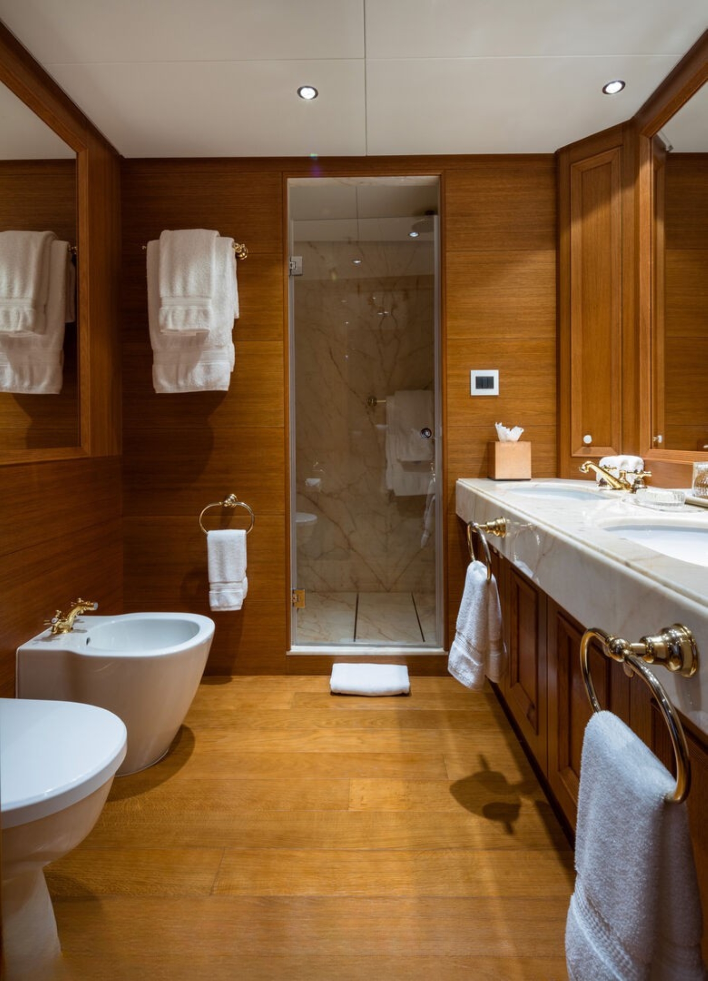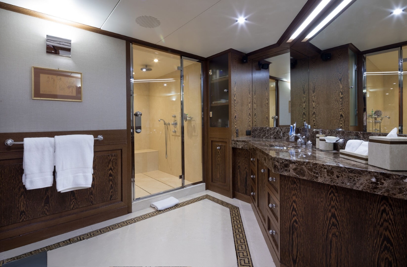 In BOADICEA's sumptuous and incredibly spacious full-beam master suite, a chinoiserie silk printed headboard frames a California king sized bed facing 180°, full-height windows and a full-beam private terrace for panoramic views. There are his and hers bathrooms with large shower and spa pool bath respectively, a ladies dressing boudoir, and an owners office. M/Y BOADICEA has additional cabins that include a double-depth lateral VIP suite on the main deck and six large lower deck suites, all with marble bathrooms, handmade Italian leather and raw silk. The VIP suite situated on the yacht's main deck boasts a generous sized cabin interconnecting to a vast dressing area with California closets through which the bathroom with shower and bath tub is accessed. With very large windows throughout, the VIP suite is an extremely comfortable, light and bright area. Located on the lower deck are five doubles and one twin cabin offering extremely versatile accommodation. All cabins are ensuite and are decorated in warm neutral tones. All decks can be accessed by the elevator.