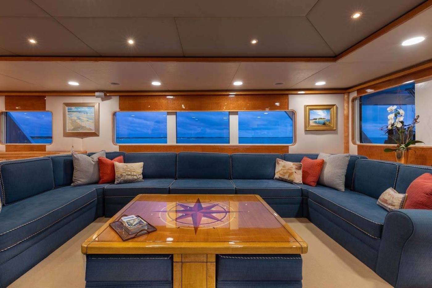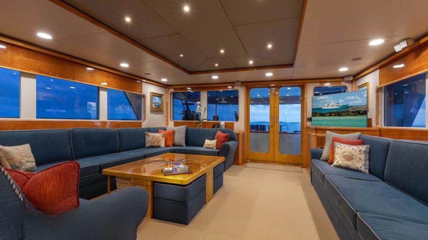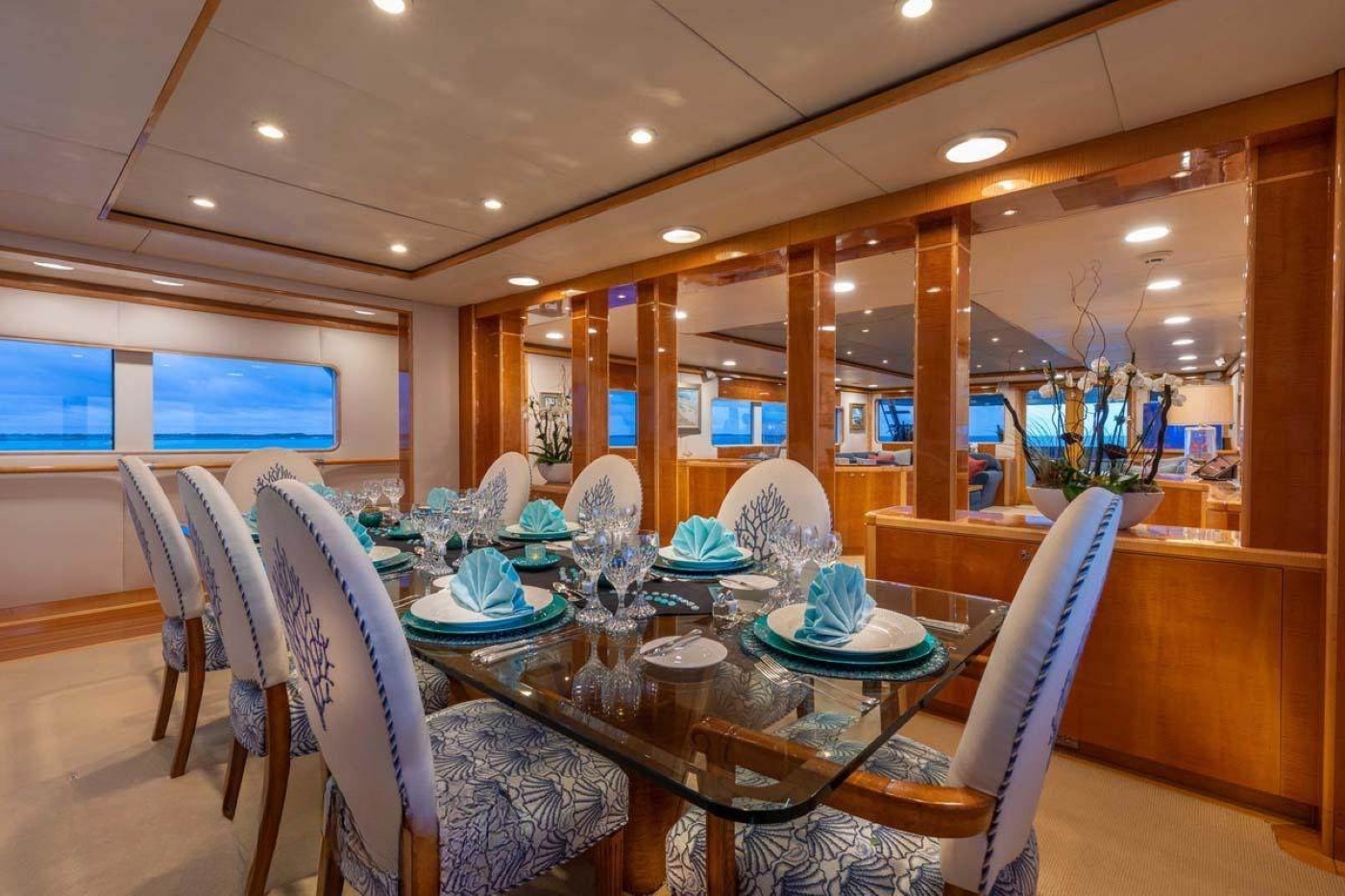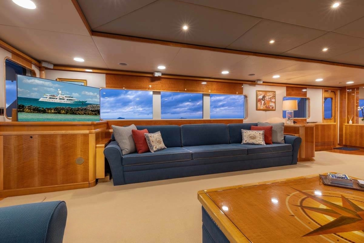 This motor yacht has a quiet elegance inside and a relaxing atmosphere. Features of her interior include a full-beam saloon, dining saloon, and spacious dining room.