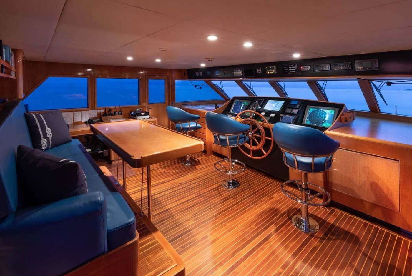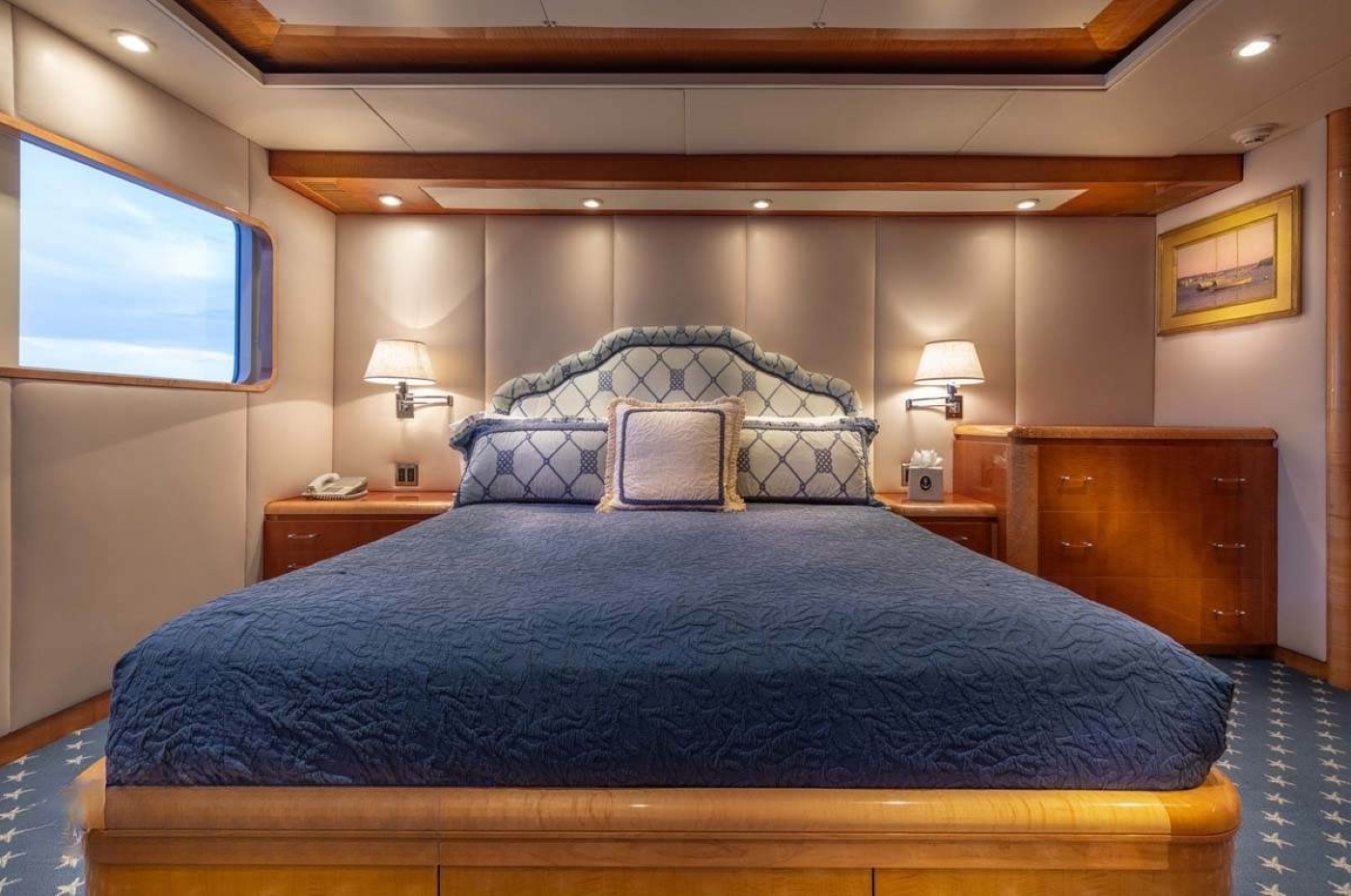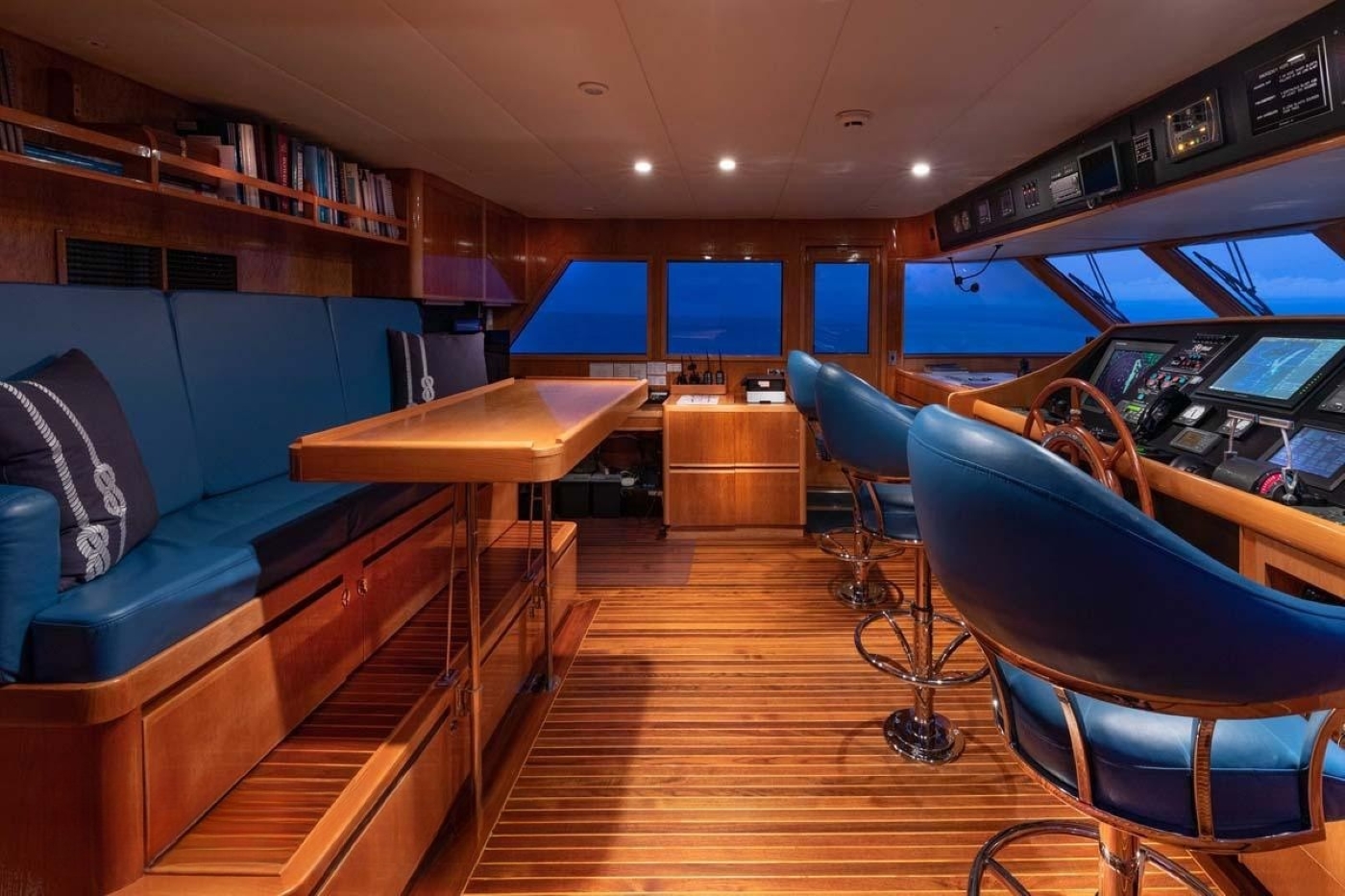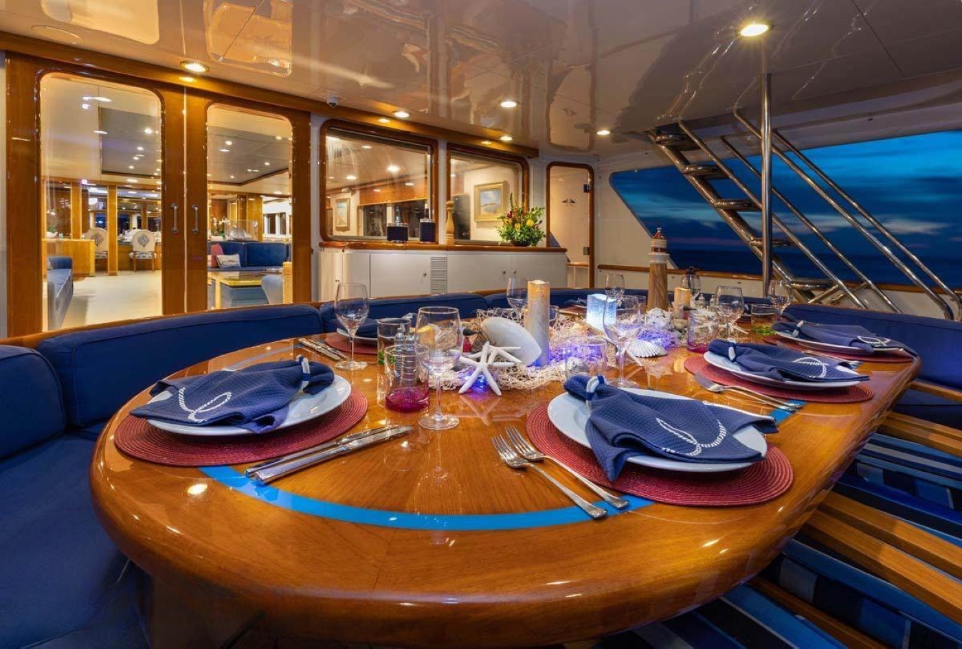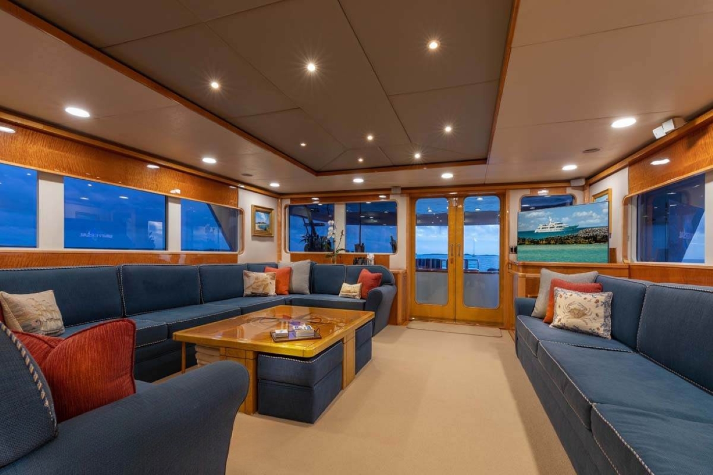 This motor yacht has a quiet elegance inside and a relaxing atmosphere. Features of her interior include a full-beam saloon, dining saloon, and spacious dining room.