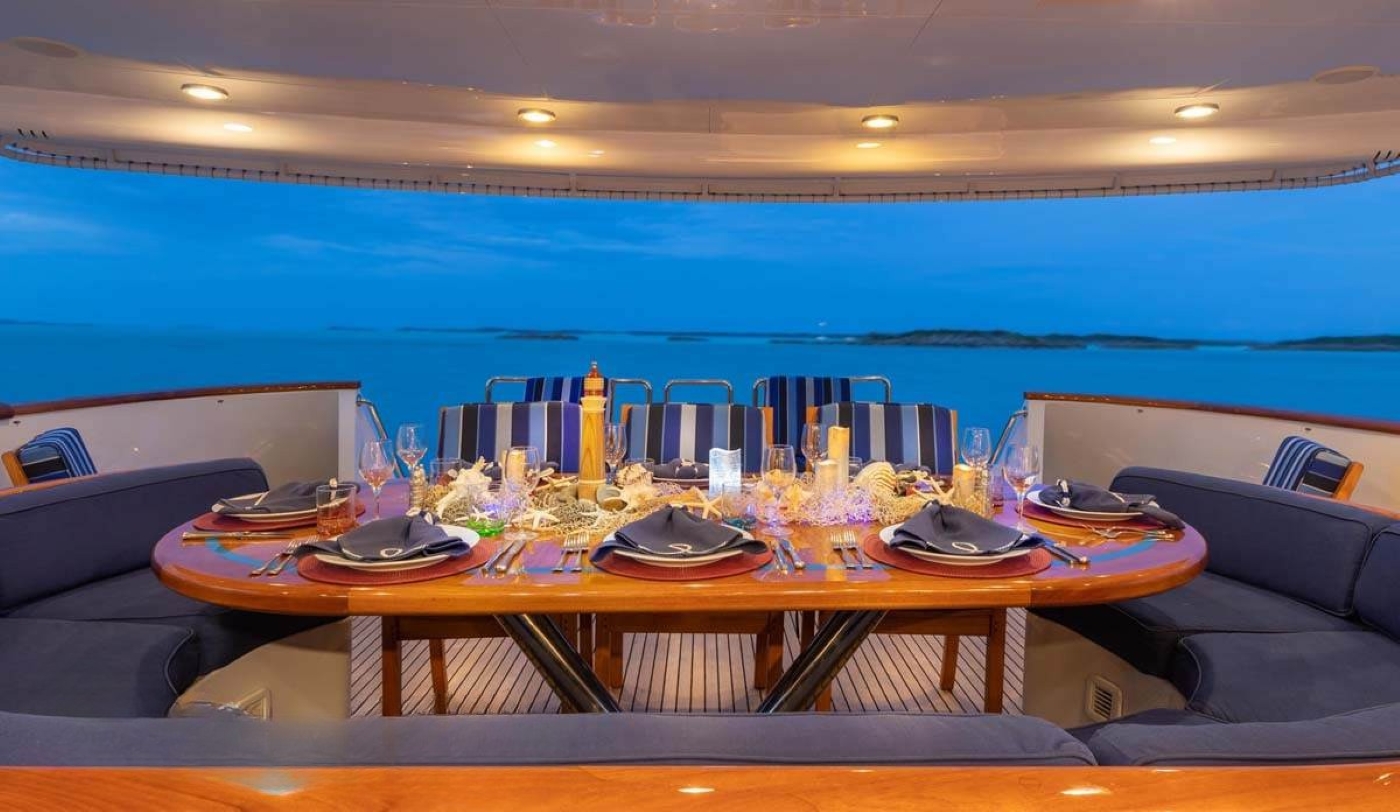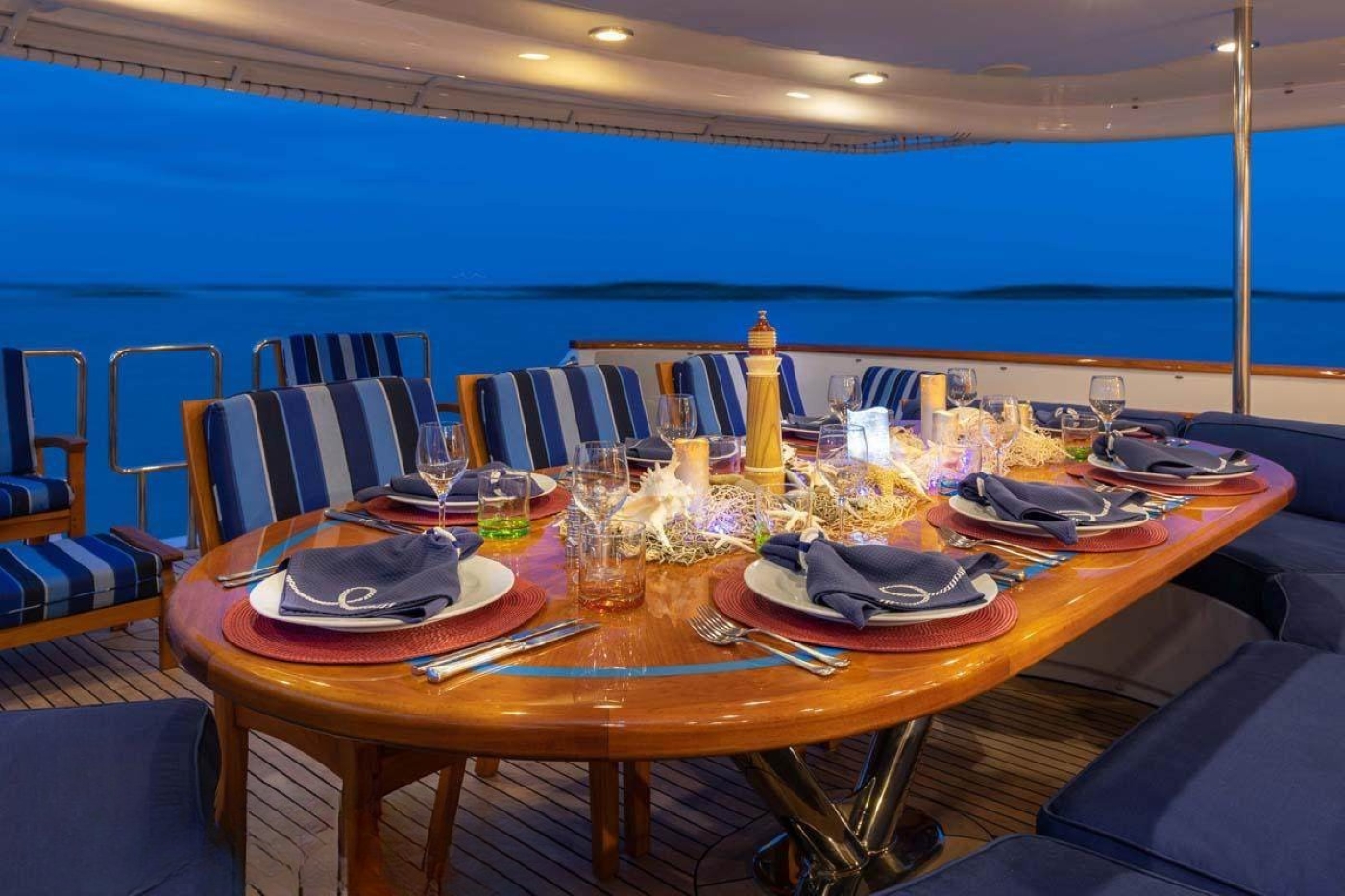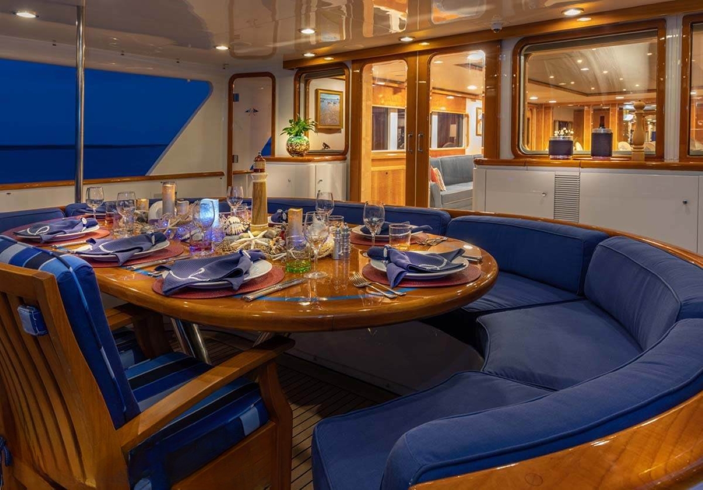 The superyacht’s many outdoor spaces are wonderfully spacious for relaxed entertaining. For instance, her large circular table on her aft deck comfortably seats 12 for meals and entertainment or cocktails. RENA’s upper deck, with its grill and bar, plus table and settees, is also perfect for entertaining and al fresco dining.