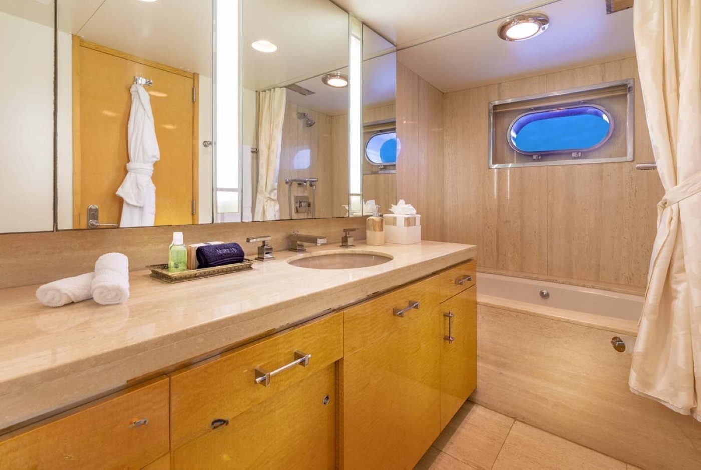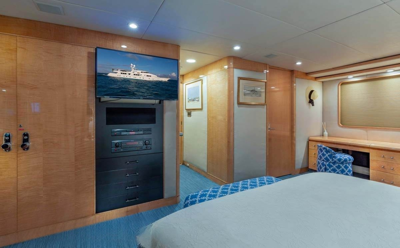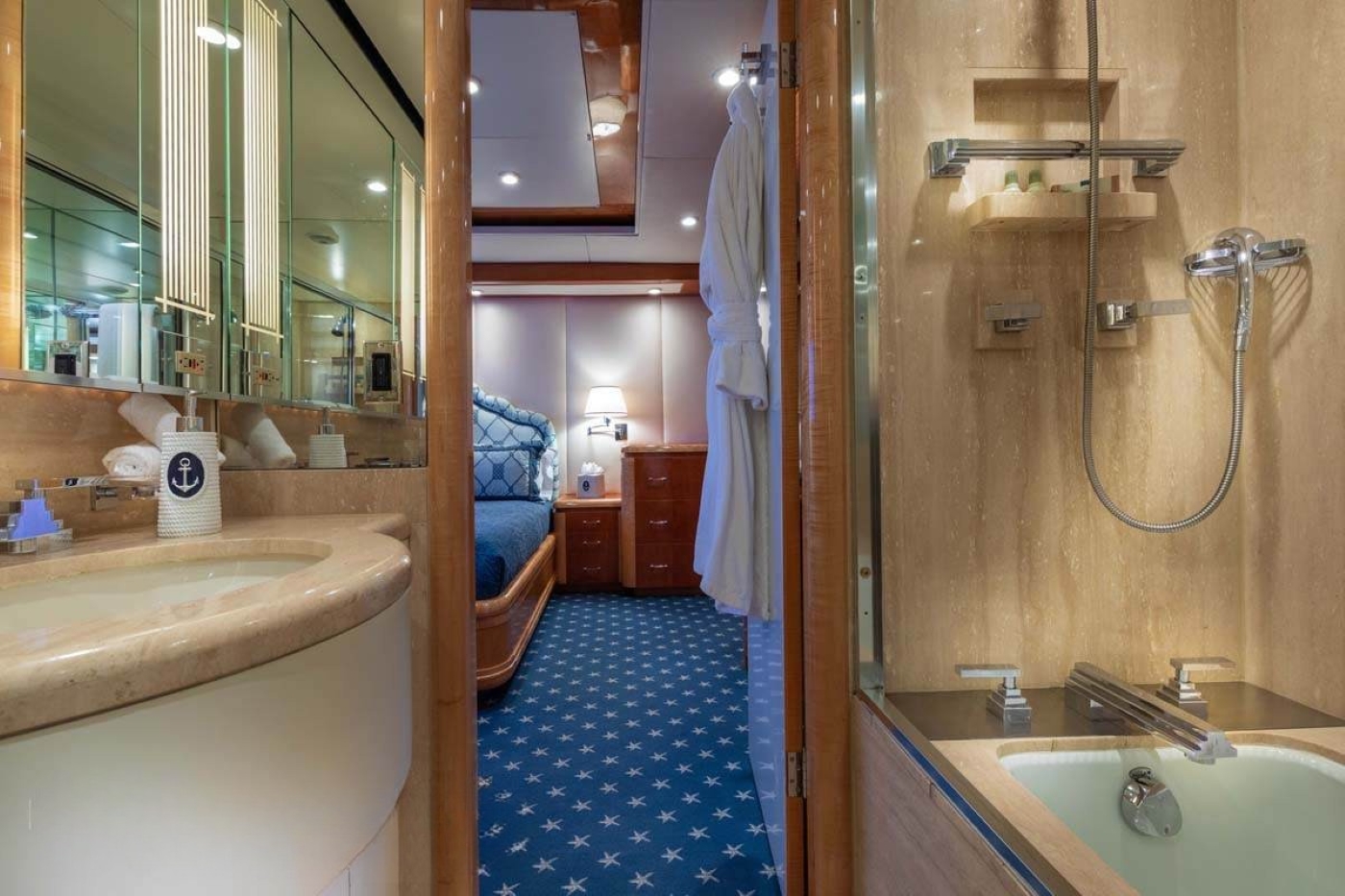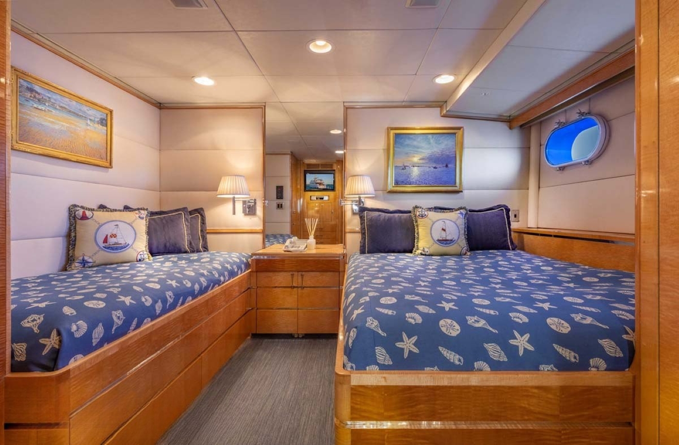 This displacement superyacht can accommodate 10 to 12 guests in five beautiful staterooms, all of which have their own ensuite bathrooms and private Spa Pools bathtubs. The staterooms also boast good entertainment centres, including flat-screen satellite TV, DVD and CD player as well as iPod-friendly connections.