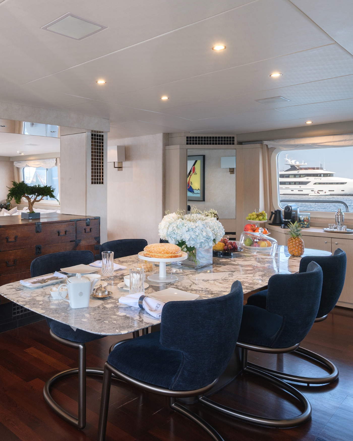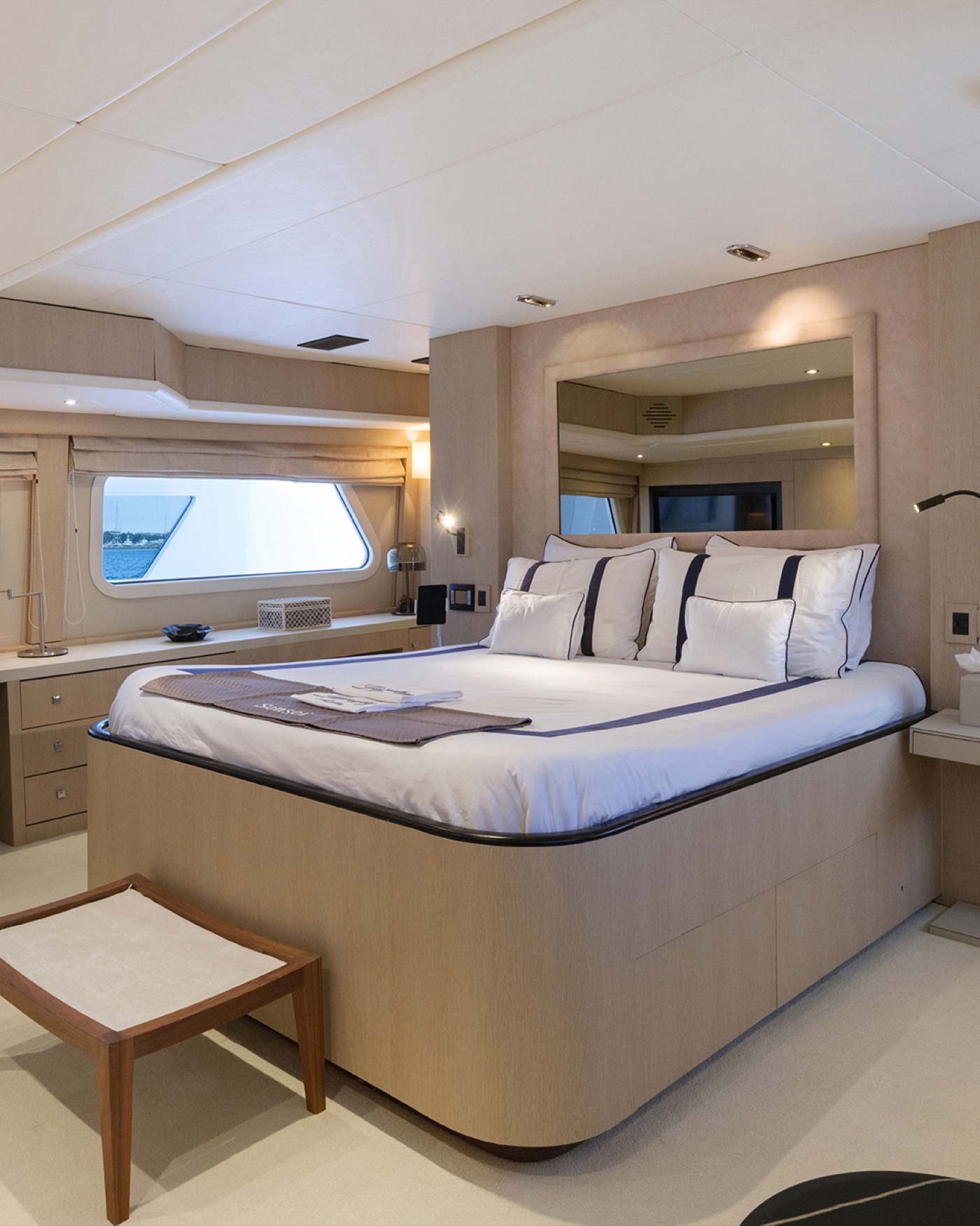 Luxury Motor Yacht SENSEI offers accommodation for 10 guests. The Owner Stateroom has a large, ensuite bathroom with Italian travertine marble and under floor heating, Spa Pool bath, a separate shower, two sinks and a separate wc (refitted 2007). She has 2 large identically sized Double VIP cabins with queen beds with ensuite bathroom with shower (refitted 2007) and 2 large identically sized Twin cabins with ensuite bathroom with shower.