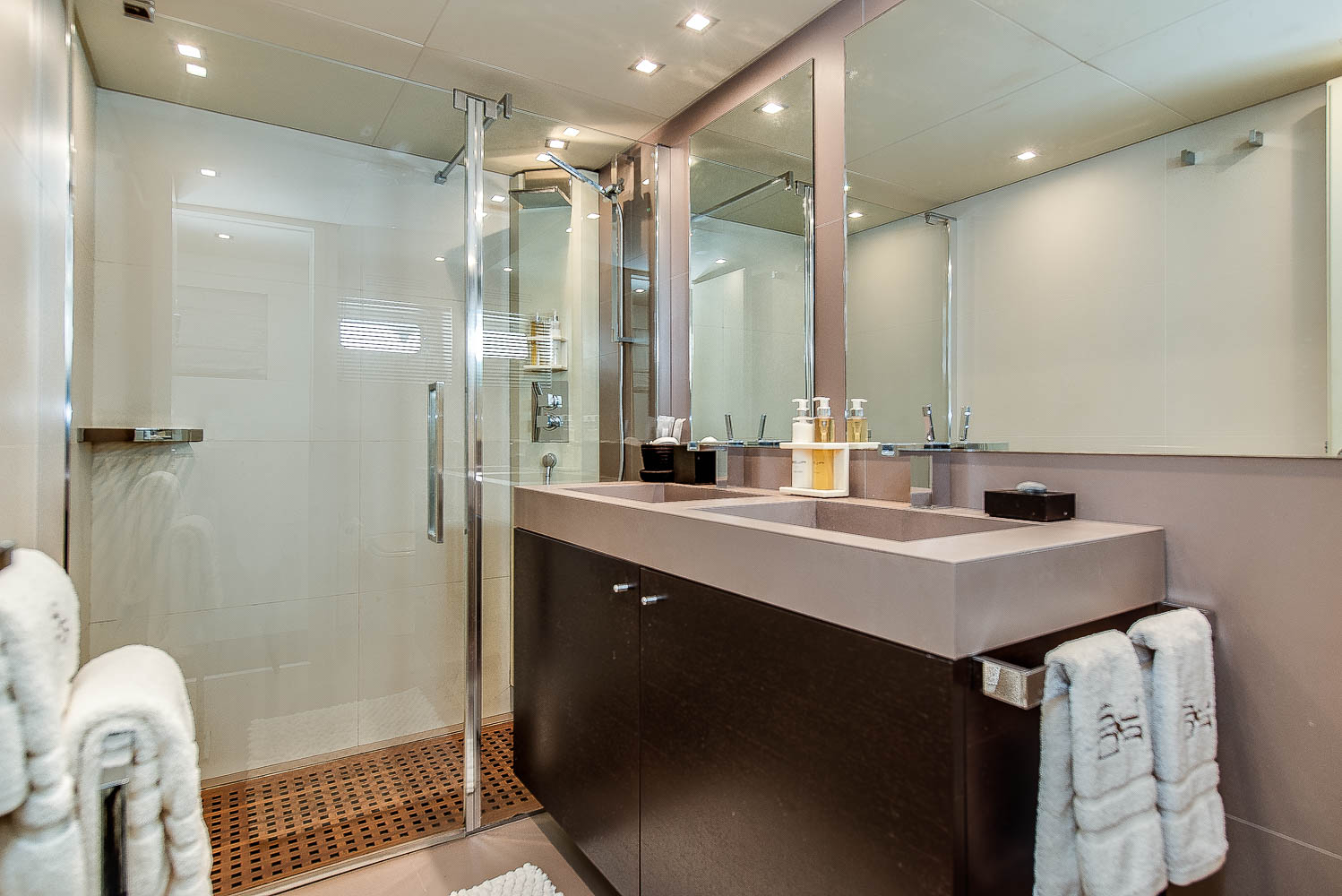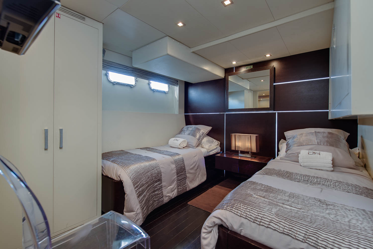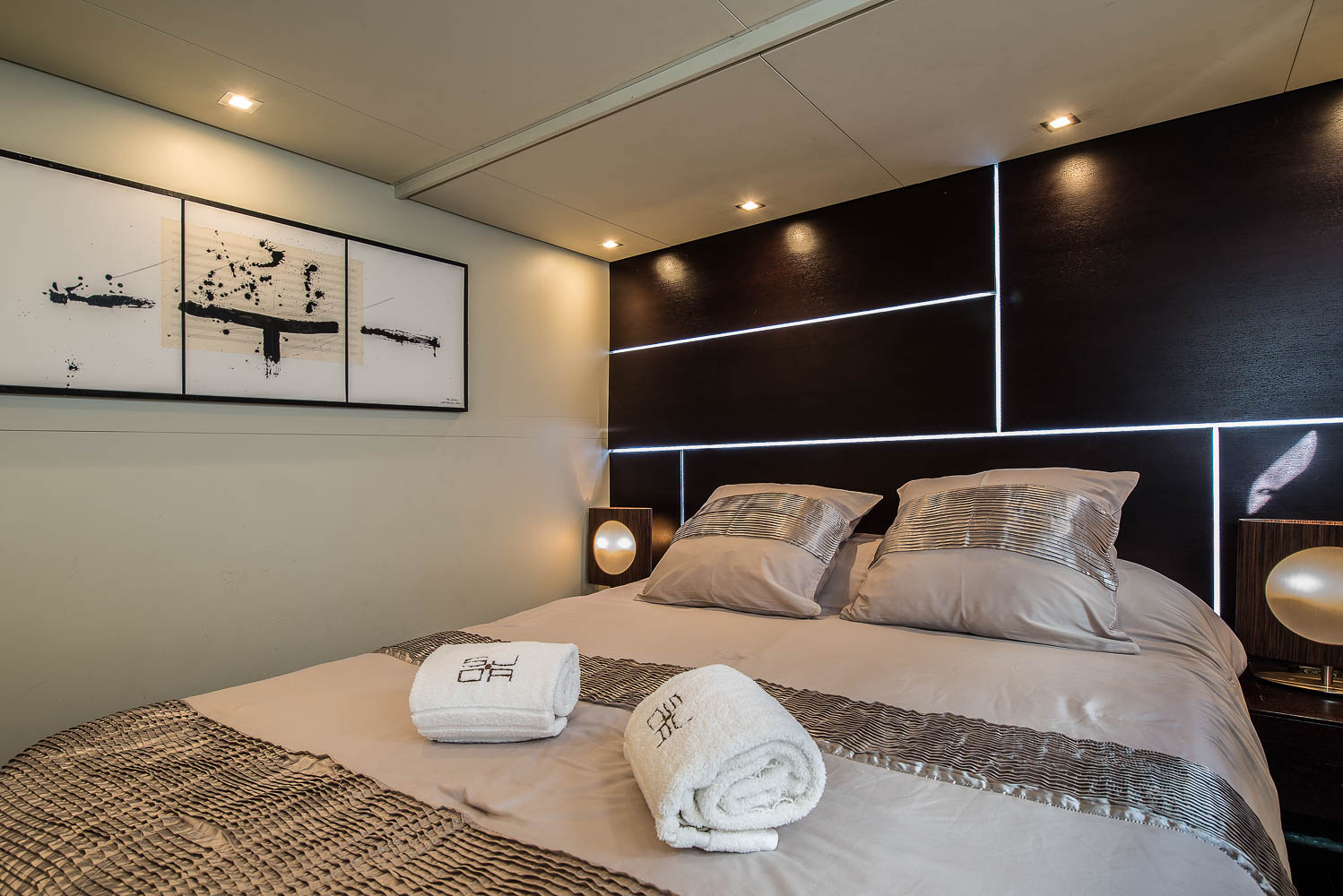 SOJA can accommodate a maximum of 9 guests. The accommodation area has been well thought out and is divided into two separate zones. At the bow, which is the quietest area there are 2 cabins for distinguished guests, namely, the master cabin with double bed and twin bunk (for children max 10 years old) and a guest cabin with double bed. At the aft of the yacht, there are 2 spacious cabins, 1 twin and a double.