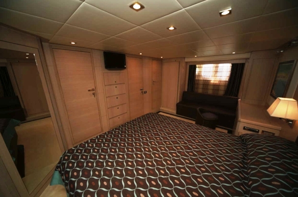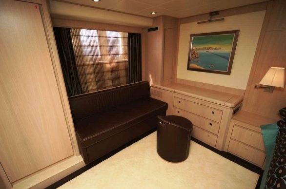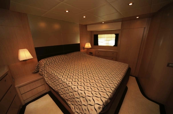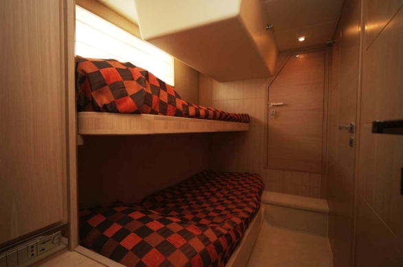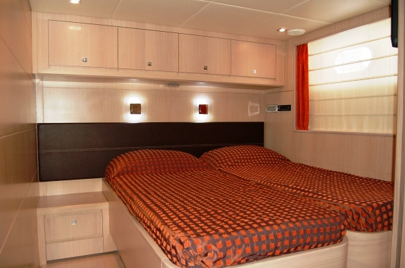 Motor yacht TIVELLA can accommodate up to 8 guests in a full beam master suite, a VIP cabin Forward a Twin Bunk Cabin Aft and a Twin Cabin convertible in Double Cabin Aft.