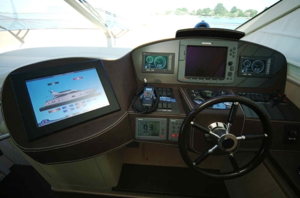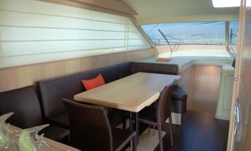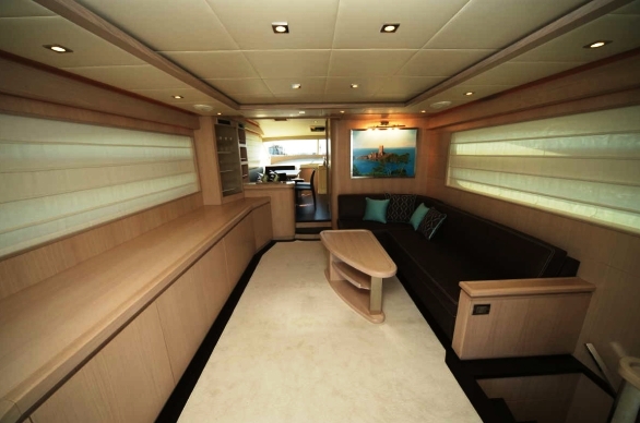 M/Y TIVELLA’s main salon features a long couch to the starboard and a long cabinet lining the port side. Her dining area is elevated by a small step and is further forward. Forward of the dining area is the helm station equipped with the latest navigation systems.