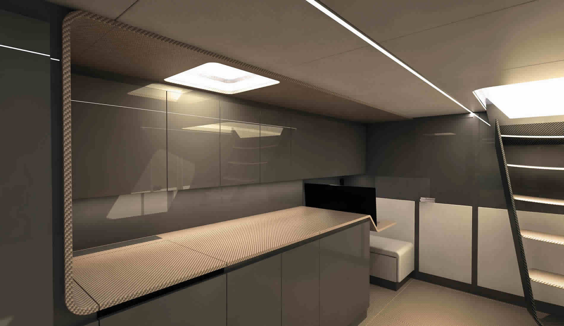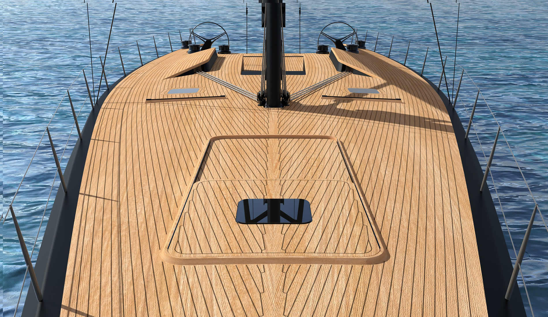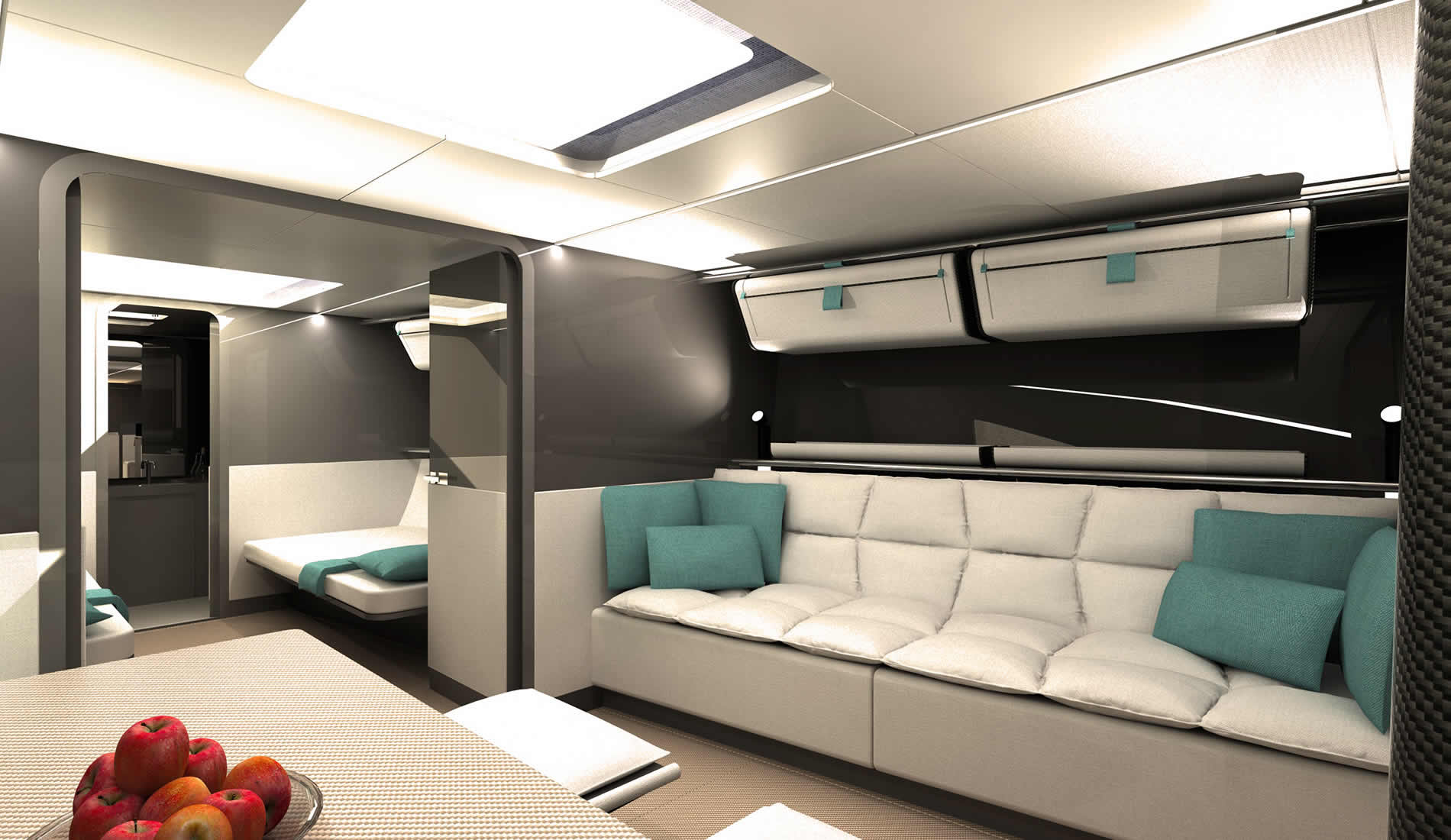 Her new interior design features hidden central cockpit and the coamings, which create a full flush look. The interior layout allows for more privacy for the owners, as the owner's area is located forward of the salon. Two guest cabins are situate aft, while the galley and crew cabin are amidships.