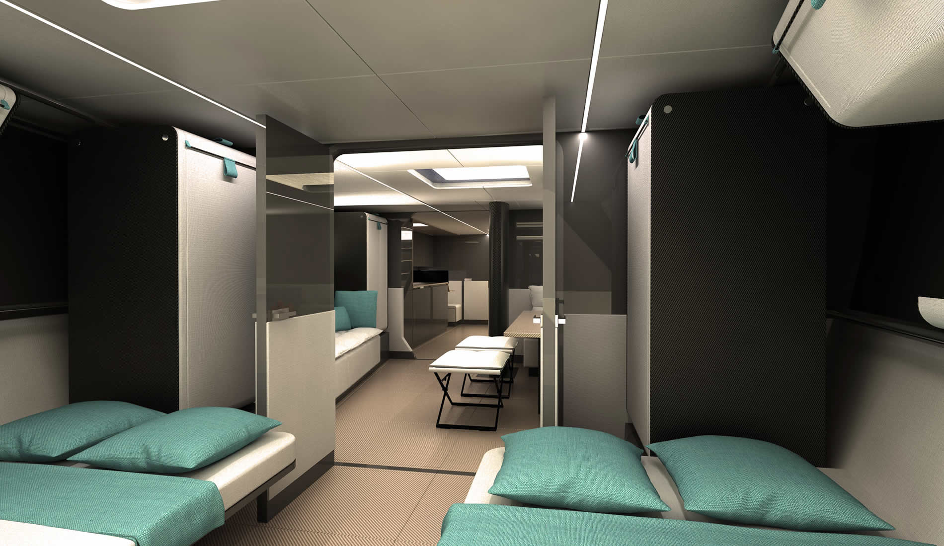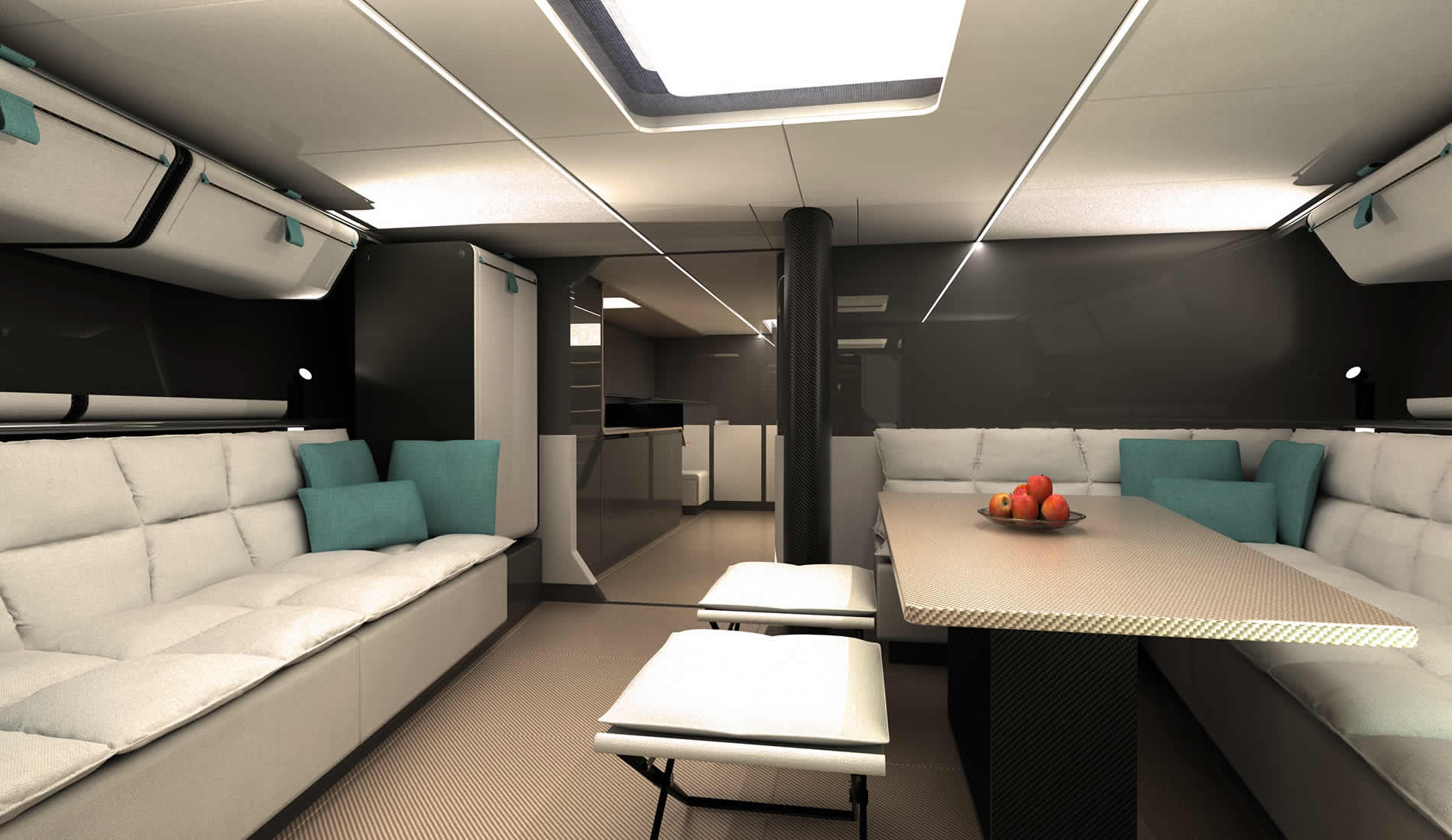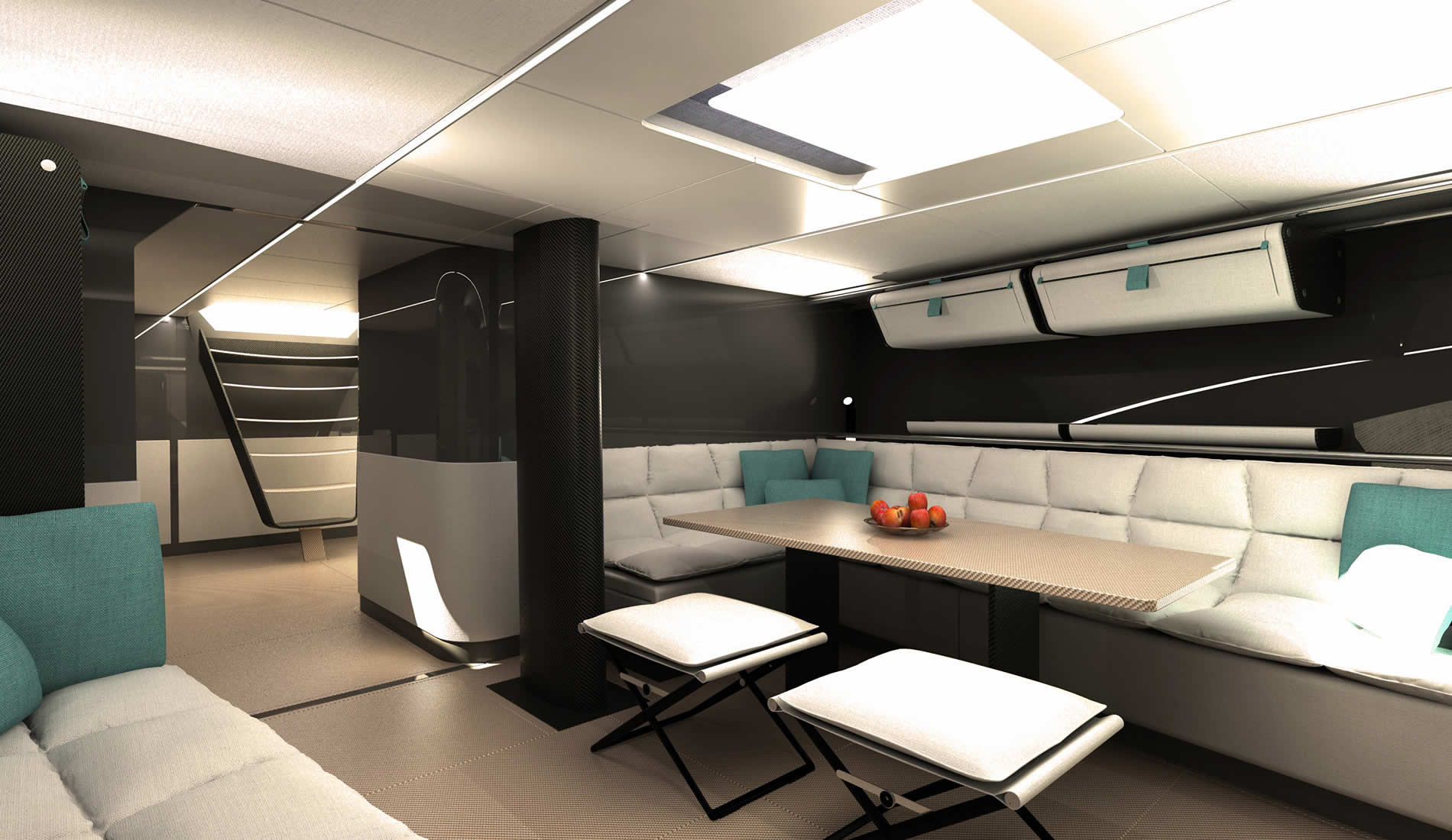 Her new interior design features hidden central cockpit and the coamings, which create a full flush look. The interior layout allows for more privacy for the owners, as the owner's area is located forward of the salon. Two guest cabins are situate aft, while the galley and crew cabin are amidships.