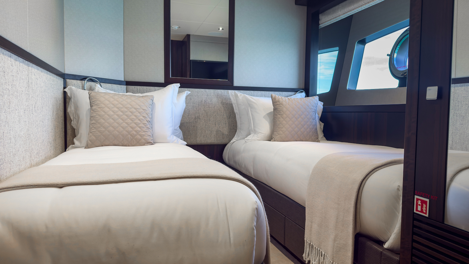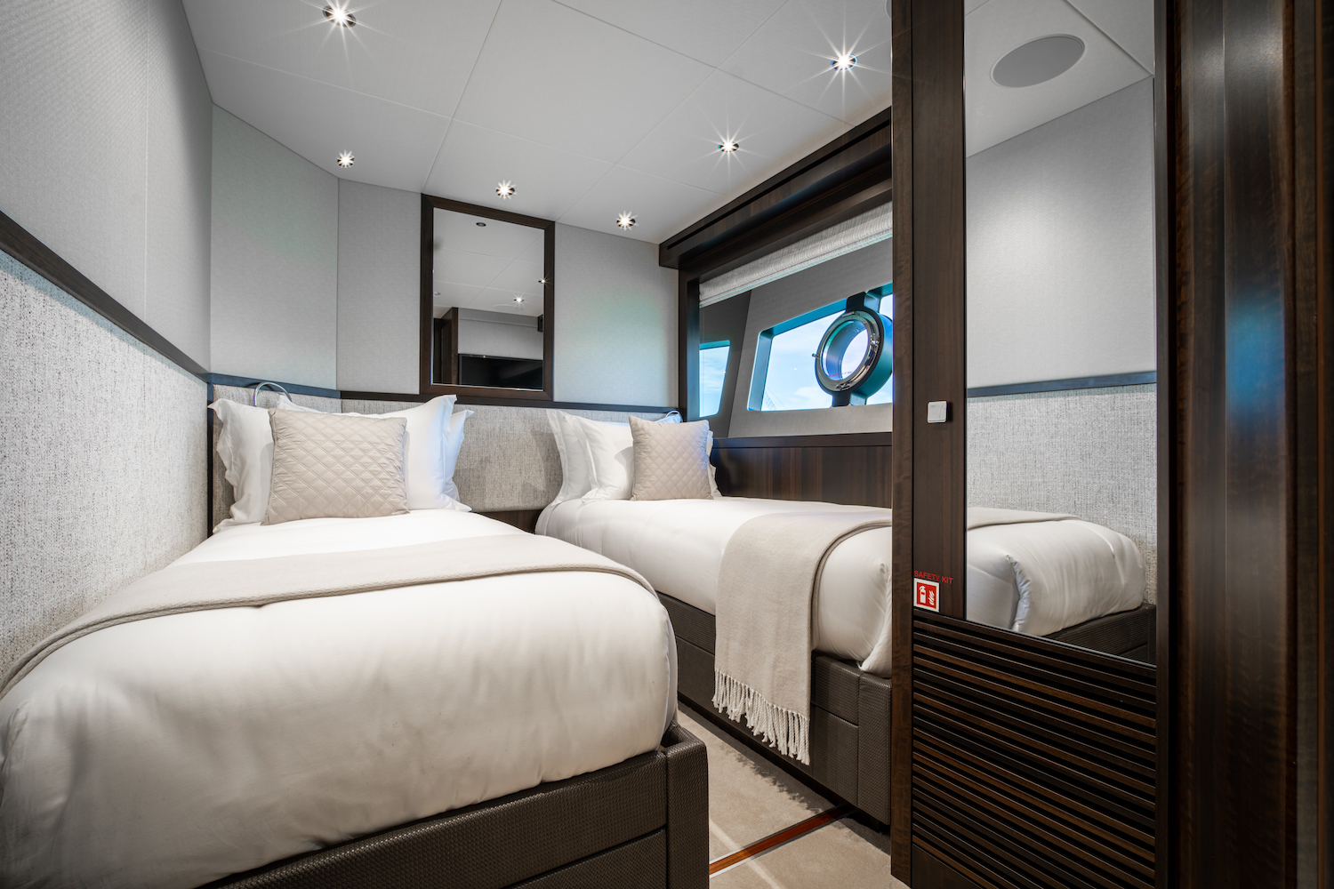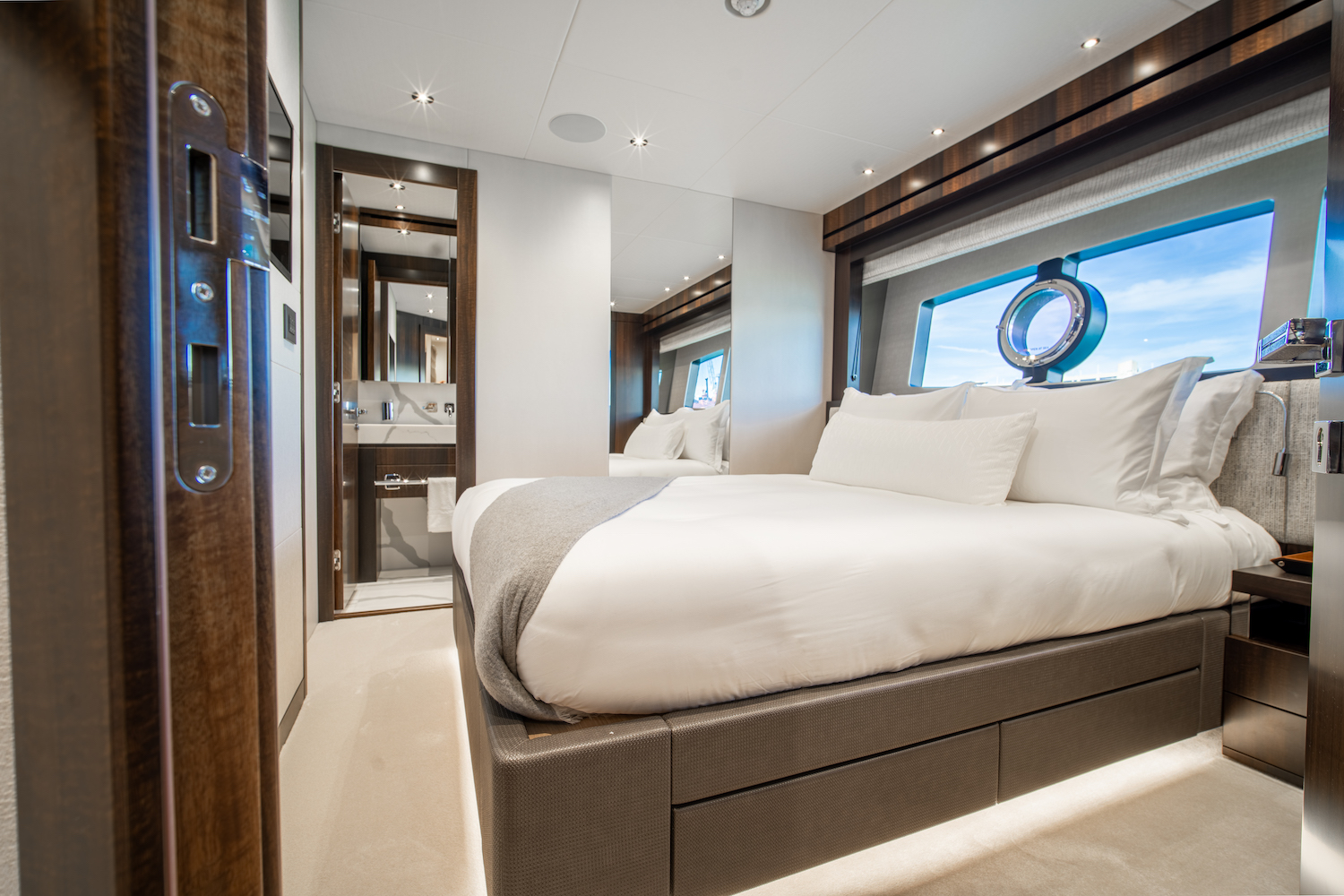 ~ Master suite: full beam, king size (or equivalent) bed, private ensuite, generous wardrobe space and ambient lighting. ~ VIP stateroom: queen size bed with ensuite bathroom. ~ 3 further guest cabins: flexible configuration accommodating twins or doubles, each with own ensuite. ~ All cabins air conditioned and finished with premium linens and refined detailing.