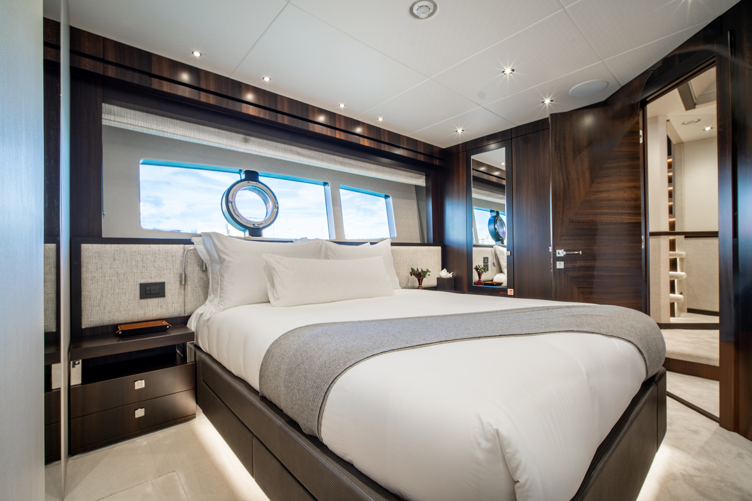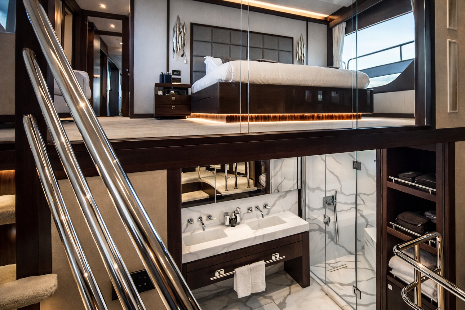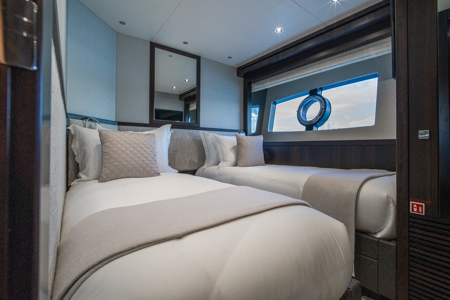 ~ Master suite: full beam, king size (or equivalent) bed, private ensuite, generous wardrobe space and ambient lighting. ~ VIP stateroom: queen size bed with ensuite bathroom. ~ 3 further guest cabins: flexible configuration accommodating twins or doubles, each with own ensuite. ~ All cabins air conditioned and finished with premium linens and refined detailing.