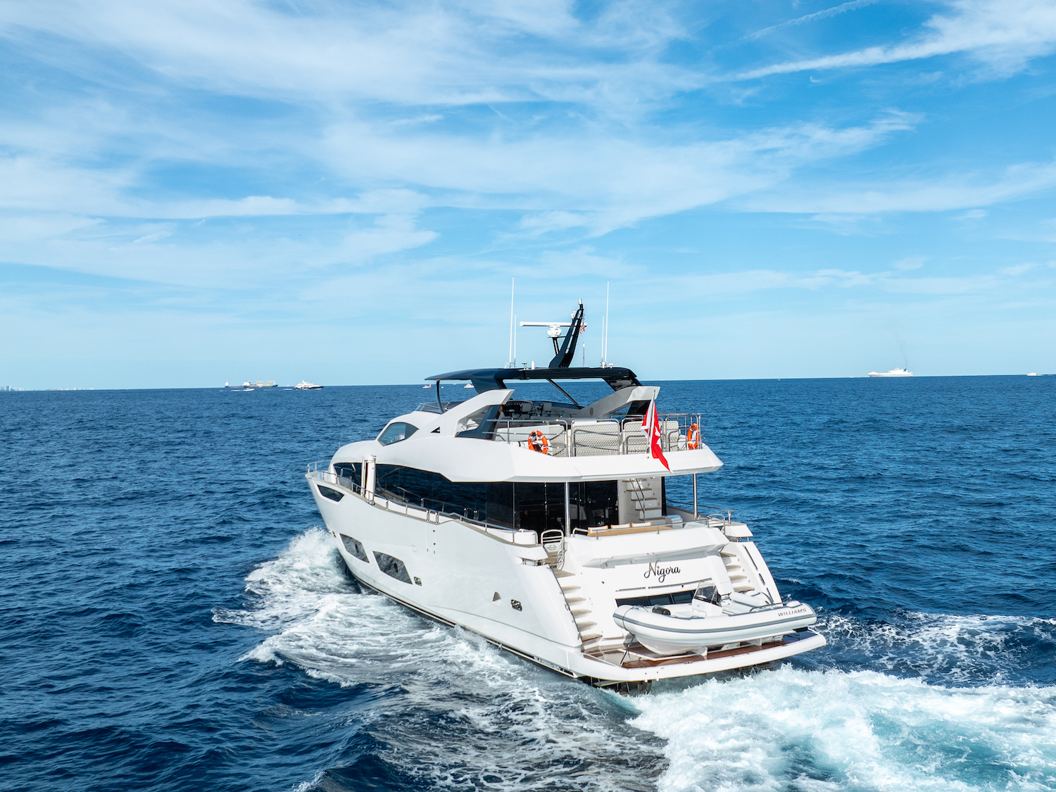 NOTABLE FEATURES OF NIGORA: ~ Five cabin guest layout allowing up to 10 guests ~ Modern interior styling with premium finishing throughout ~ Hull and superstructure built to high performance standards ~ Flybridge lounge and sun pad zones ideal for socialising ~ Wide beam of 6.55 m offering generous interior volume ~ Top speed of approximately 26 knots and cruise of 24 knots