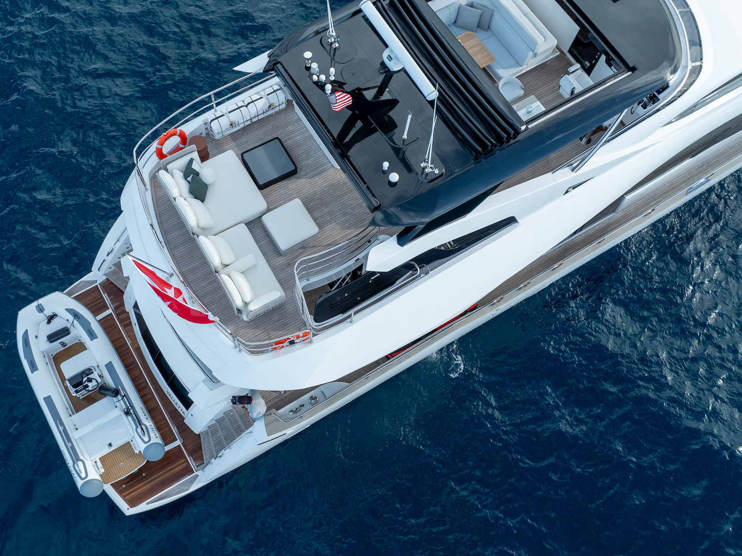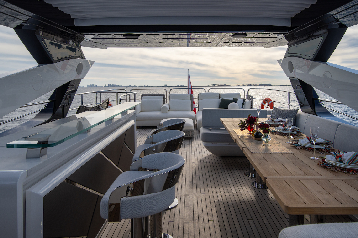 Above, the flybridge extends the social realm – featuring lounge seating, unobstructed views and space for sun soaking or evening cocktails under the stars. Built for spirited cruising yet refined enough for gentle afternoons at anchor, the yacht’s profile balances motion with comfort and the elevated pilot house grants excellent visibility underway.