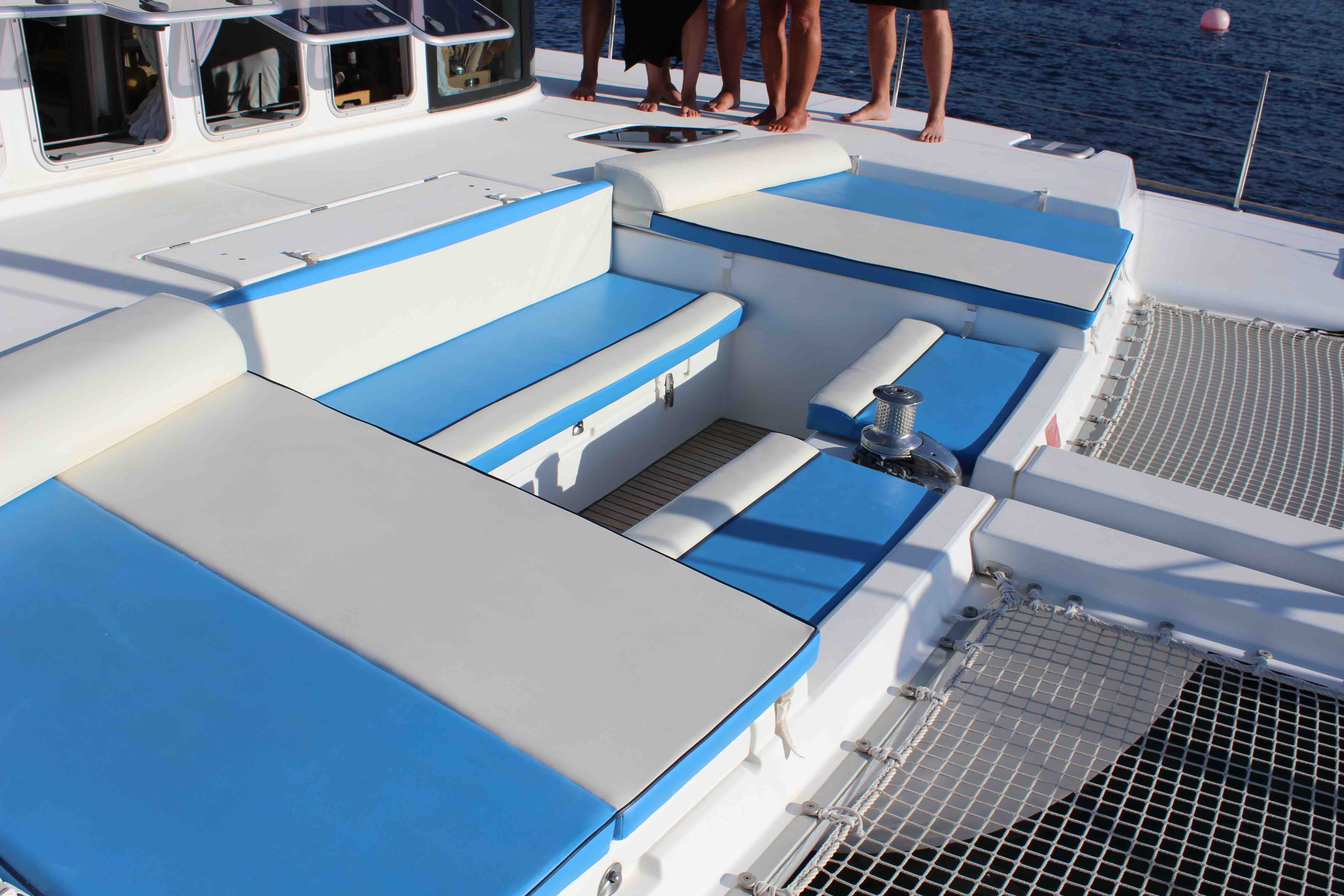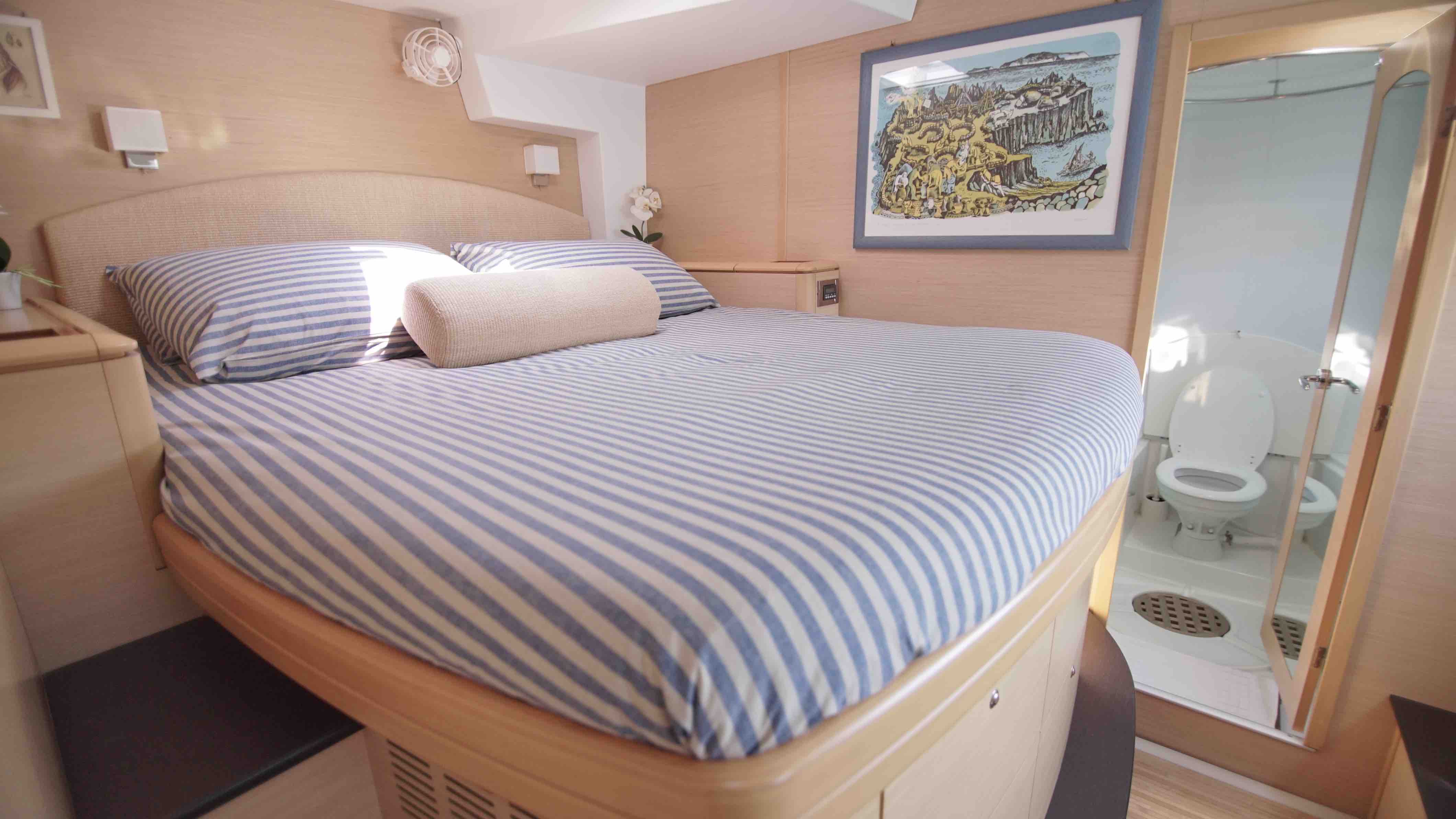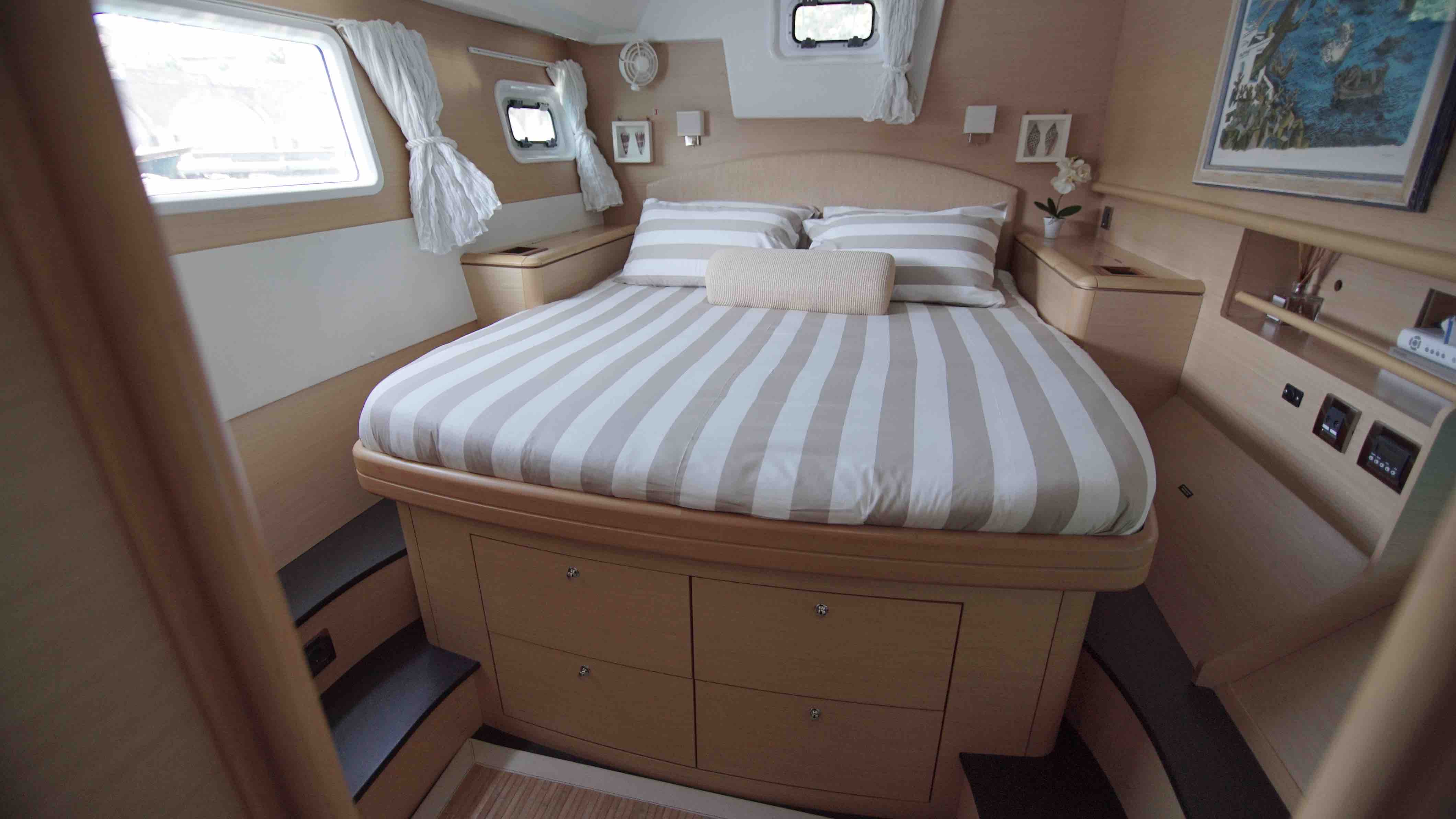 The Lagoon 500 OMBRE BLU is equipped for all weather conditions with spacious dining inside and out and full air-conditioning. This luxurious sailing yacht has a very social forward cockpit with alfresco seating for dining and full views forward. One of the highlights of the Lagoon 500 is the helm station on the flybridge. This is a superb additional space with access from each side and a long six-seater bench.