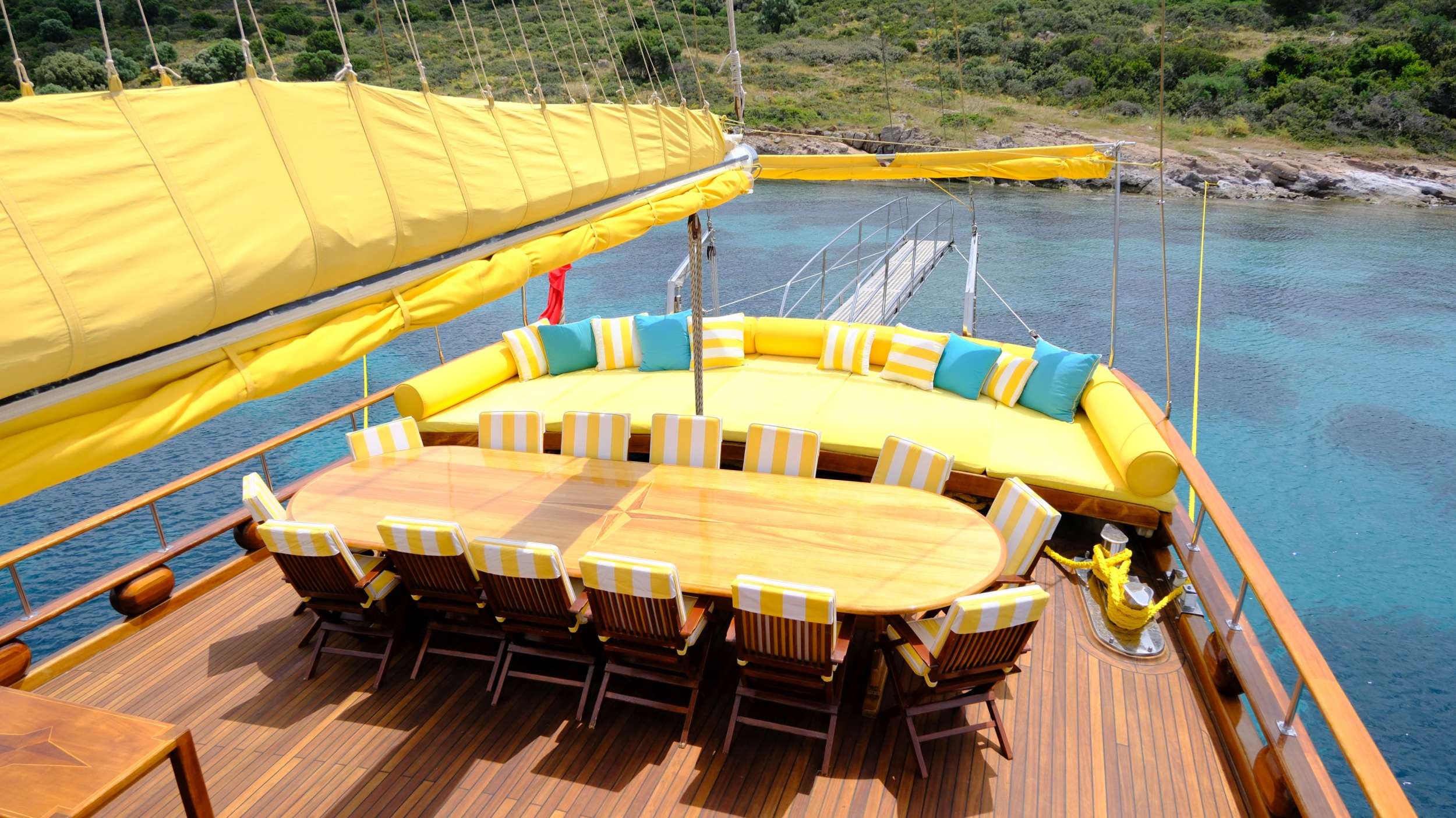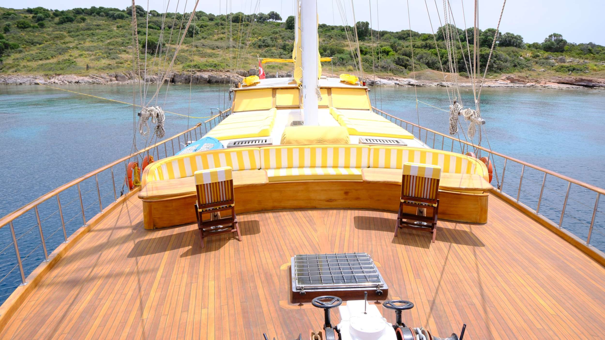 Forward of the deck, large sunbeds and lounging zones allow guests to stretch out with a view of the horizon. Retractable awnings and canvas canopies offer shaded retreats during the midday heat, while open segments let the sea breeze flow freely.