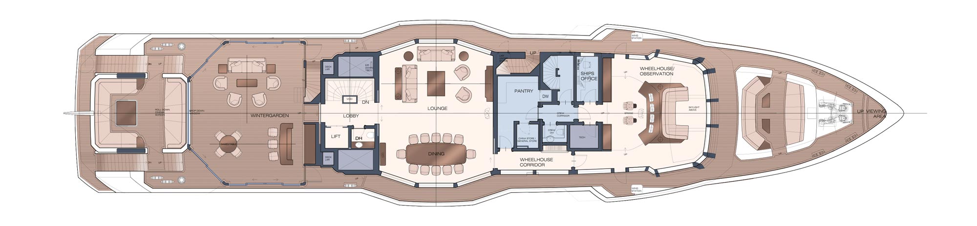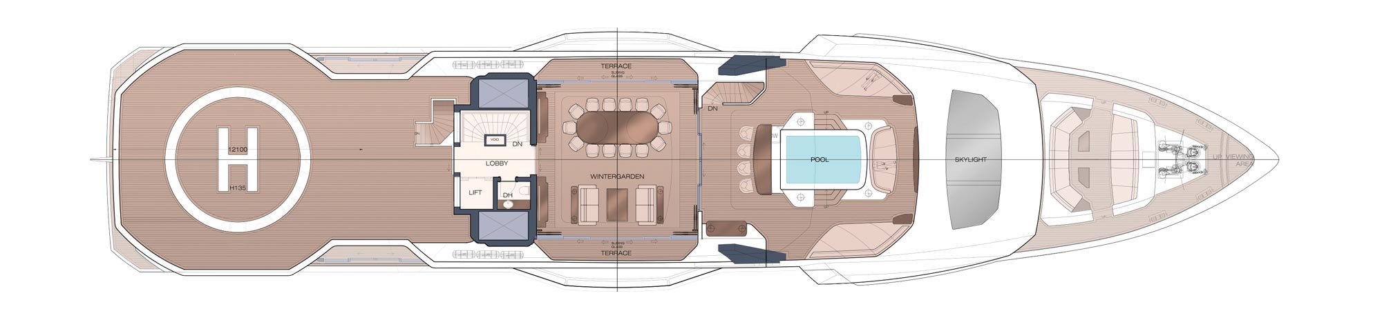 Located above the central staircase, the skylight illuminates the indoor areas spreading the light across the indoor living areas. The second winter garden is placed next to the dining area on the main deck.