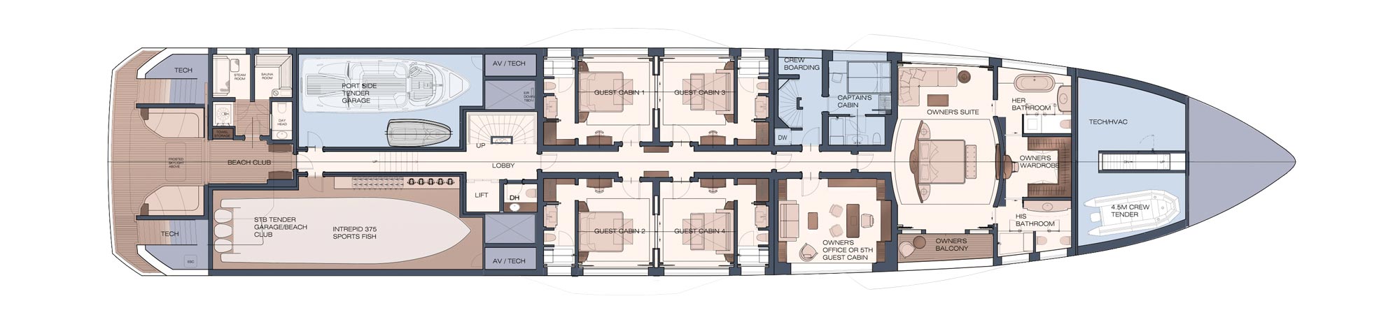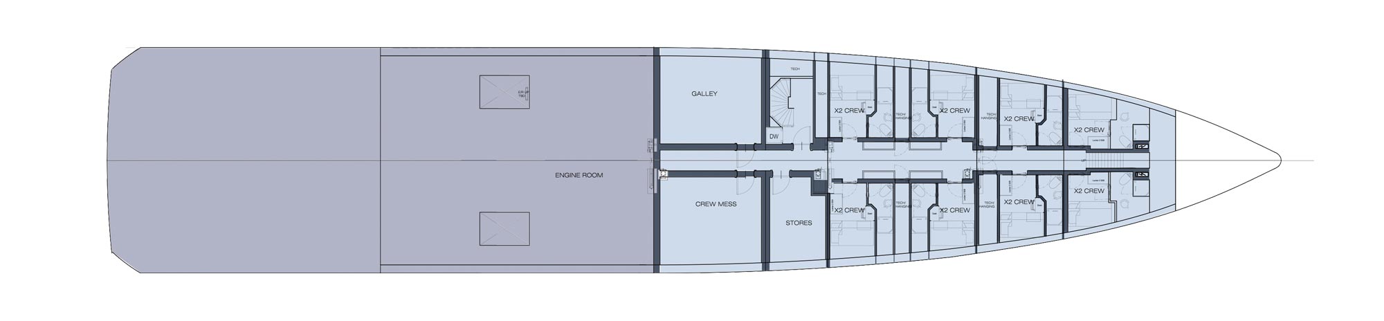 The main deck hosts all guest and owner stateroom. Four double guest cabins are located amidship and have their own ensuite facilities. The fifth guest cabin is convertible into an office or meeting room. The owner's stateroom has a full-beam size and is place forward. It features his and her bathrooms, a spacious seating area and a balcony.