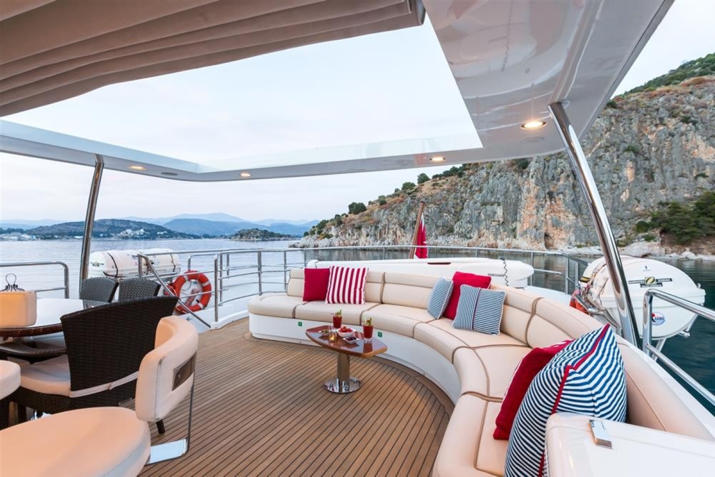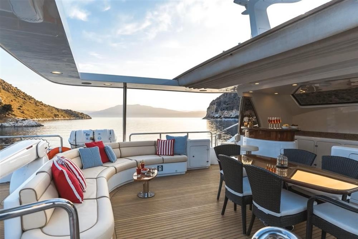 Exterior living aboard the luxury motor yacht REBECCA V is generous, ideal for relaxing or entertaining. The aft deck is adjacent to the salon and boasts plenty of seating and an alfresco dining table. A full-beam extended swim platform provides effortless water access. Above the main deck, the sundeck is partially shaded and features an alfresco dining table, casual cocktail table with seating, wet bar with fitted barstools and a massive sunpad.
