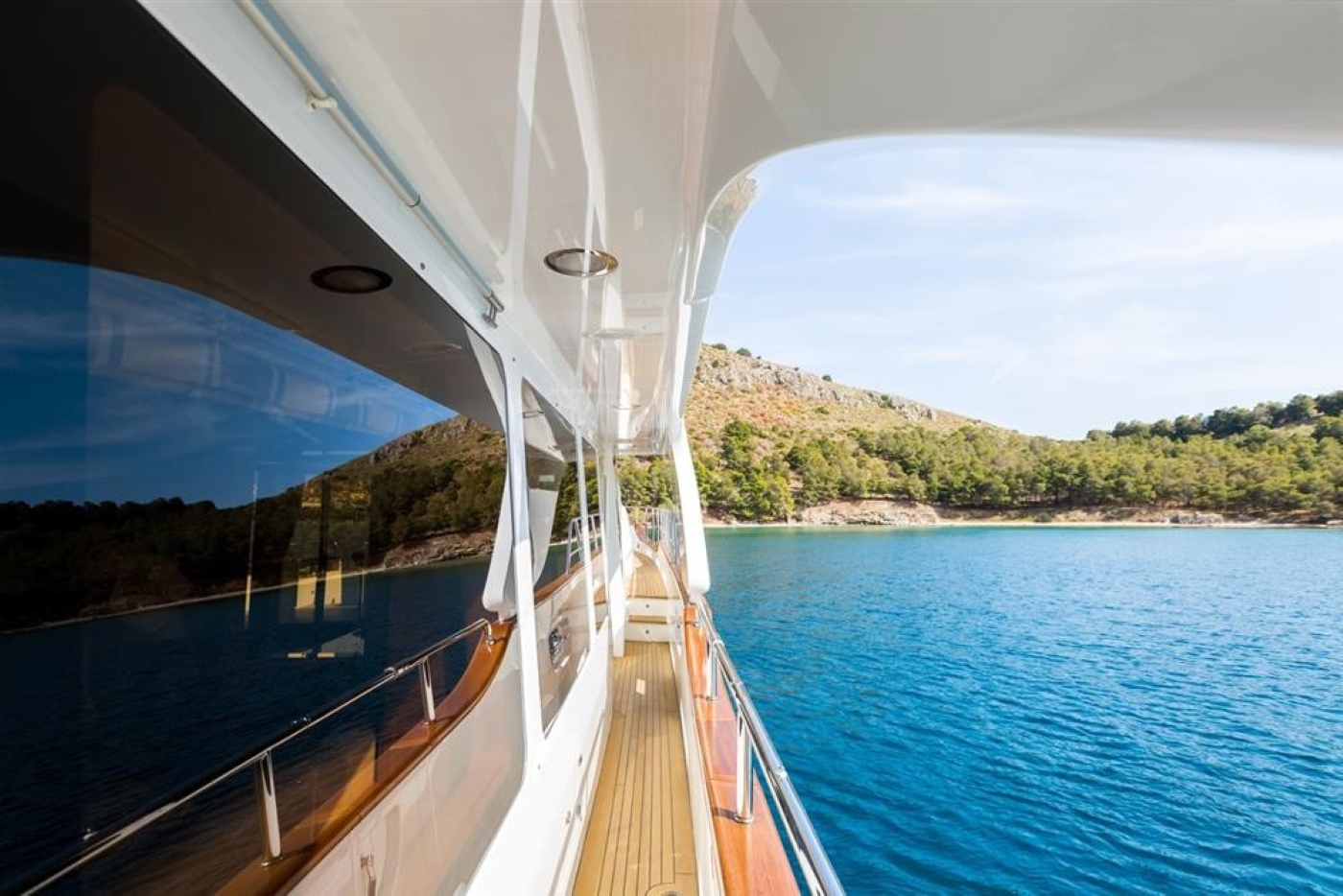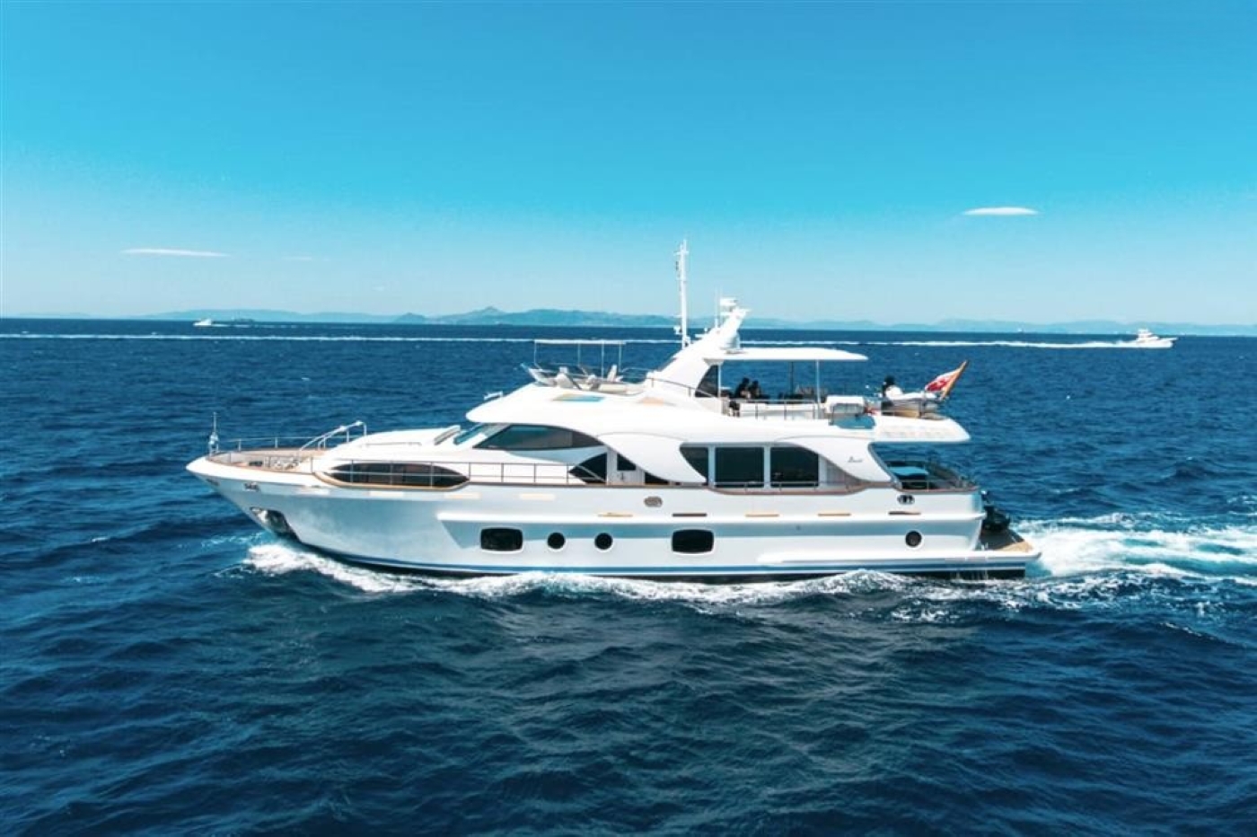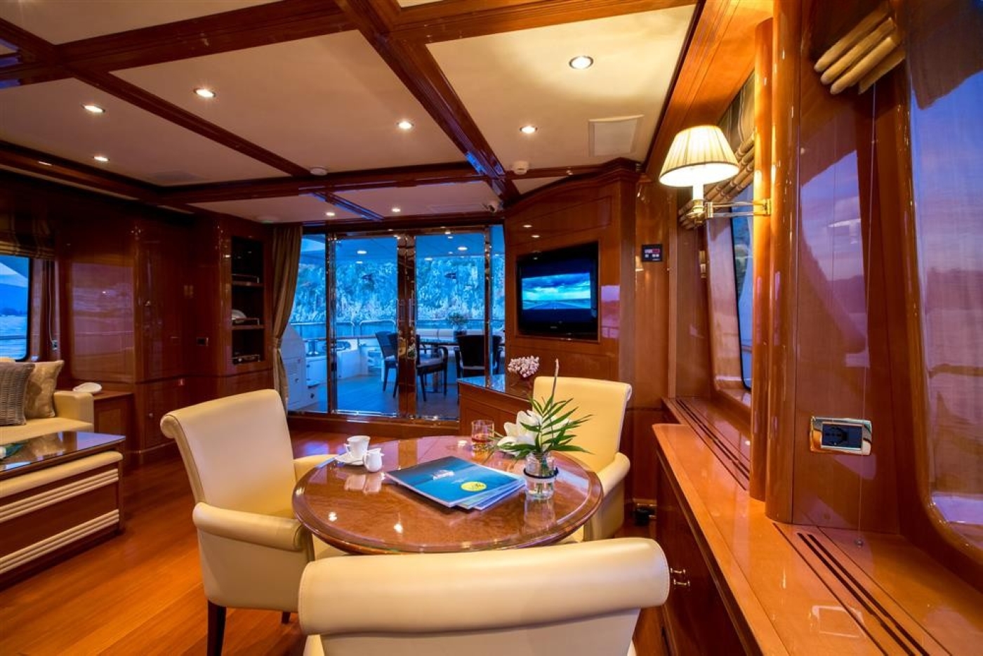 Motor yacht REBECCA V features a minimalistic interior décor, boasting warm woods, fine marbles and quality furnishings throughout. The salon and dining are an open plan, with the lounge and entertainment centre aft and formal dining forward. Panoramic windows fill the space with natural light and create an airy ambience. Aft of the salon is a shaded aft deck, with alfresco dining. Forward of the salon, is the raised pilothouse, followed by a full beam master suite.