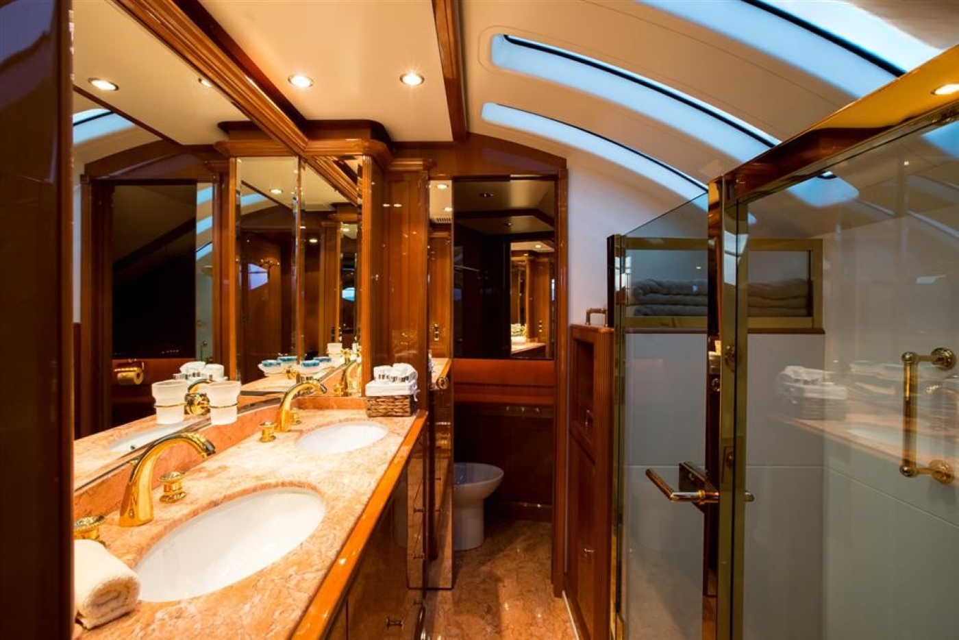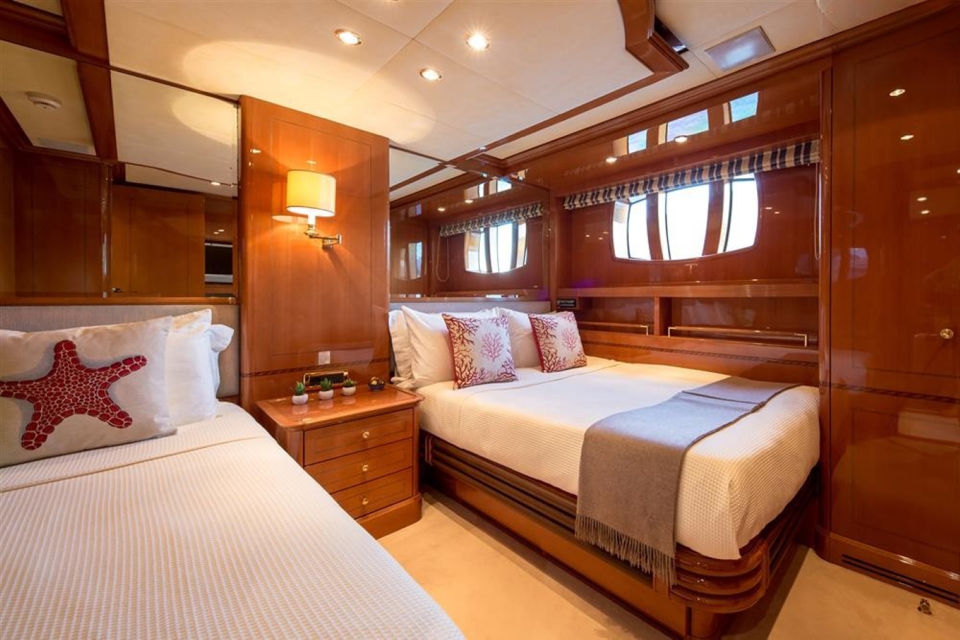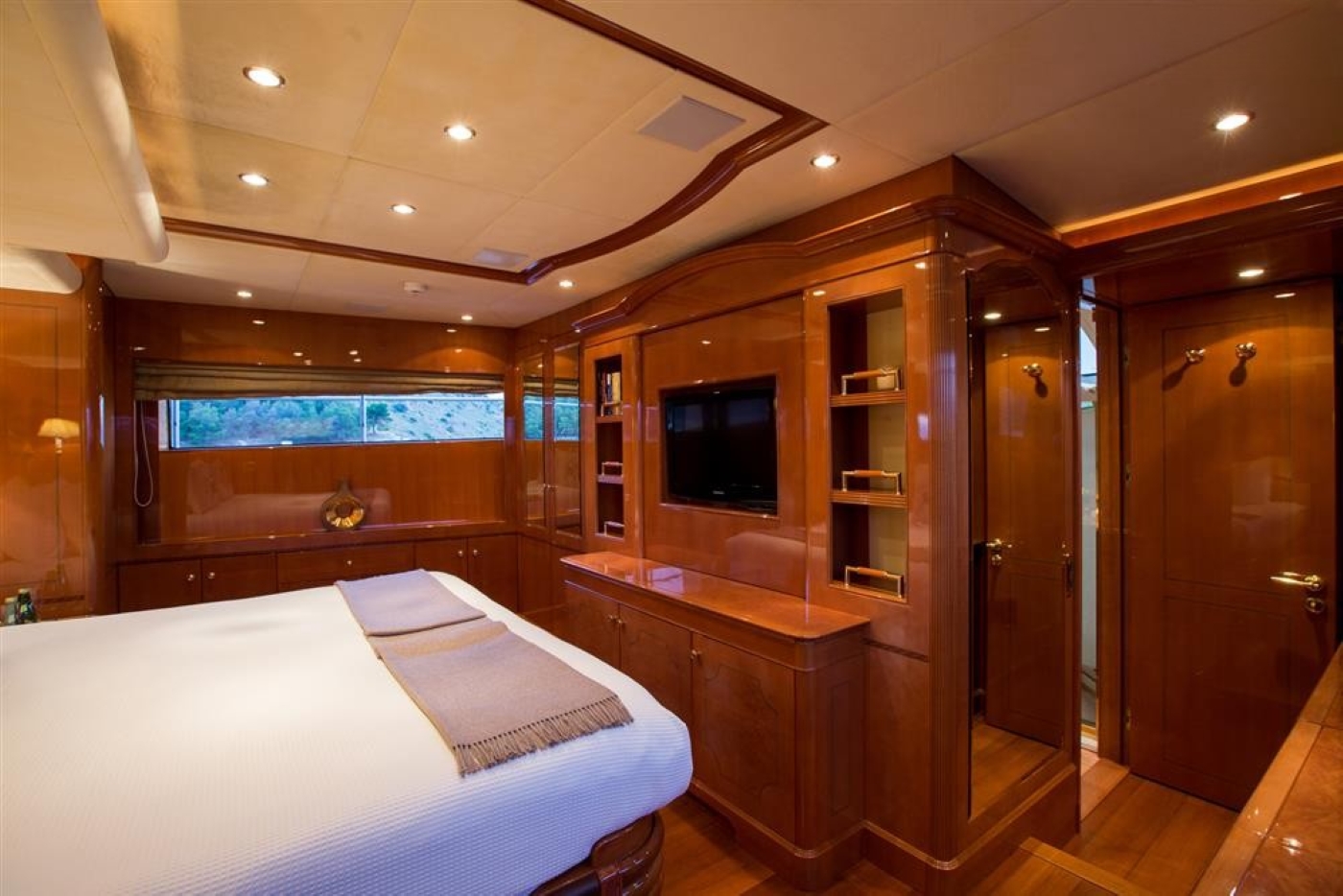 REBECCA V accommodates 10 guests in 4 en-suite cabins. Each cabin boasts full entertainment systems and individual air conditioning controls. The Master cabin is forward on the main deck, with a centre lined queen size bed, vanity and sofa. The VIP stateroom is full beam of the yacht, below decks and features a centre lined king size bed, sofa and vanity. A further 2 double cabins are below decks and offer double beds and a single berth each.