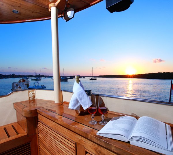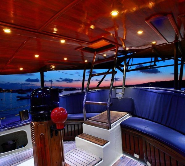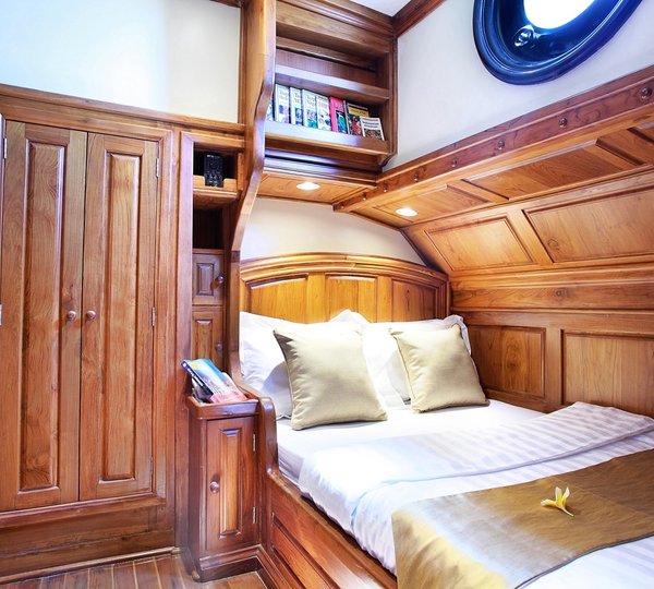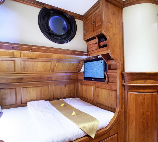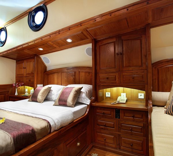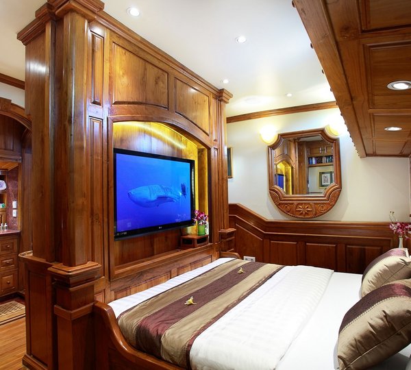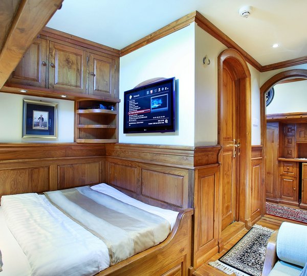 Her interior décor is elegant, finished in traditional teak paneling and timeless furnishings. The salon is on the lower deck with a relaxed atmosphere, guests can lounge on the sofa, play a board game, watch movies and listen to music, all while enjoying a tasty beverage from the bar. Accommodation is also on the lower deck, including 1 full beam master suite, 2 double cabins with sofas and one double cabin with double bed. All 4 cabins are en-suite, boast individual air conditioning systems and full entertainment facilities. On the upper main deck is the formal dining space, complete with a large table for 8 guests, as well as panoramic windows, ensuring optimum views.