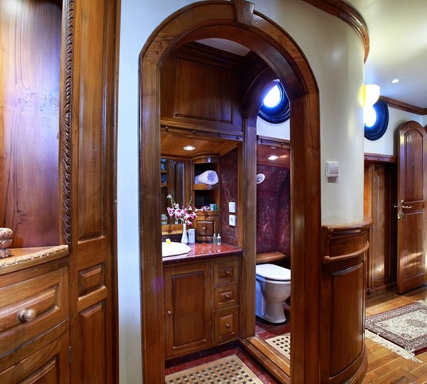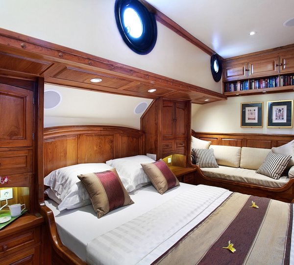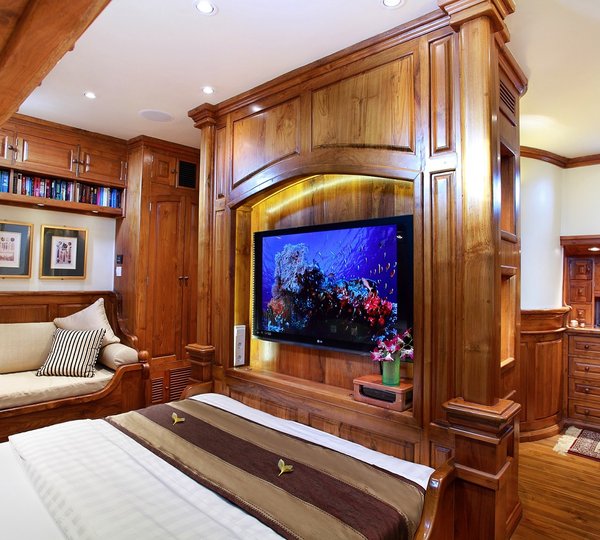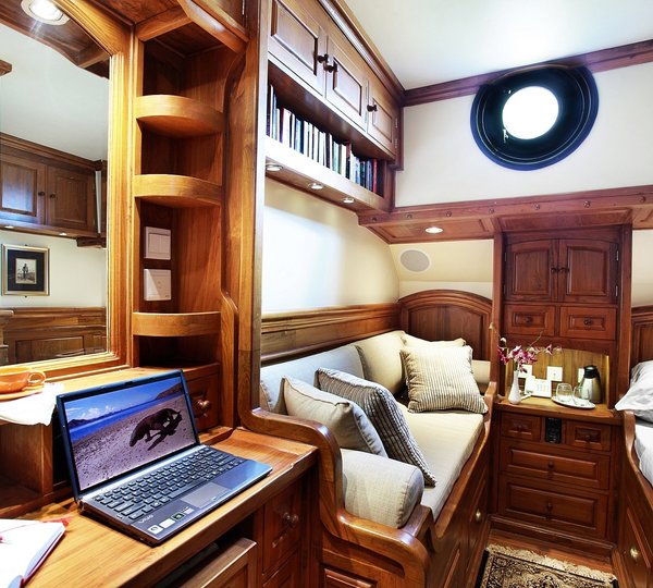 Accommodation is provided for 8 charter guests, in 4 cabins. The master cabin is full beam of the yacht, with a queen size bed, desk, sofa, large ensuite bathroom with marble finished shower and his and hers sinks and head. Two guest cabins each have double beds and a sofa, as well as marble shower room with head. The 4th cabin offers a double bed and marble shower room with head.