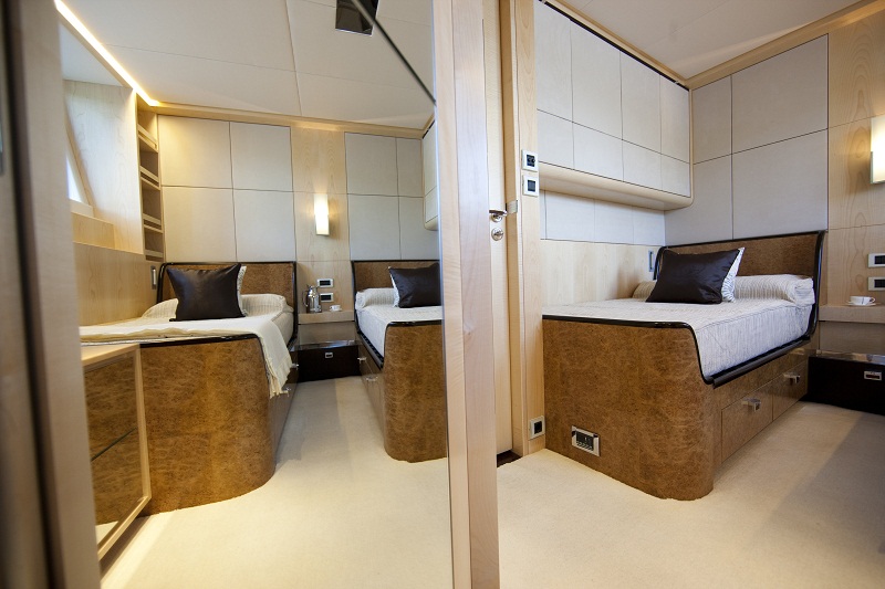 The interior by Javier Muñoz consists of contemporary styling, with neutral cream leather and upholstery balanced by hand crafted features in a mixture of mixture of sycamore, grey tinted zebrano with further accents of olive and panga woods. This enhances the feeling of space and luxury complementary to the natural light that permeates the vessel.