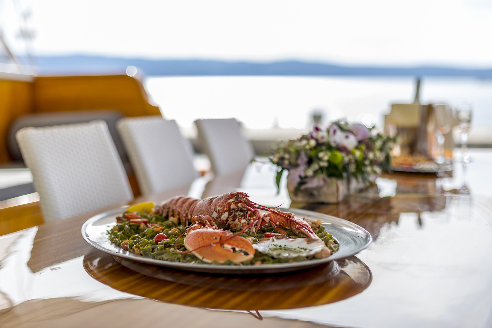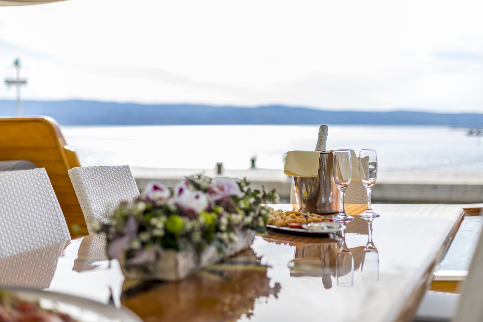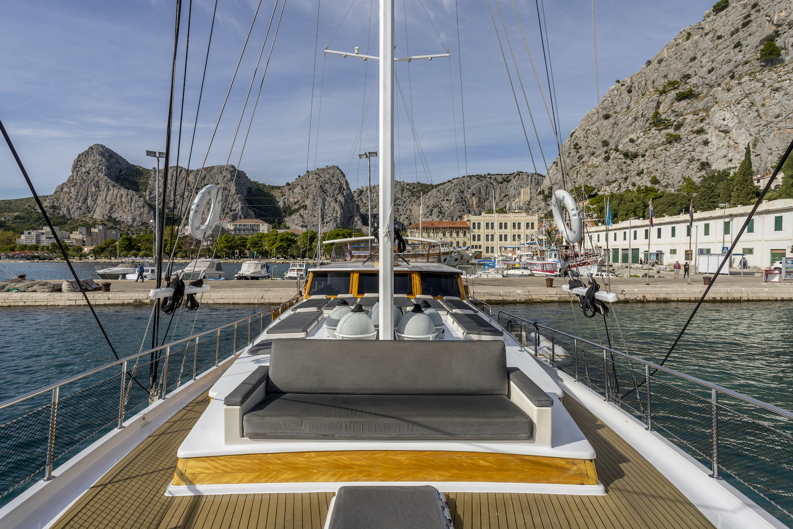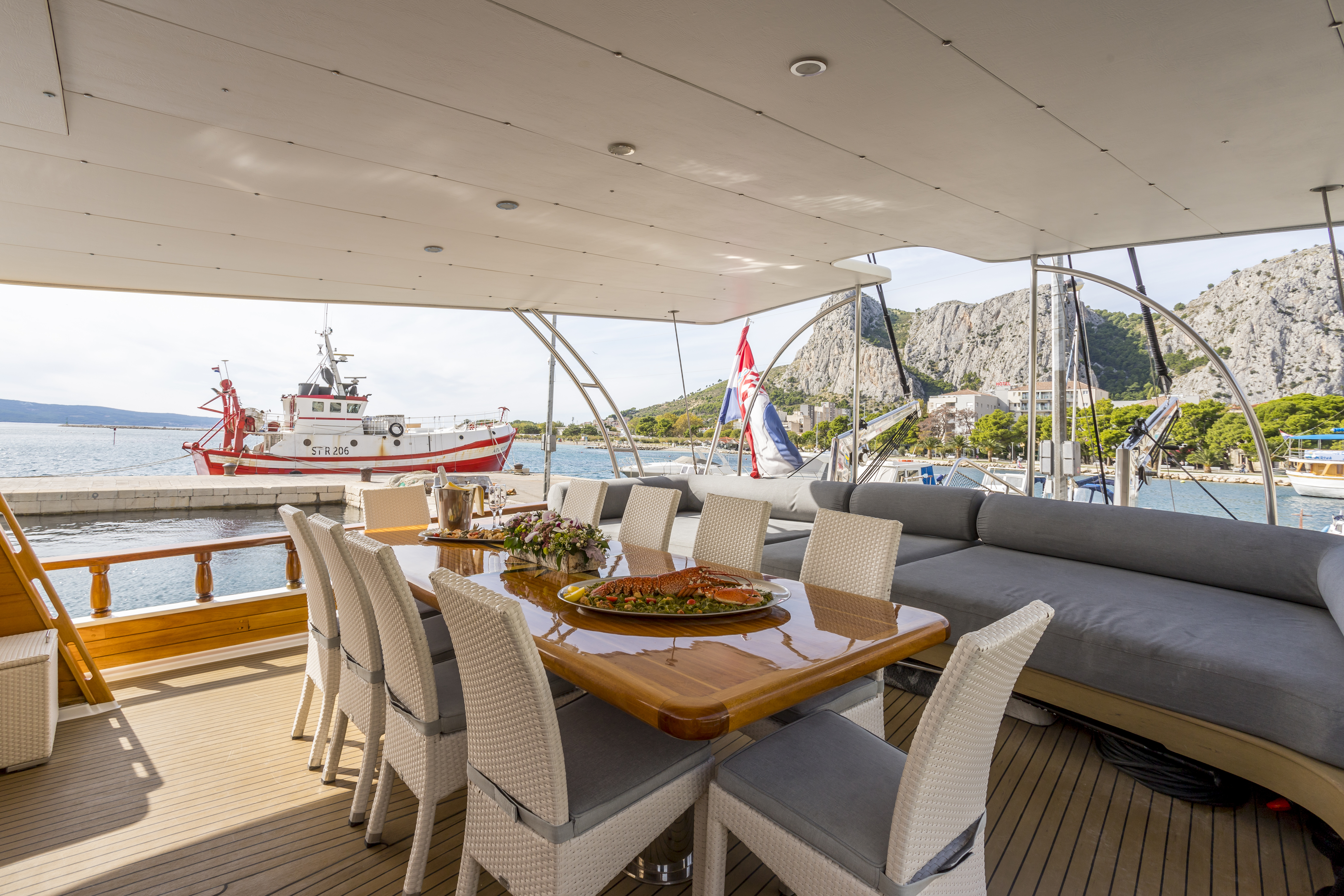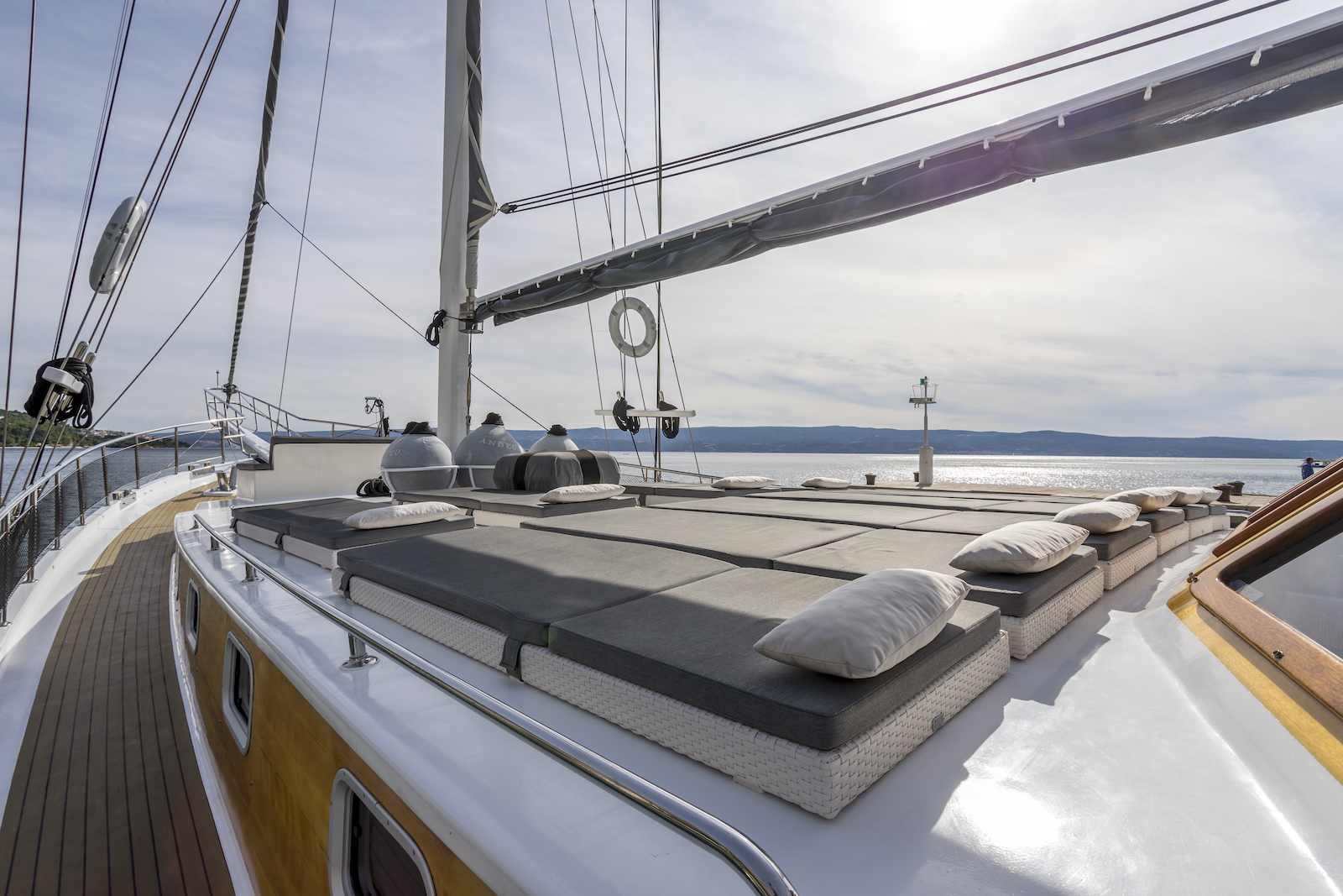 On deck charter yacht ANDEO provides ample deck space, her aft deck has an shaded alfresco dining option and full beam cushioned seating behind, while her foredeck offers large individual sunpads on a raised sundeck.