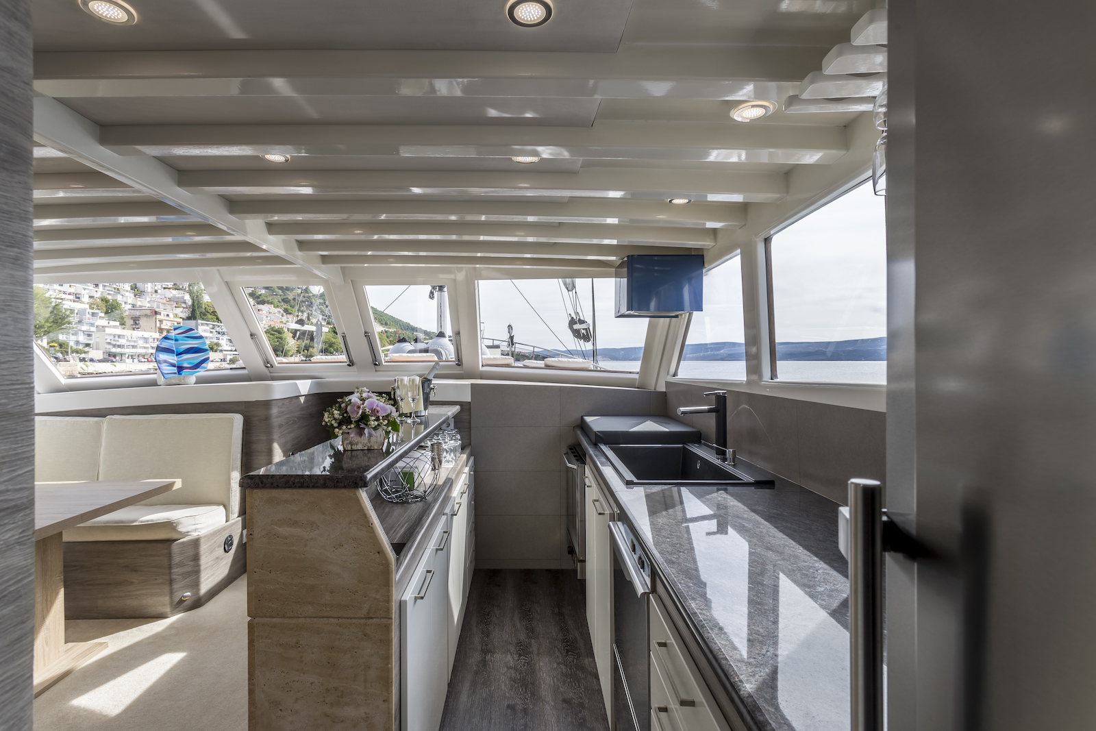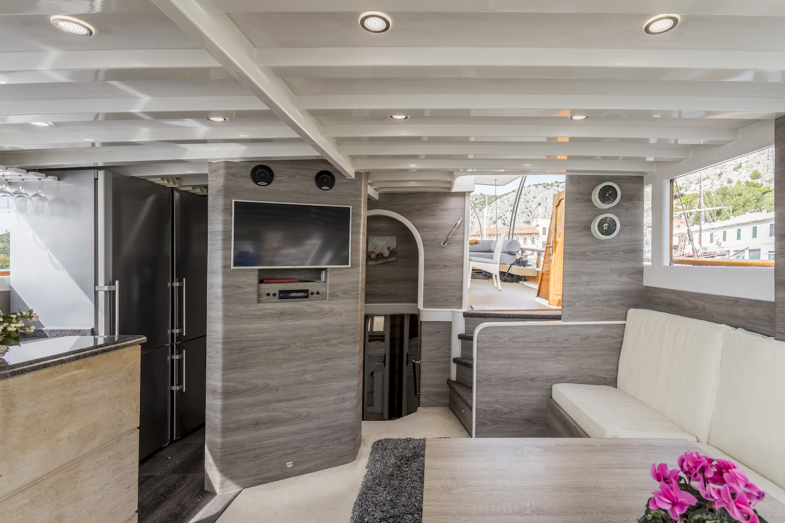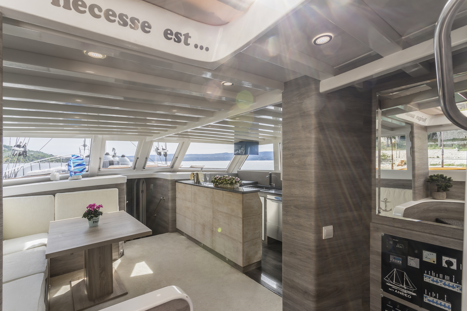 S/Y ANDJEO boasts a warm and inviting interior with a lovely contrast of quality teak and mahogany woods with a high gloss finish. The salon offers a light and airy environment with large windows, a full length solid wood table for 10 guests on the starboard side, plus a marble top bar and a flat screen TV; On the port side is the open immaculate galley with marble work tops.