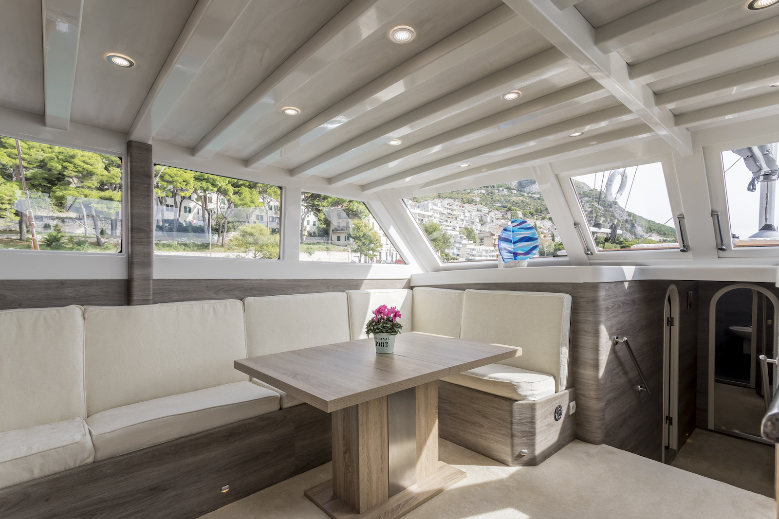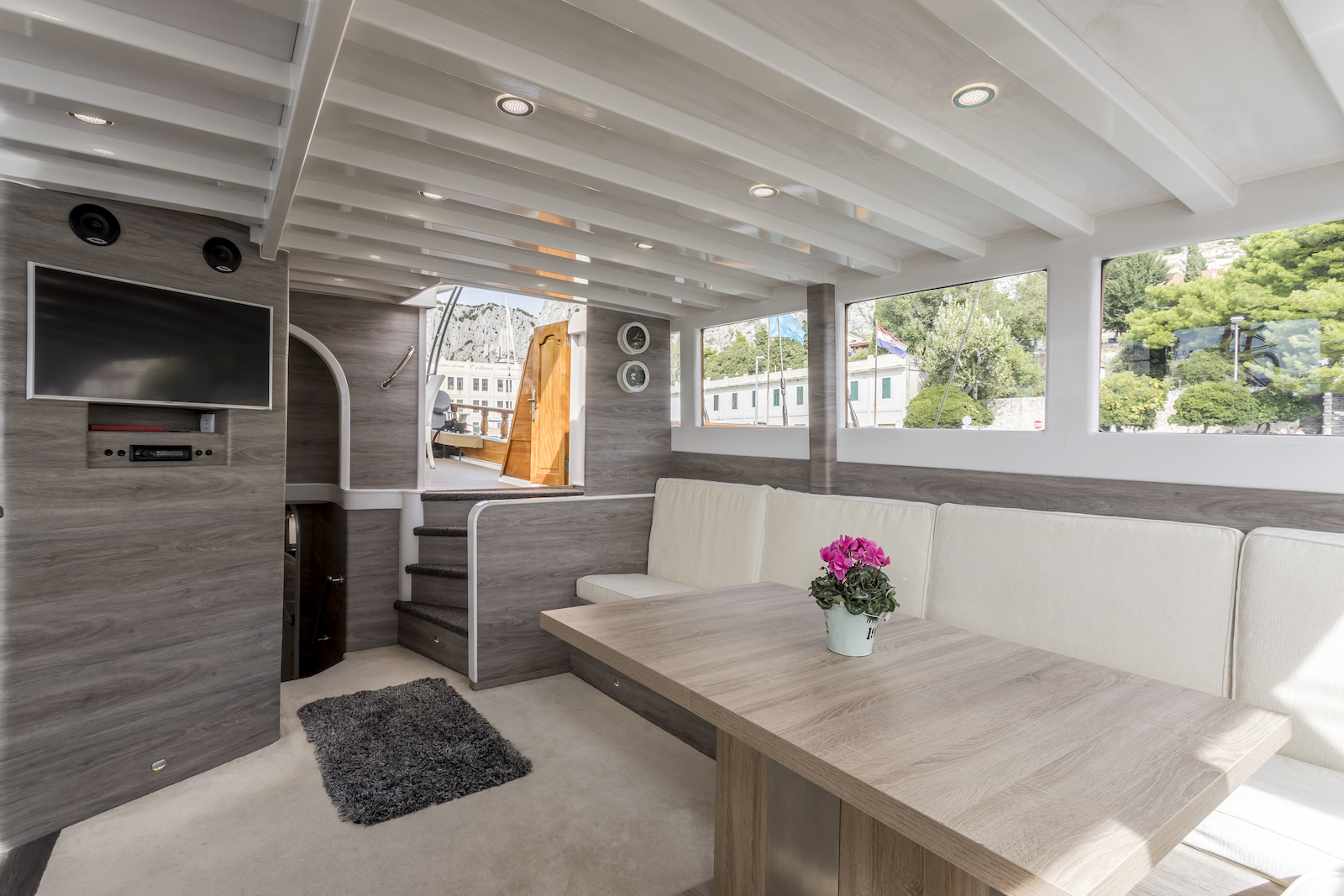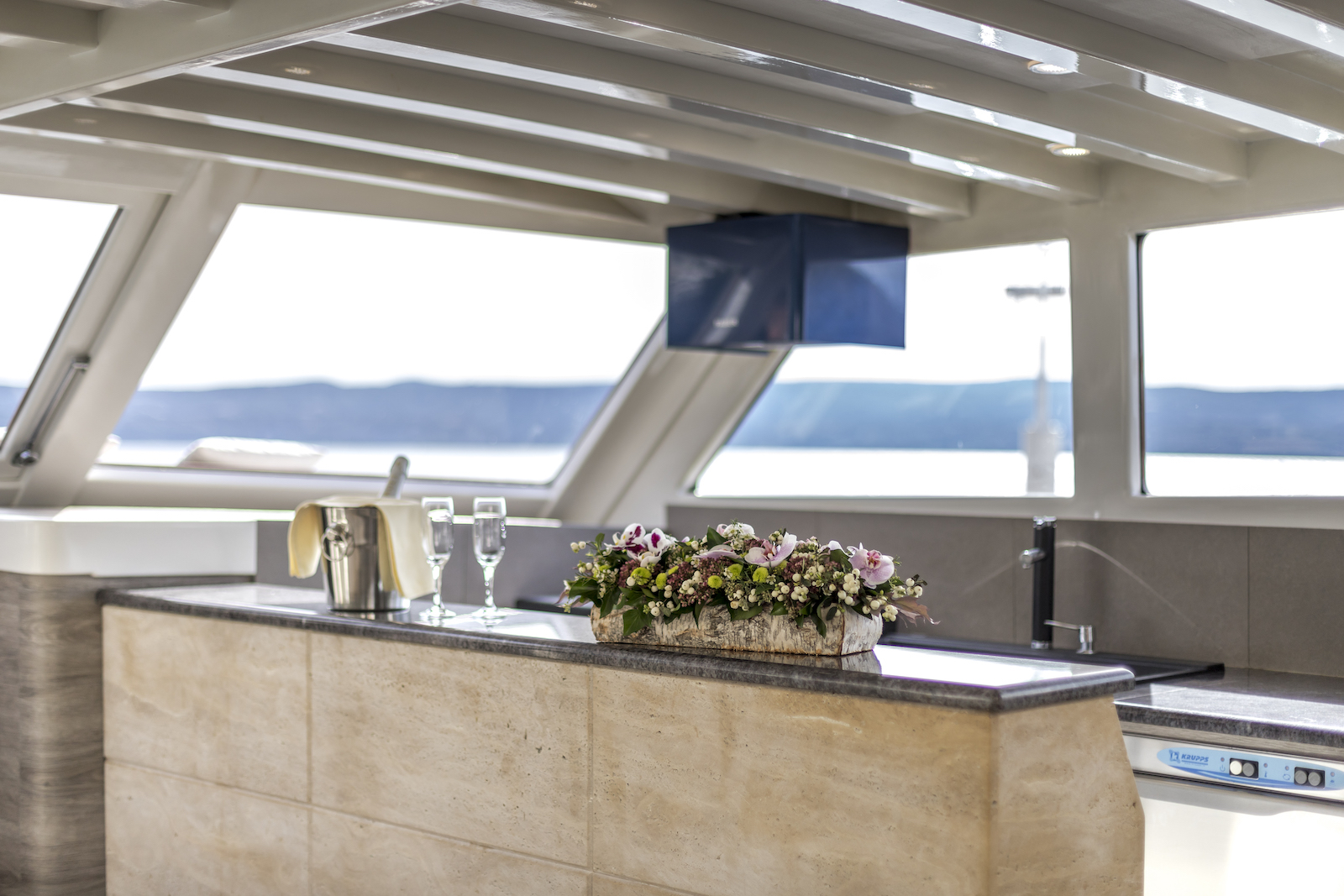 S/Y ANDJEO boasts a warm and inviting interior with a lovely contrast of quality teak and mahogany woods with a high gloss finish. The salon offers a light and airy environment with large windows, a full length solid wood table for 10 guests on the starboard side, plus a marble top bar and a flat screen TV; On the port side is the open immaculate galley with marble work tops.