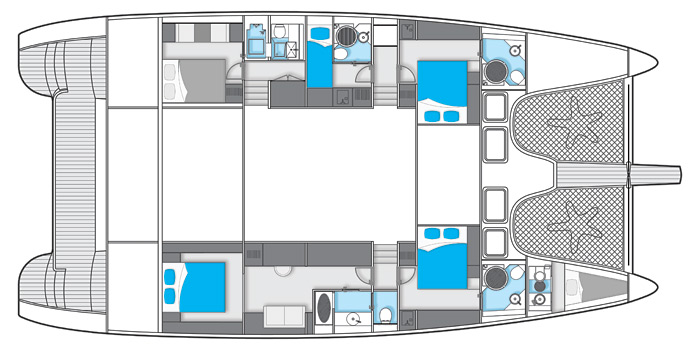 Sunreef luxury yacht ANINI accommodates 8 guests in the master suite and one guest cabin in the portside hull and two guests (one with bunk beds) with one crew cabin for 3 crew members in the starboard hull.